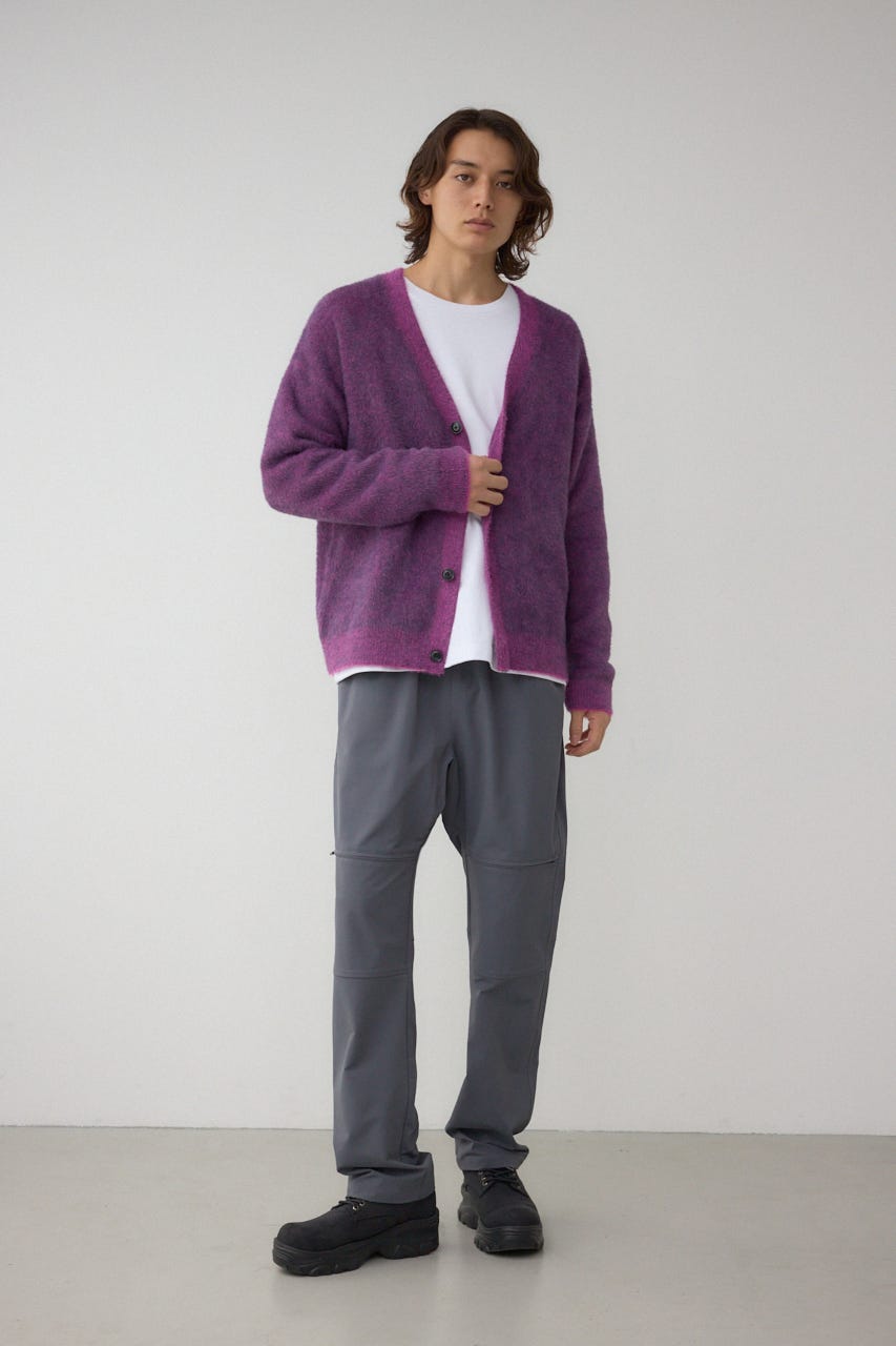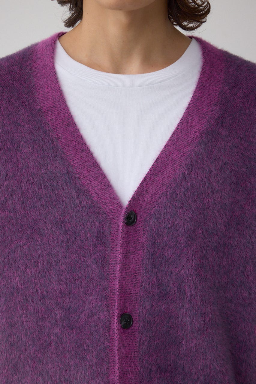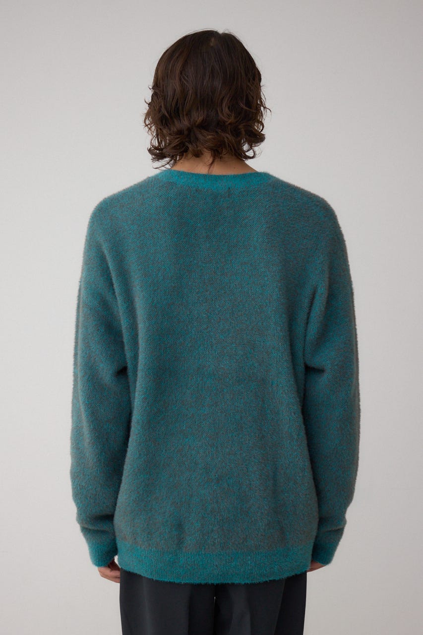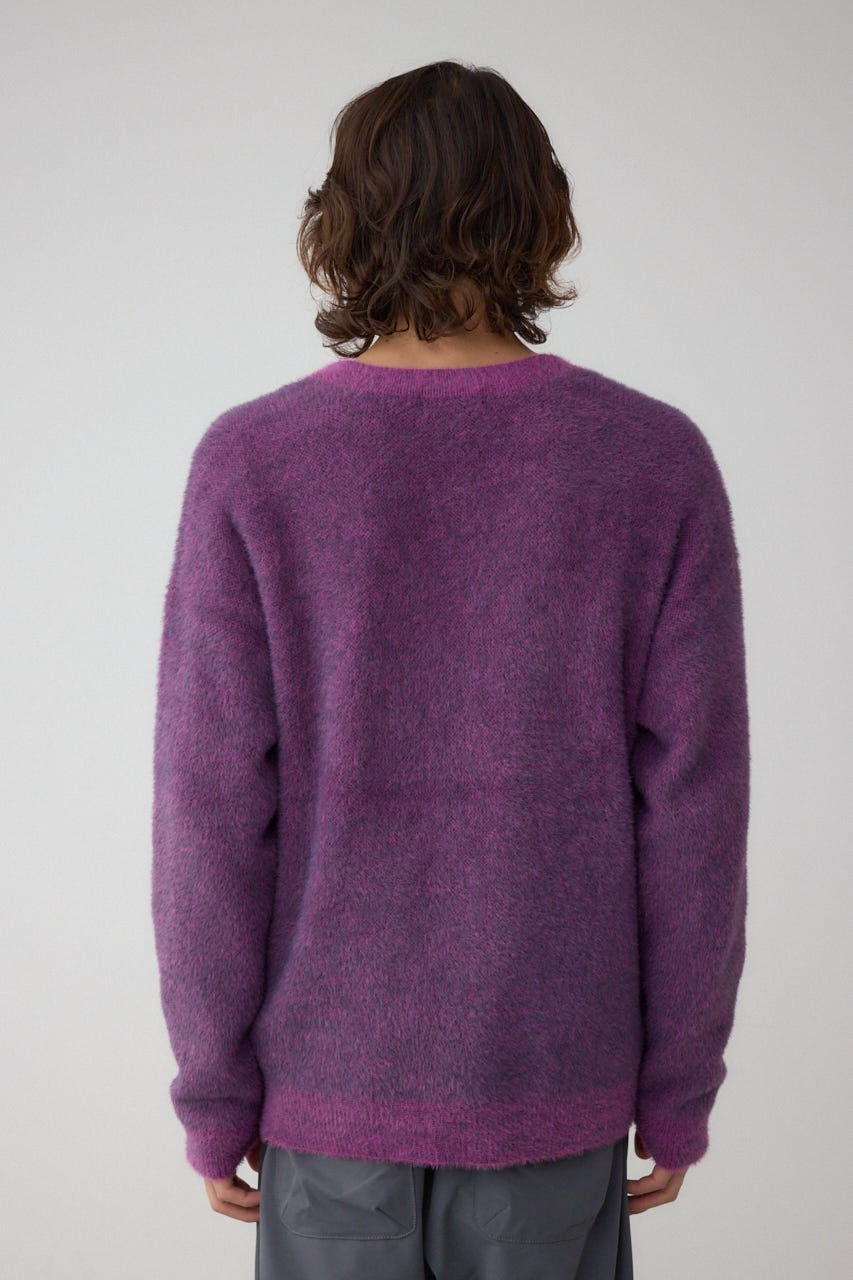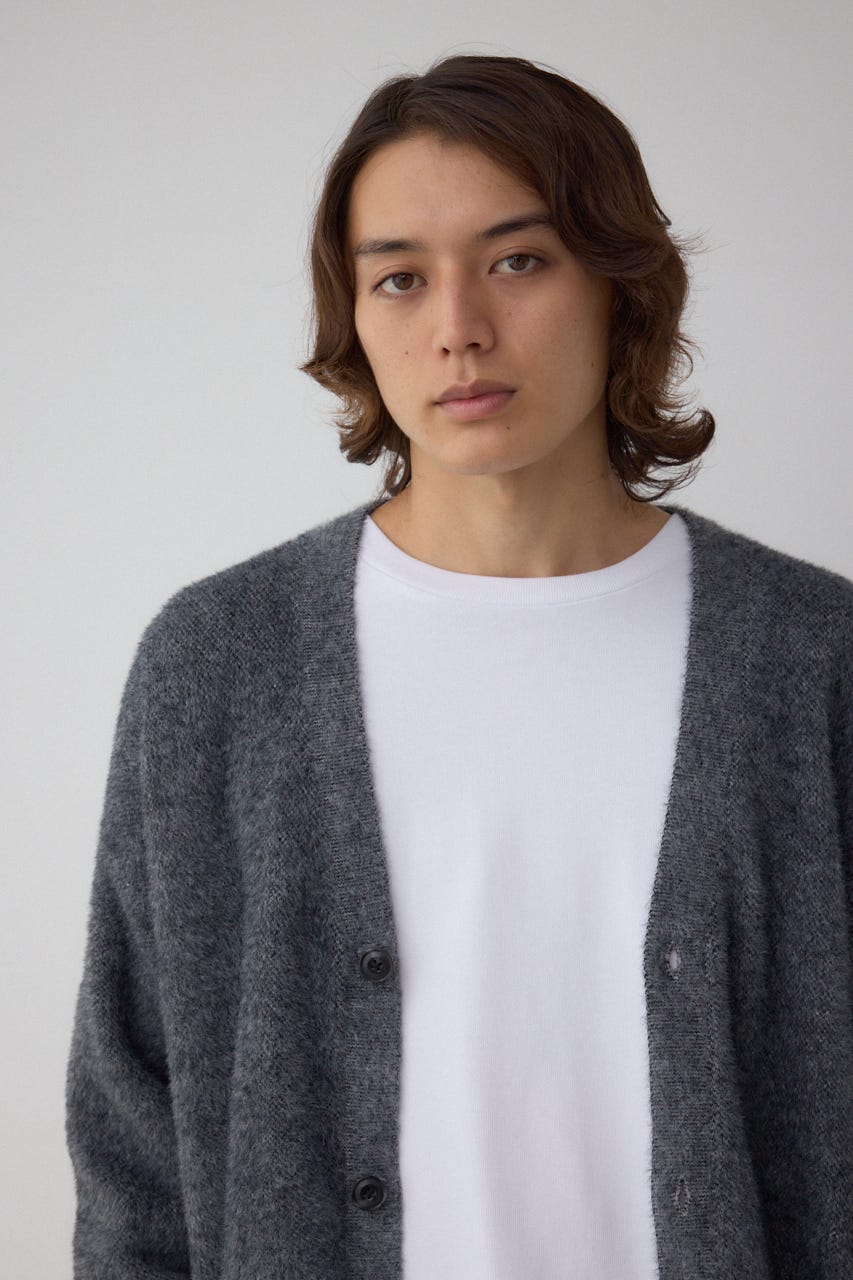 毛足のあるシャギー糸でツイード調の配色ジャガードを表現した暖かみのあるカーディガンです。
