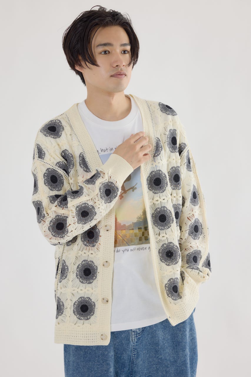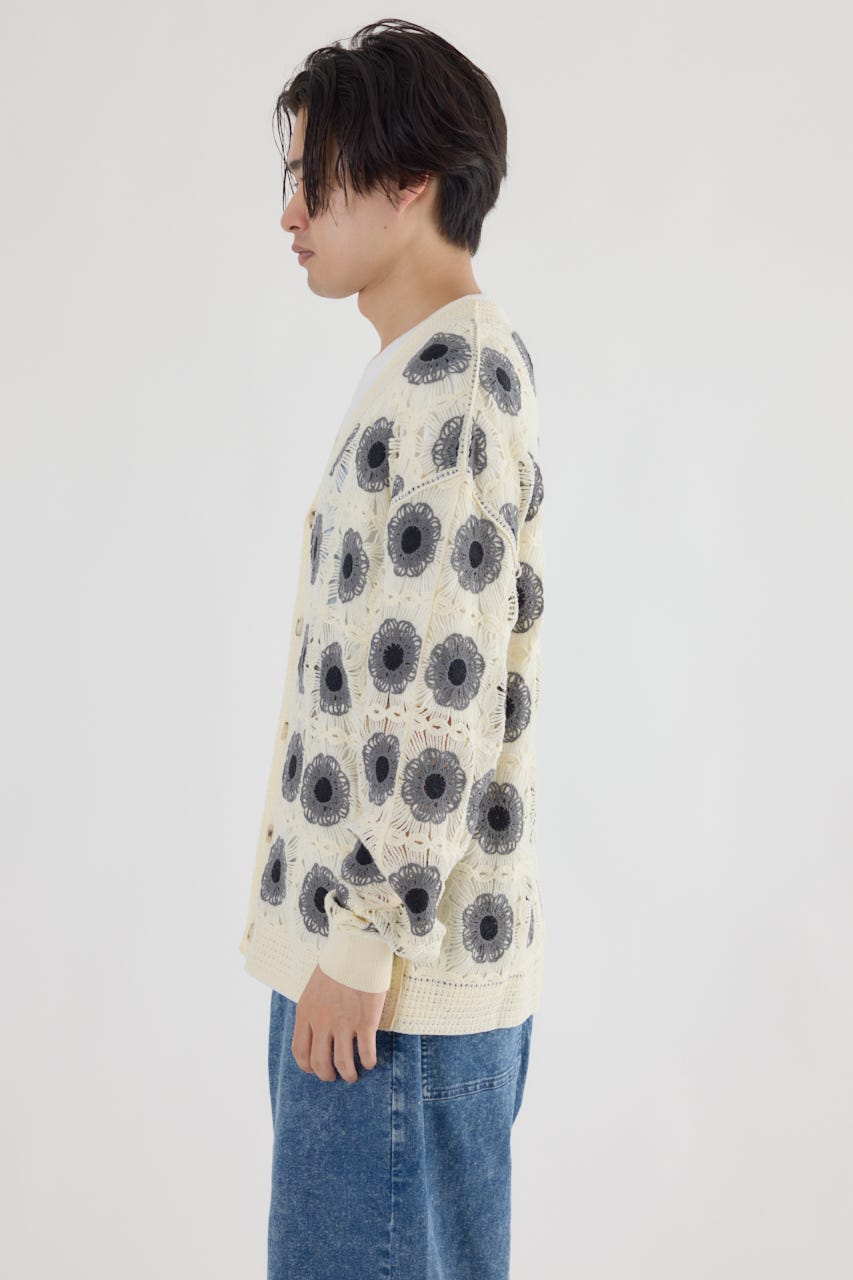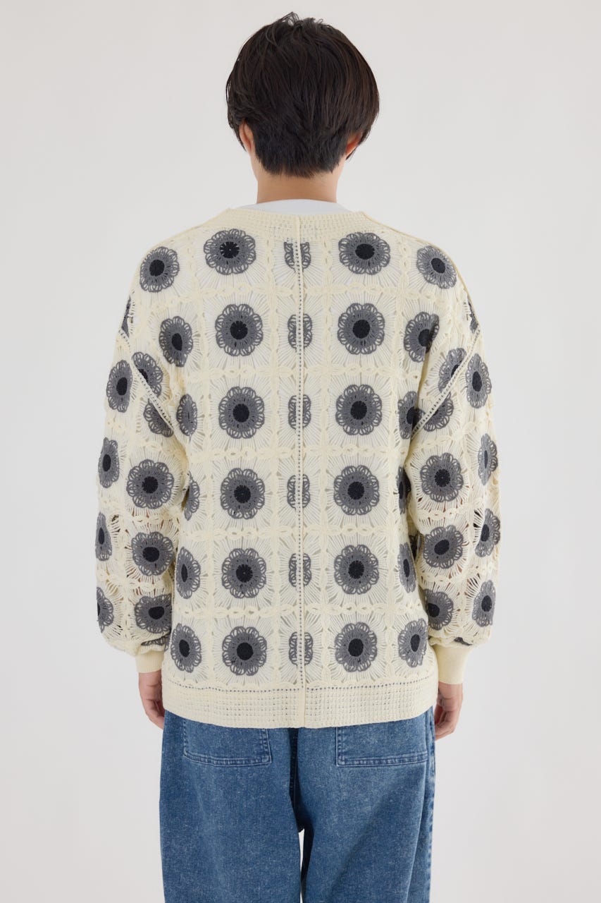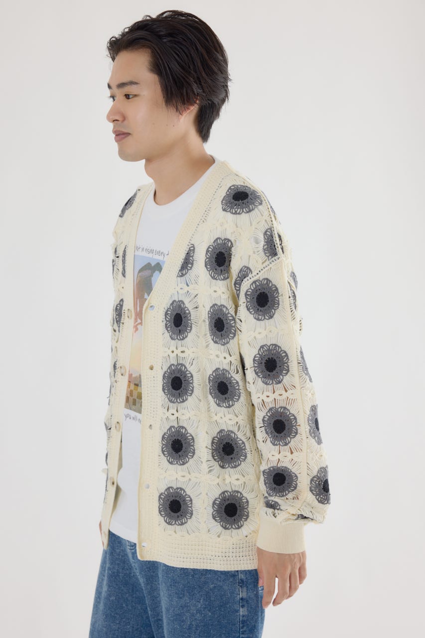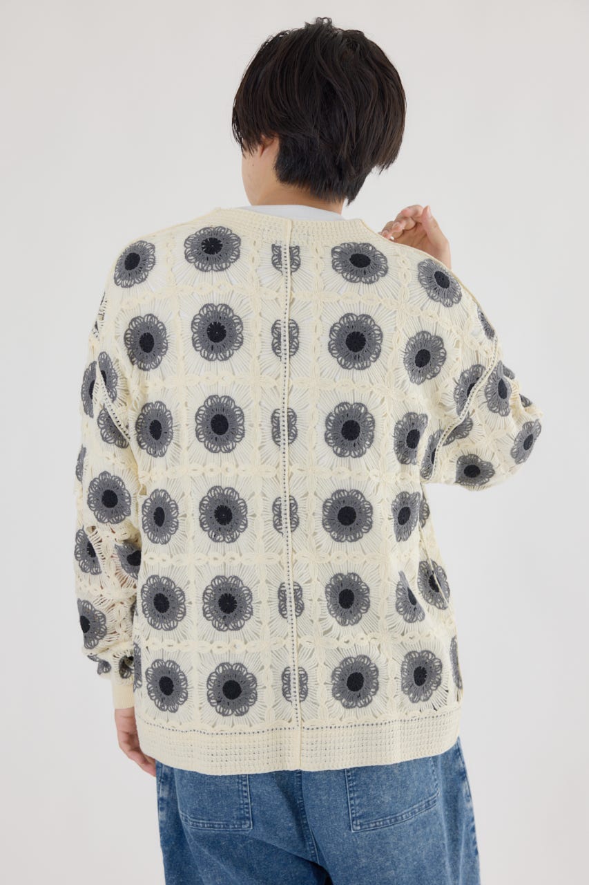 カギ編みを駆使して編まれた透け感がトレンドのニットカーディガン。