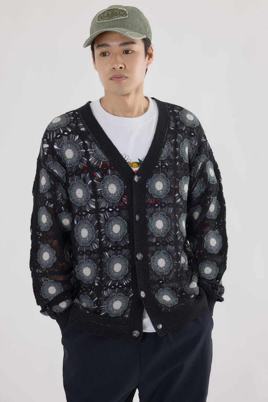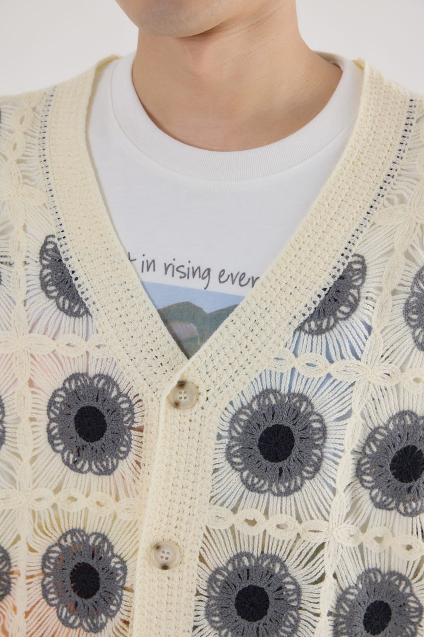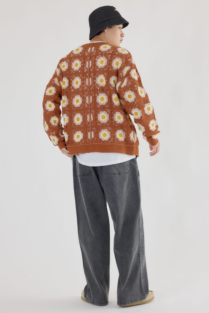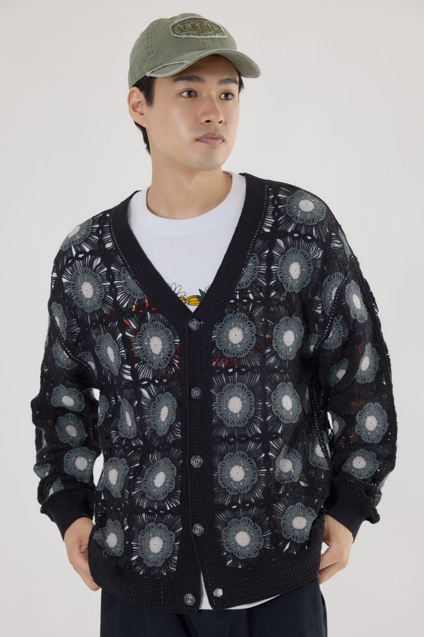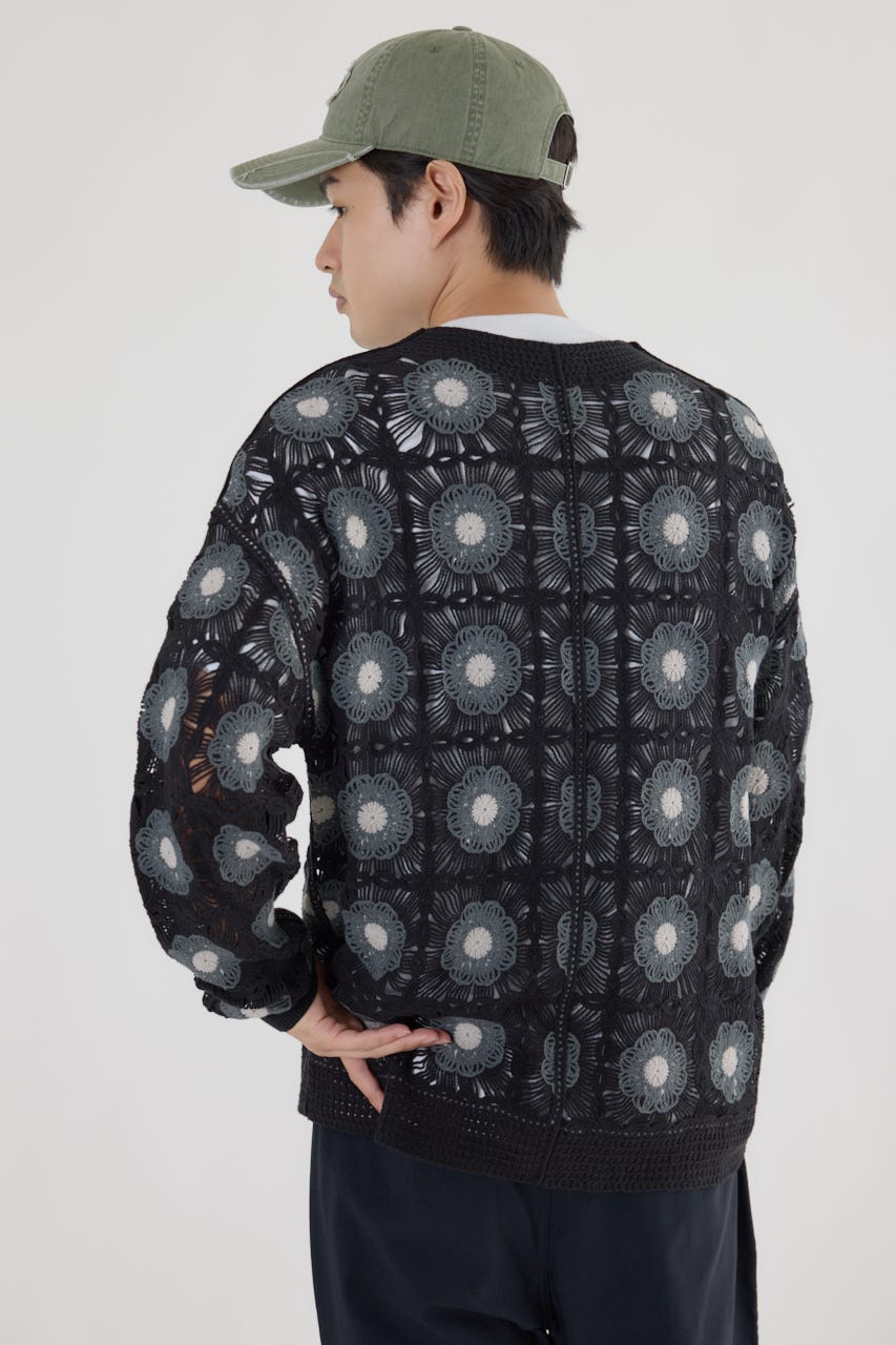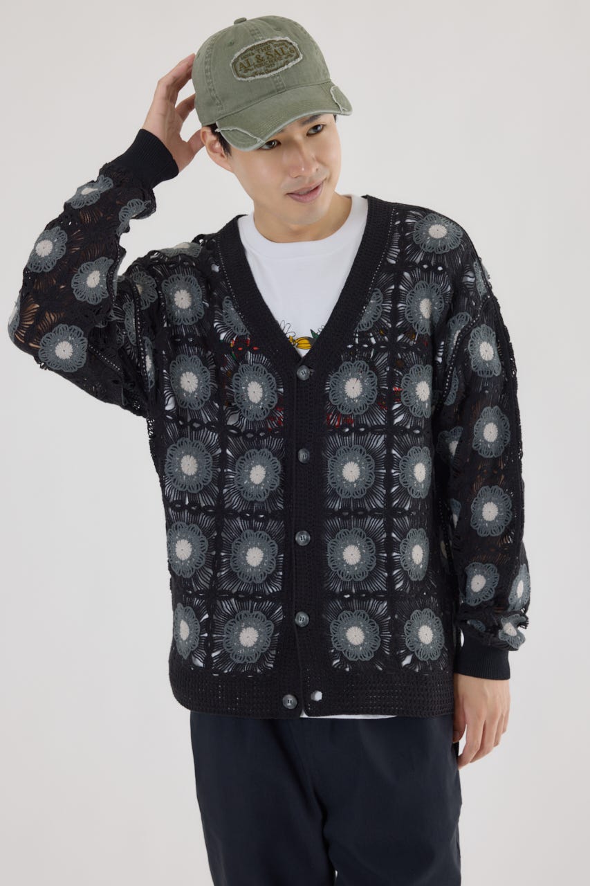 カギ編みを駆使して編まれた透け感がトレンドのニットカーディガン。