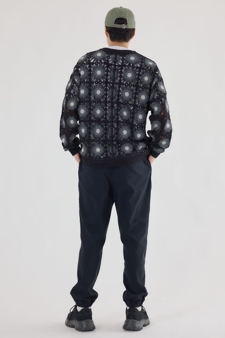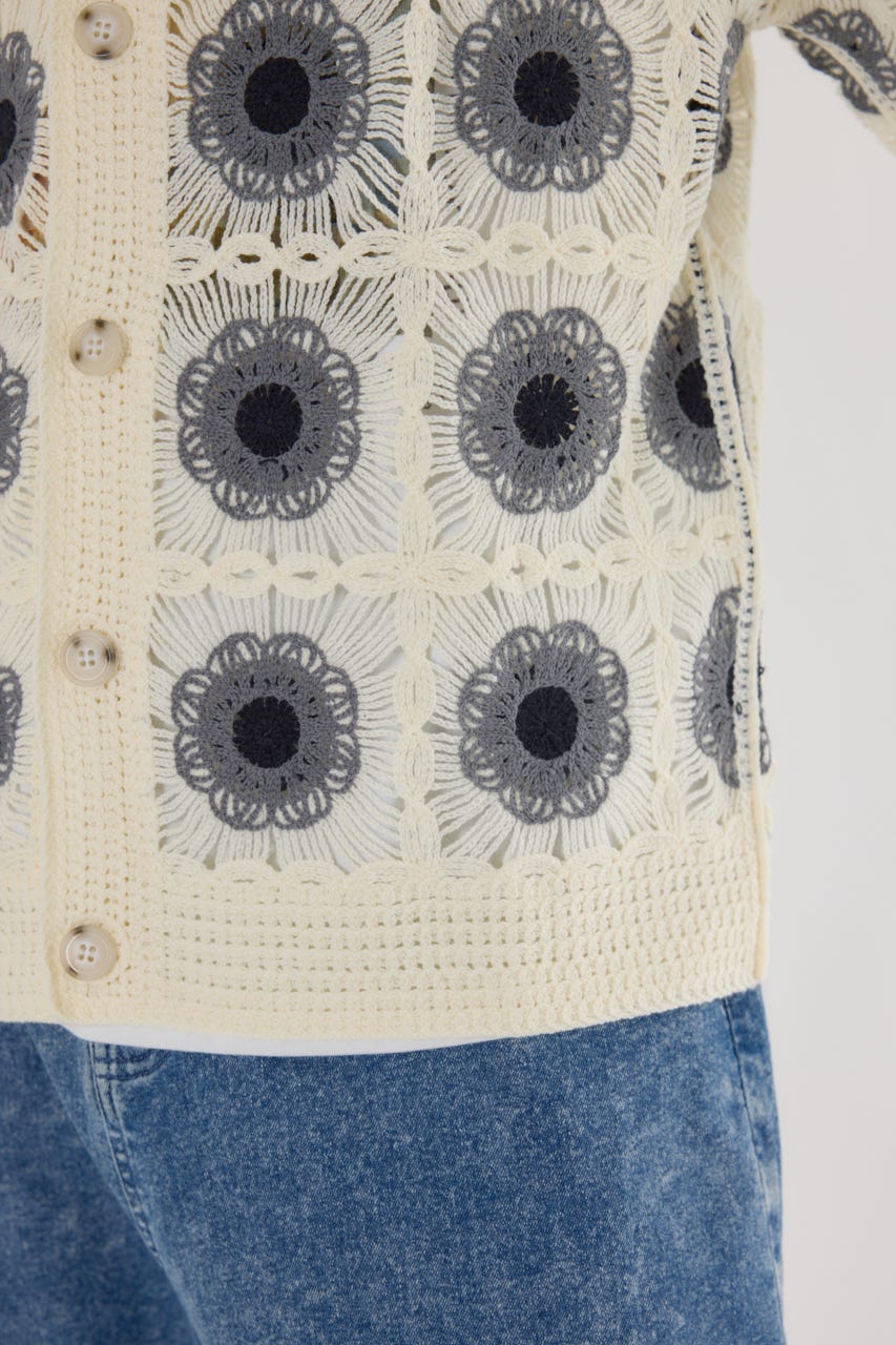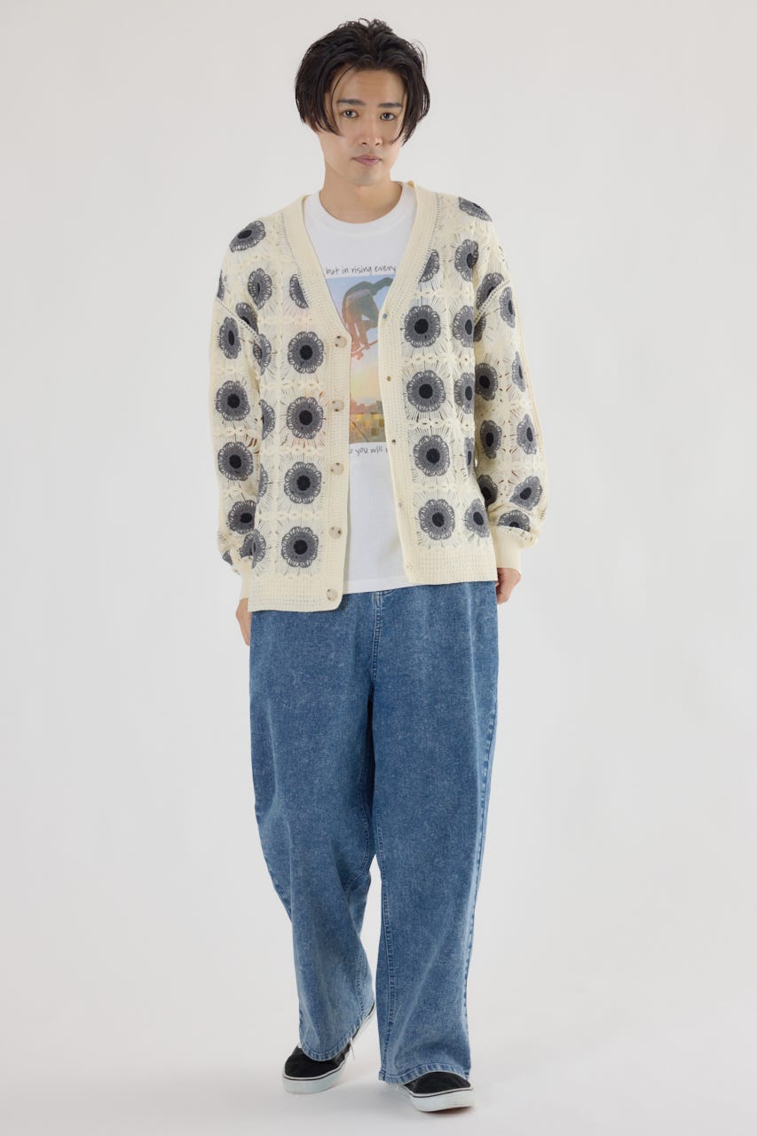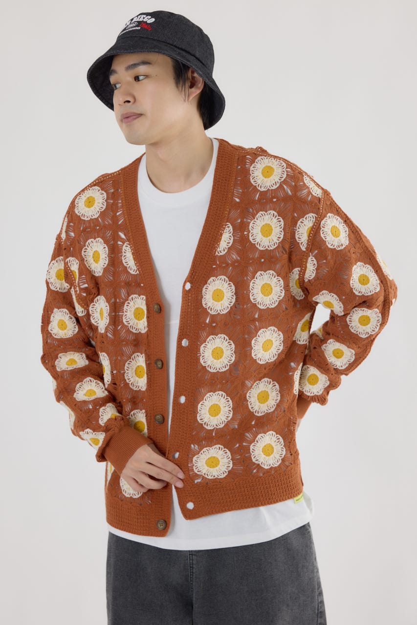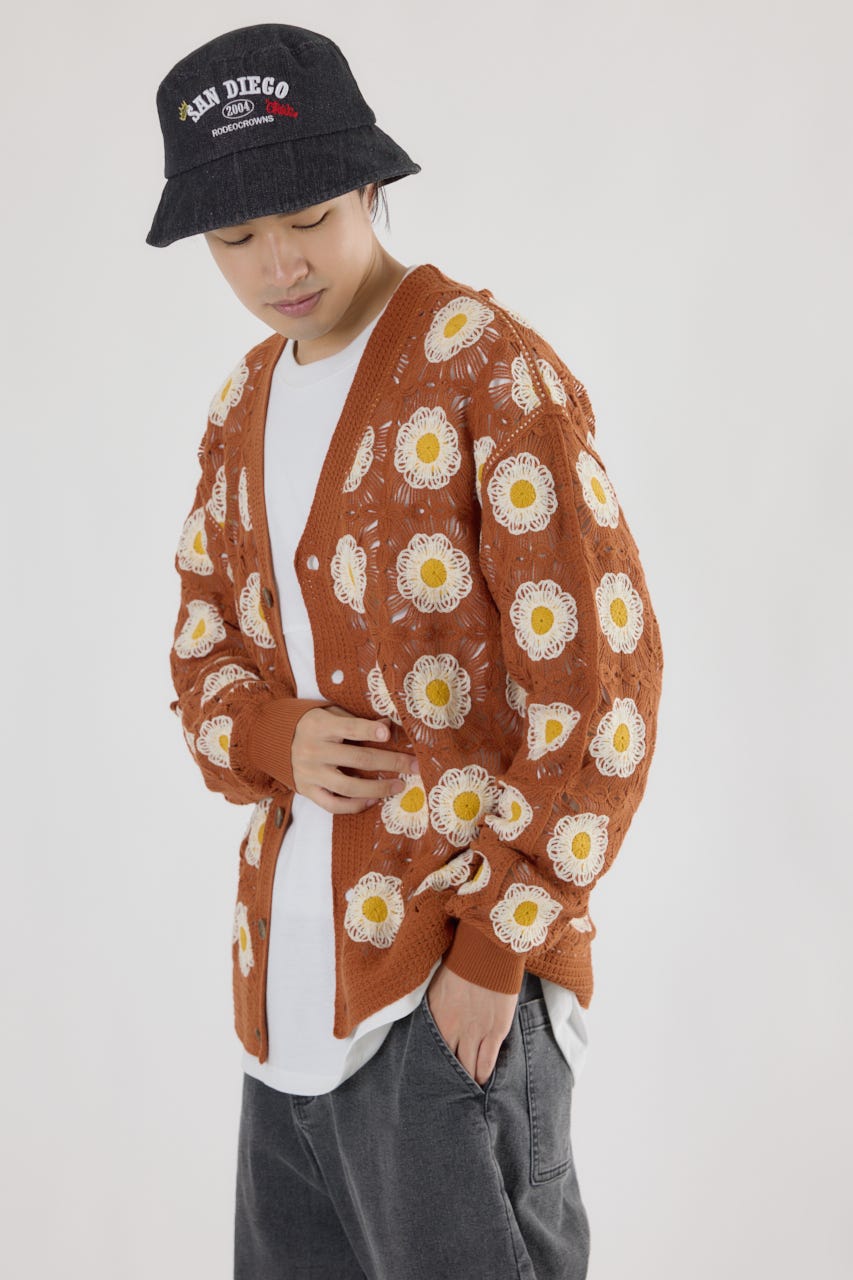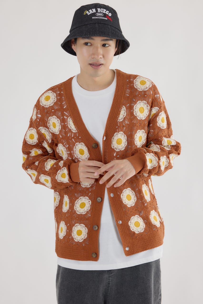 カギ編みを駆使して編まれた透け感がトレンドのニットカーディガン。