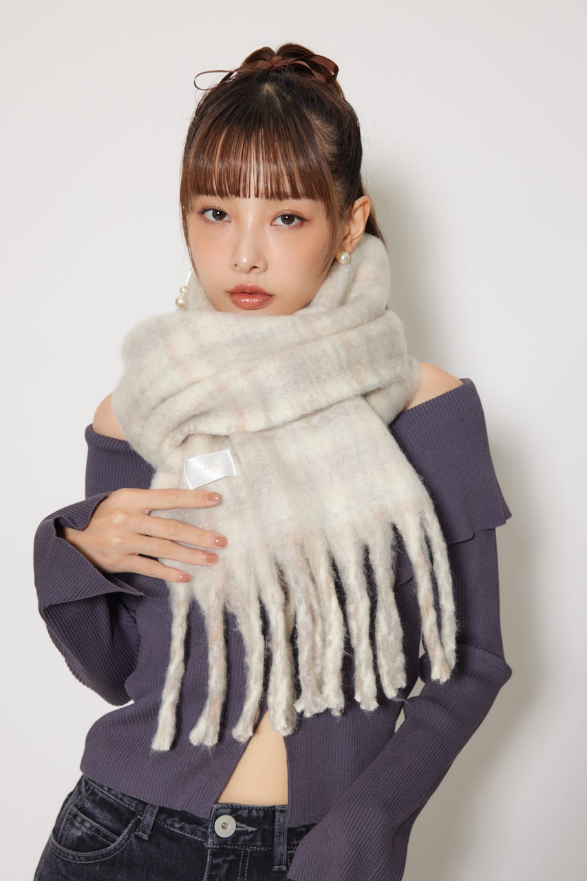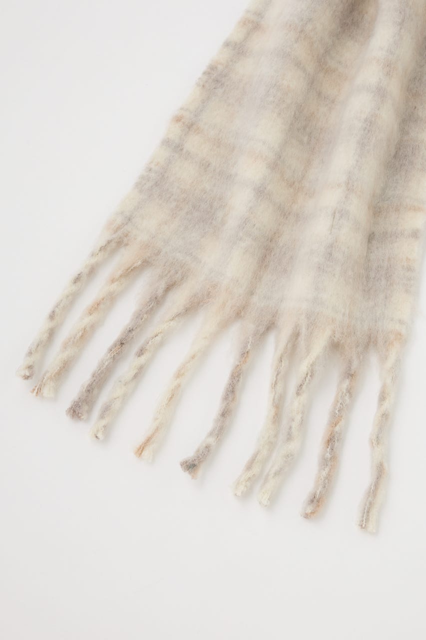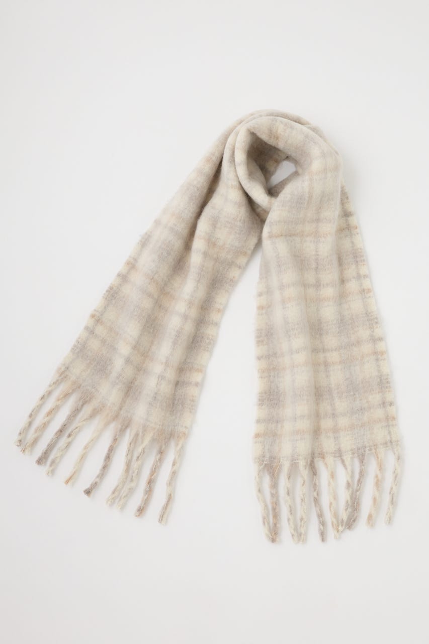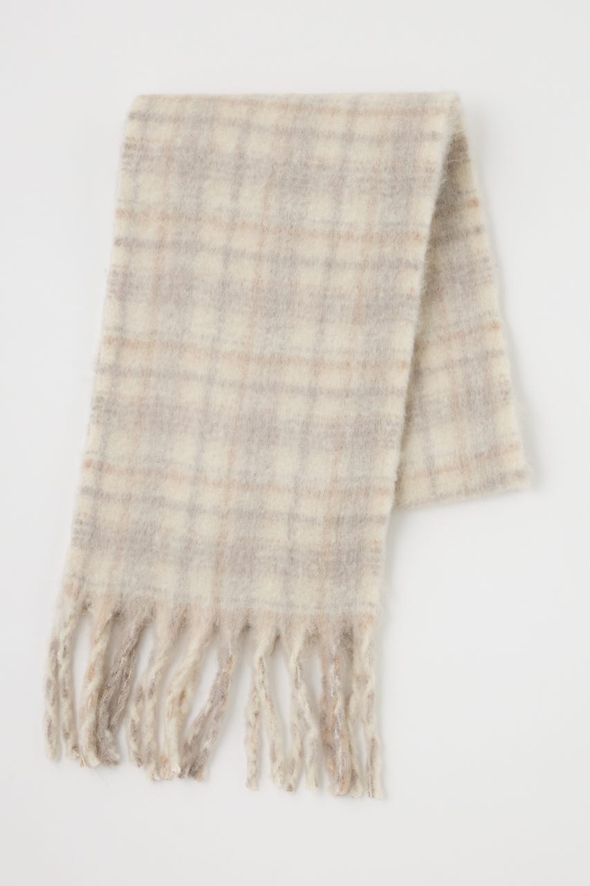 【柔らかい色合いのチェック柄で上品な印象に仕上げたストール】