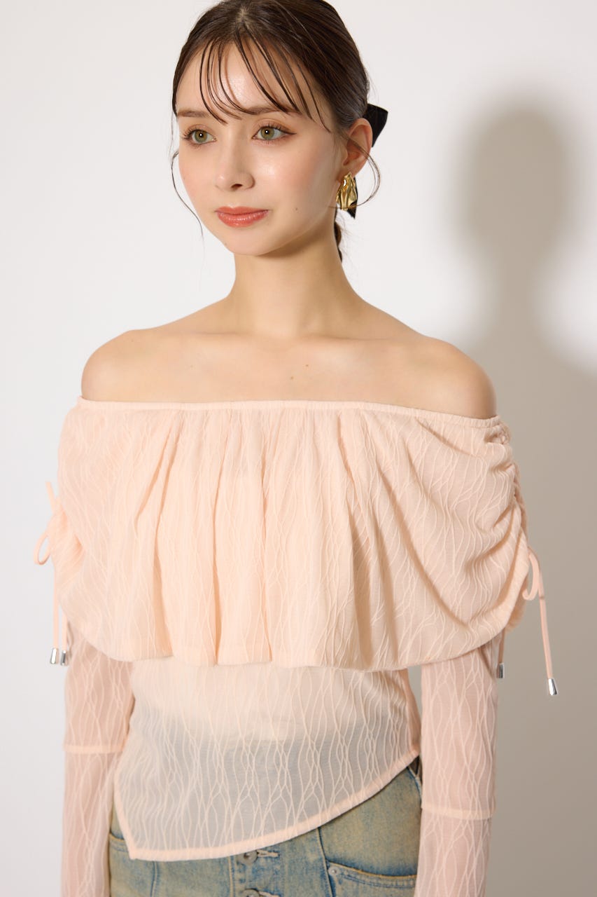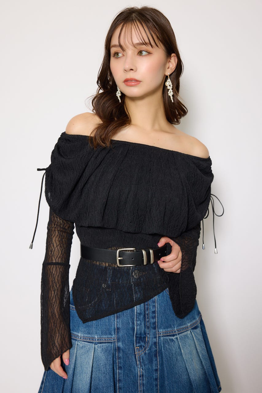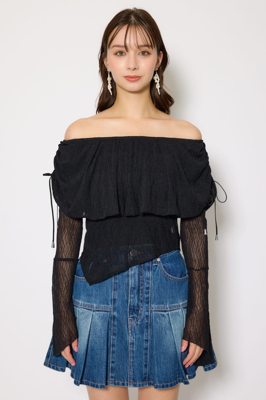 【ストレッチ性のある繊細レースが華やかに演出するオフショルブラウス】
