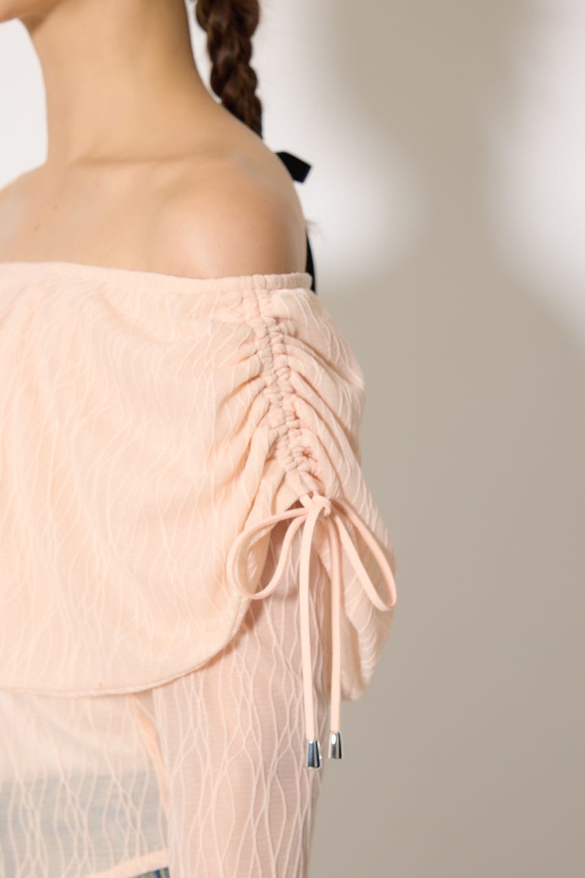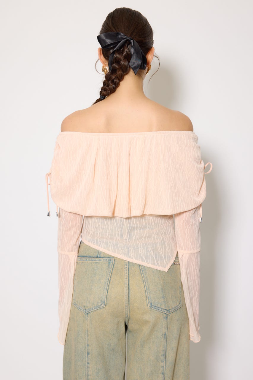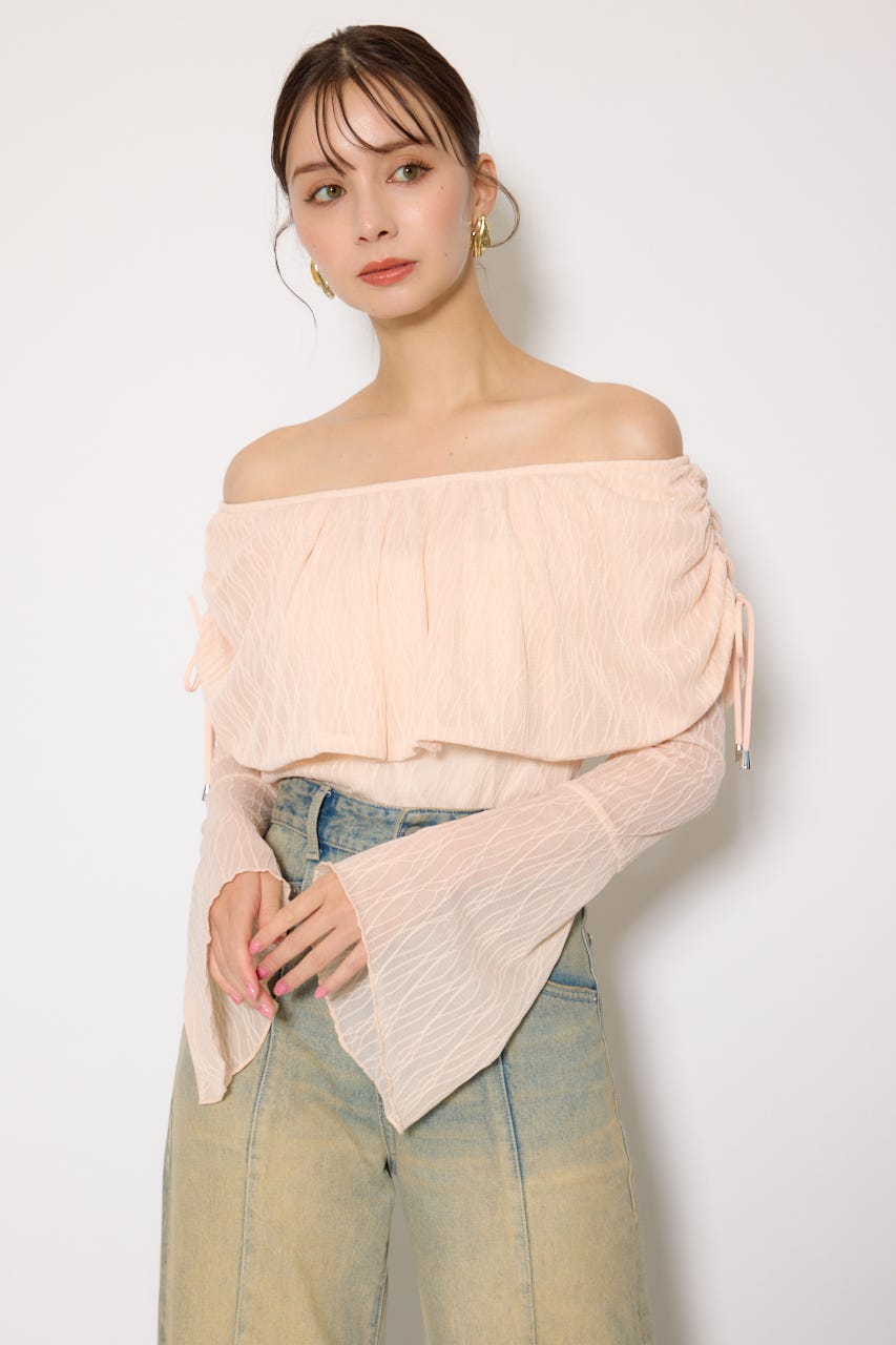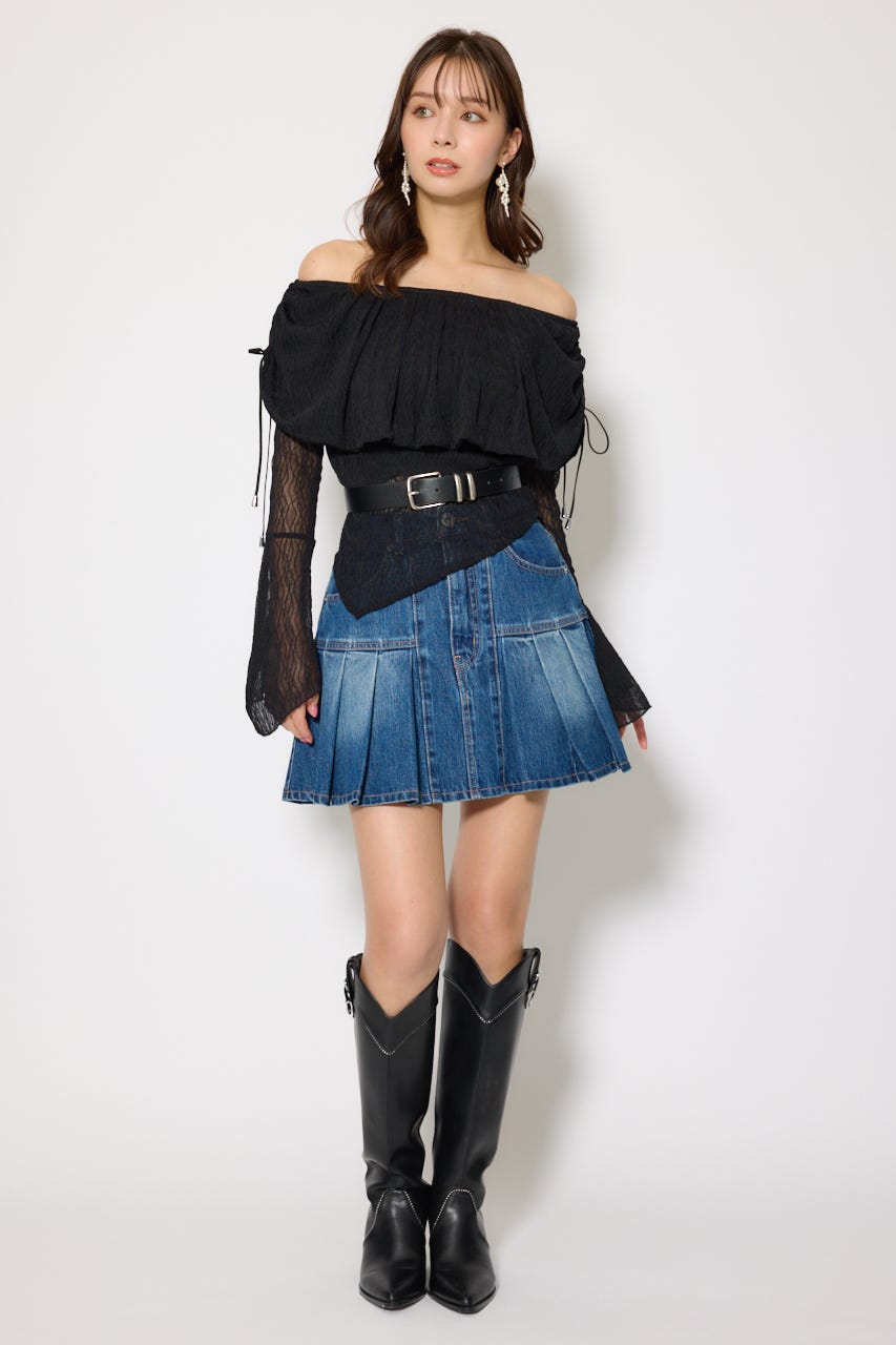 【ストレッチ性のある繊細レースが華やかに演出するオフショルブラウス】