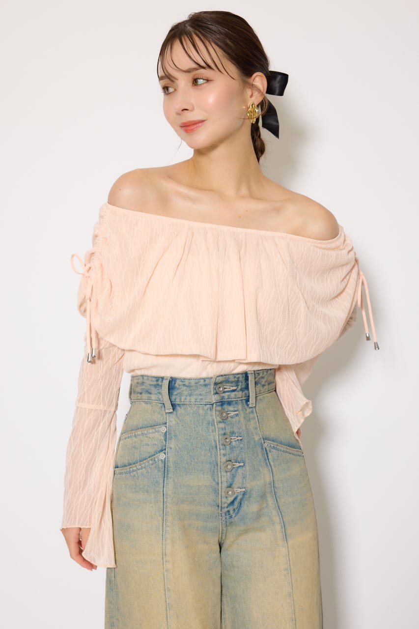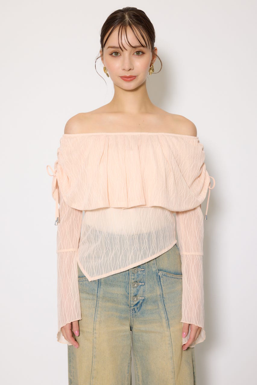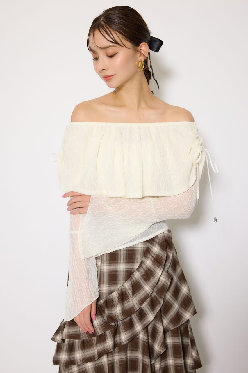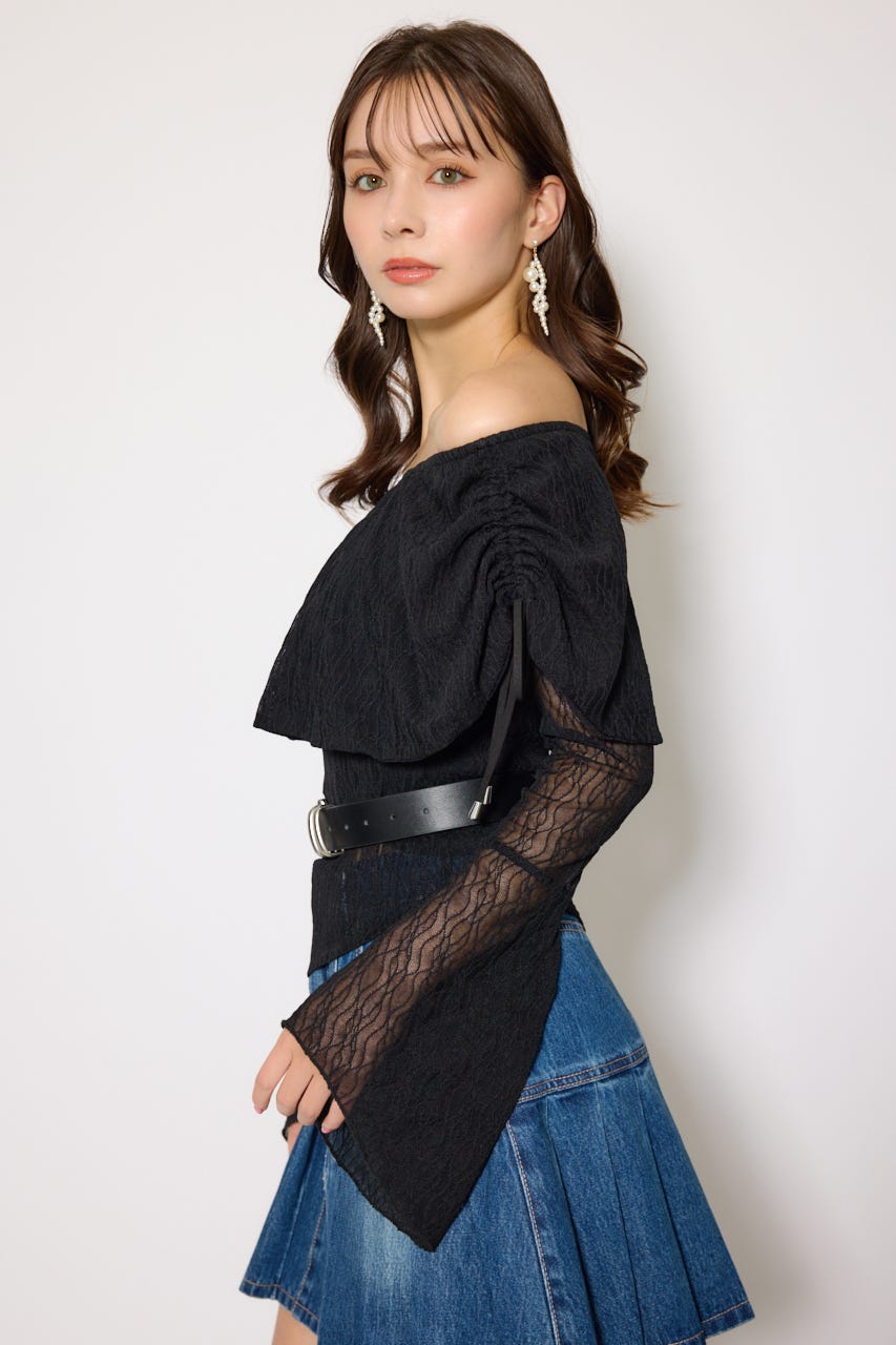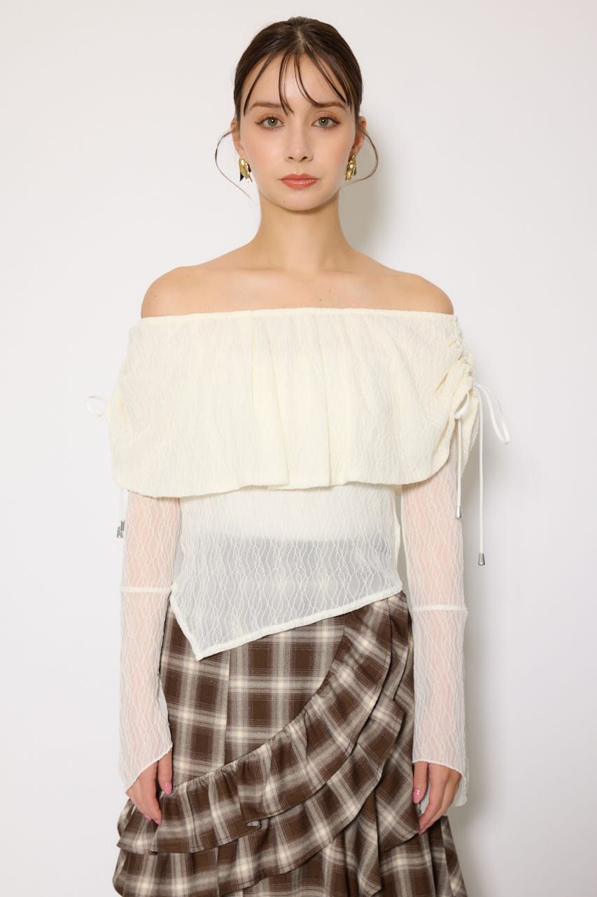 レースの柔らかな透明感と襟ディテールが際立つオフショルレースブラウスです。