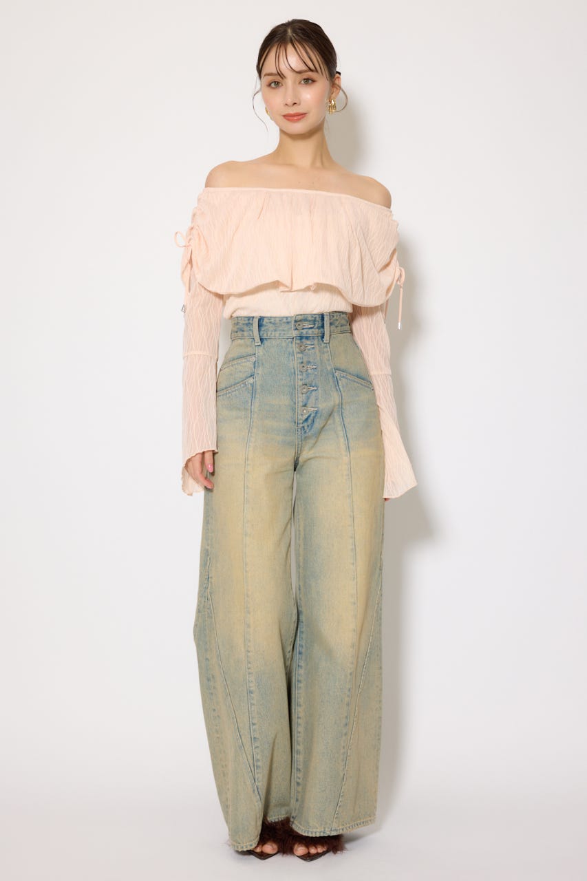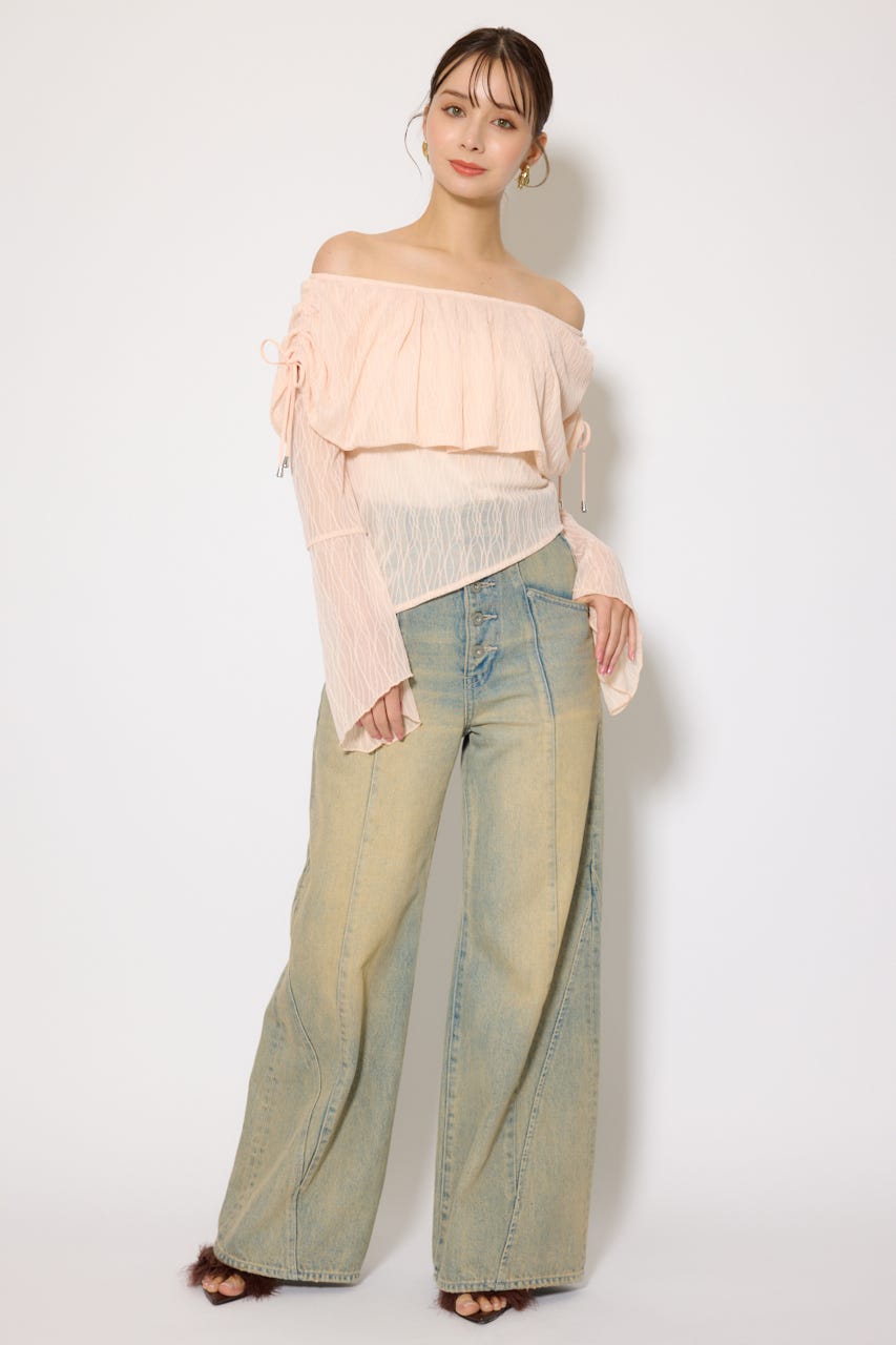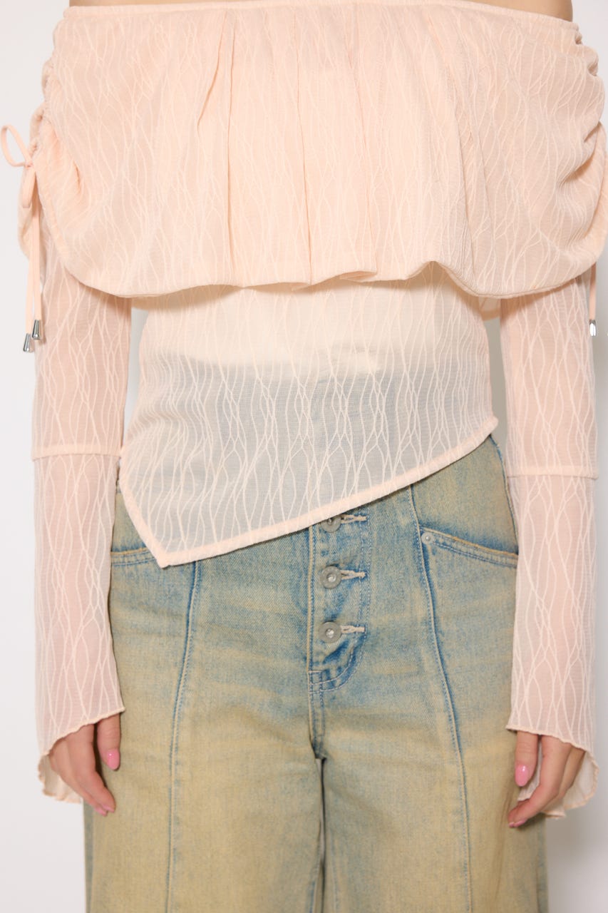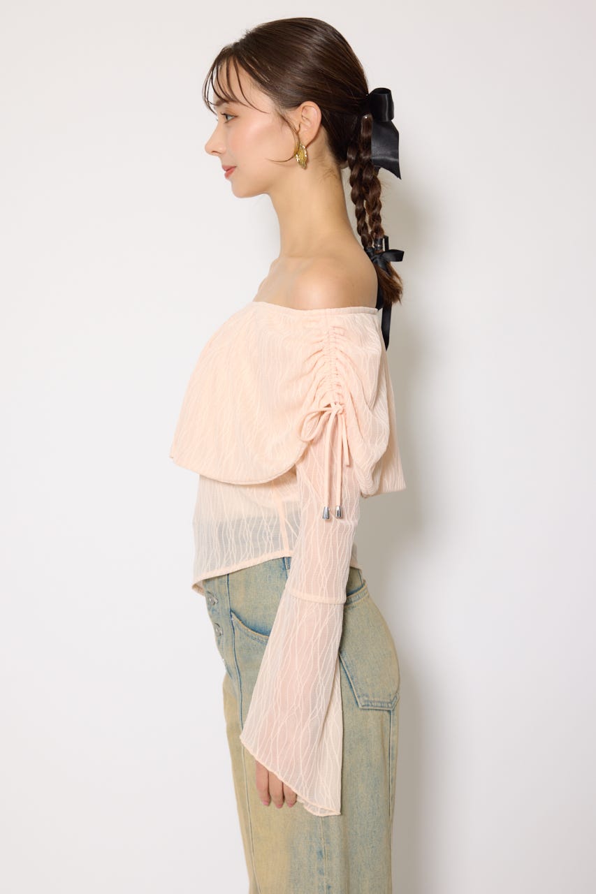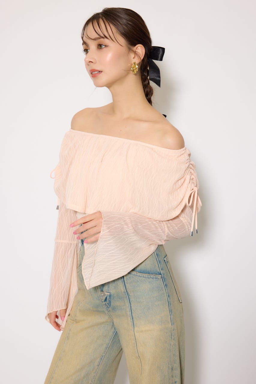 レースの柔らかな透明感と襟ディテールが際立つオフショルレースブラウスです。