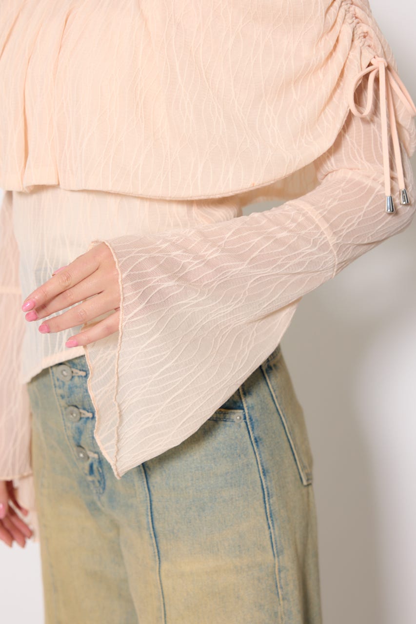 襟の両サイドにはドロストデザインを加え、立体感を出しふんわりとフェミニンに仕上げました。