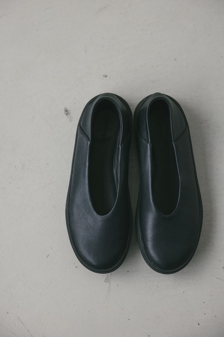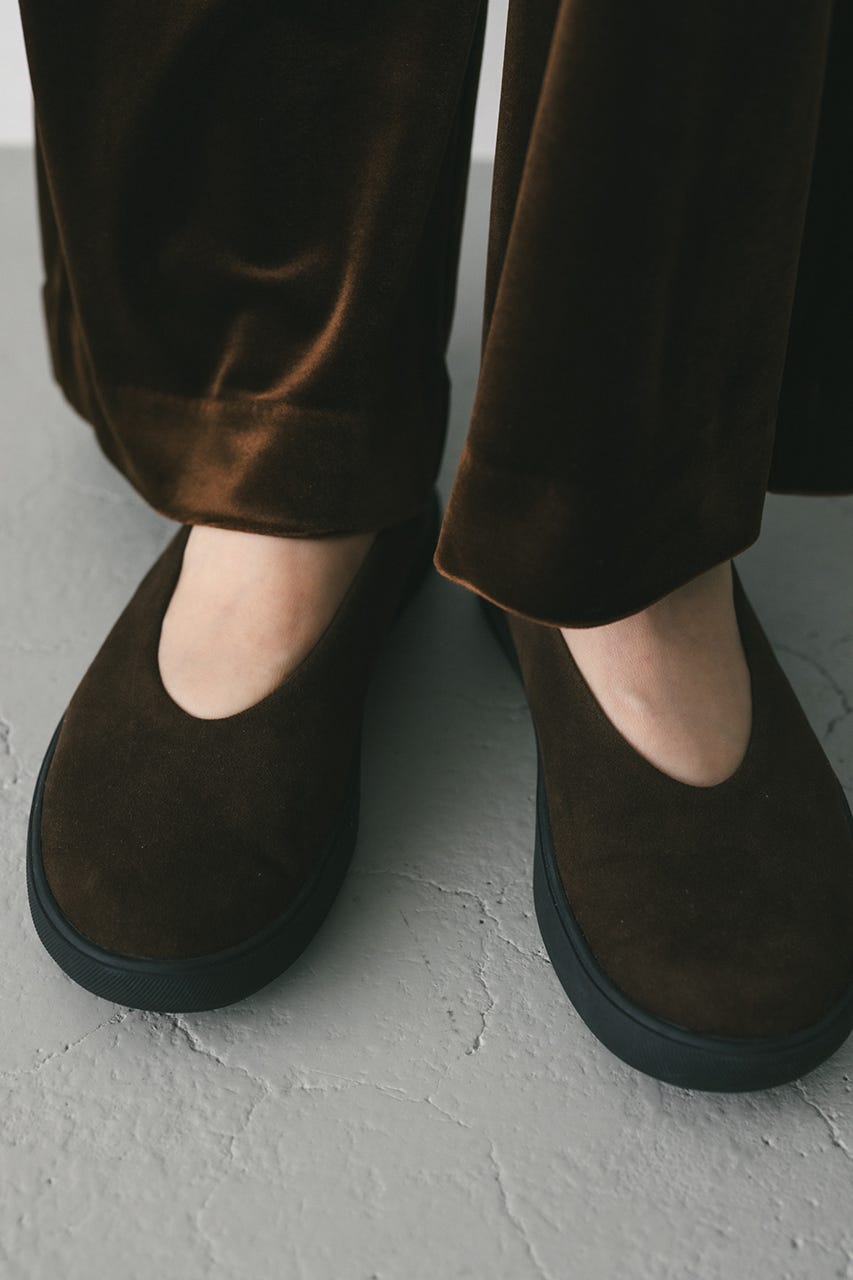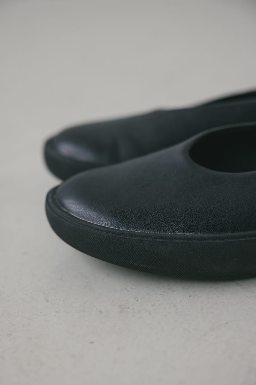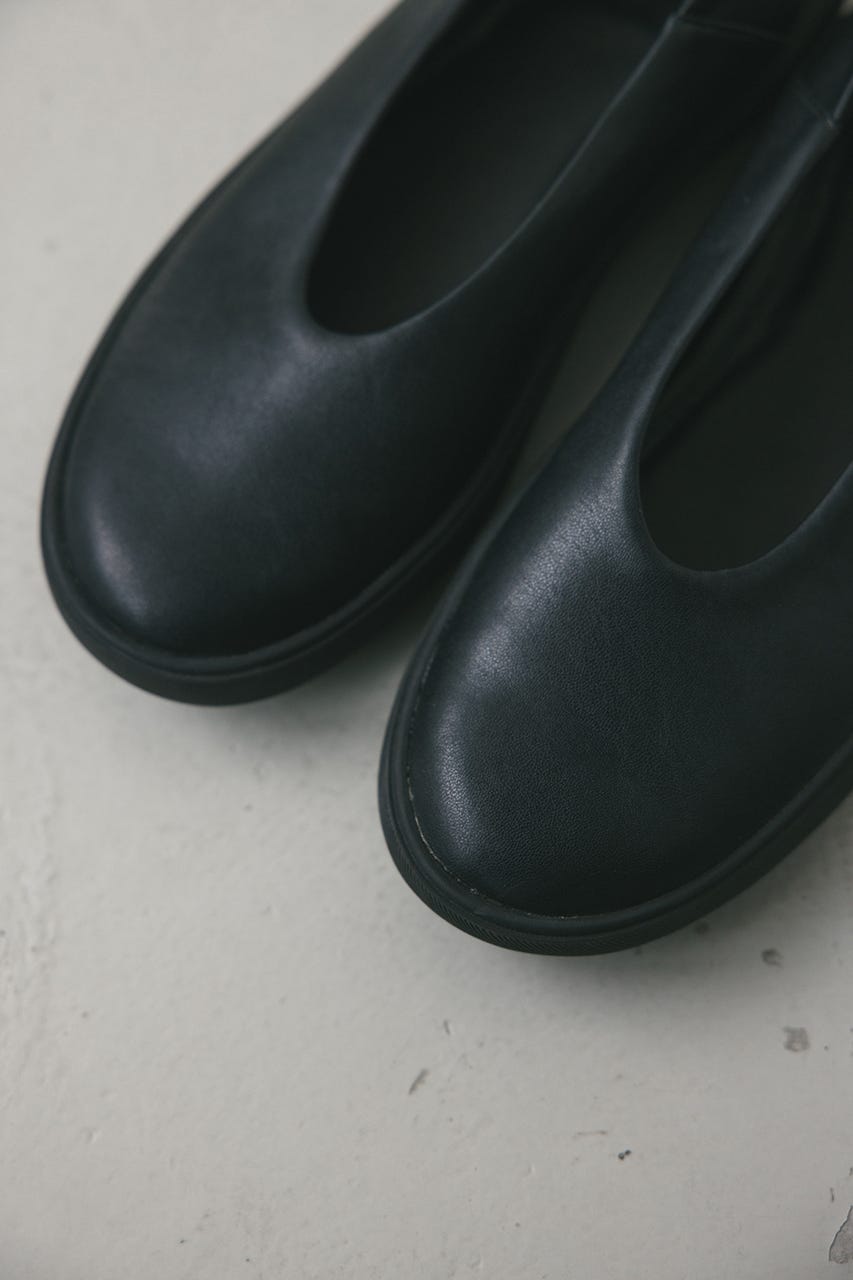 スニーカー仕立てのゴムソールとコロンとしたフォルムが可愛いフラットシューズ。