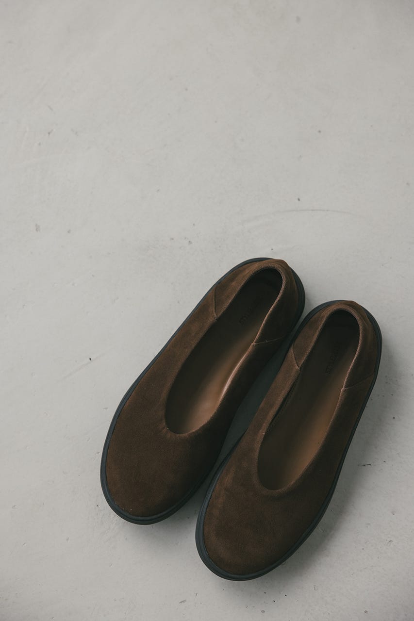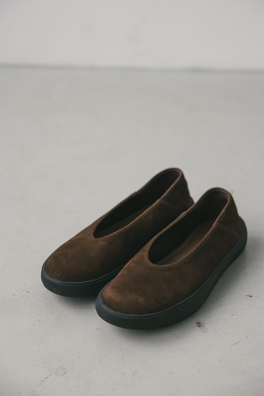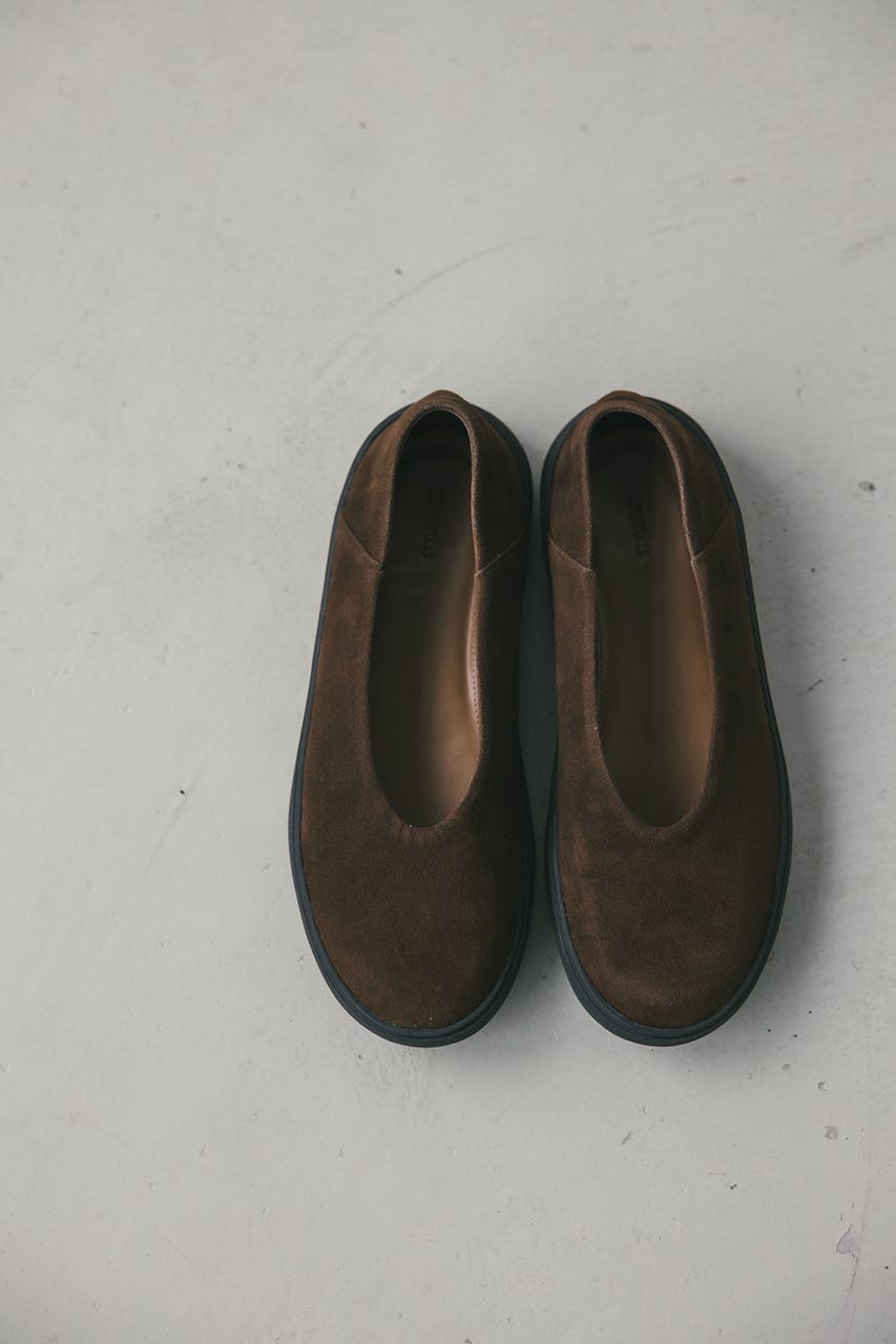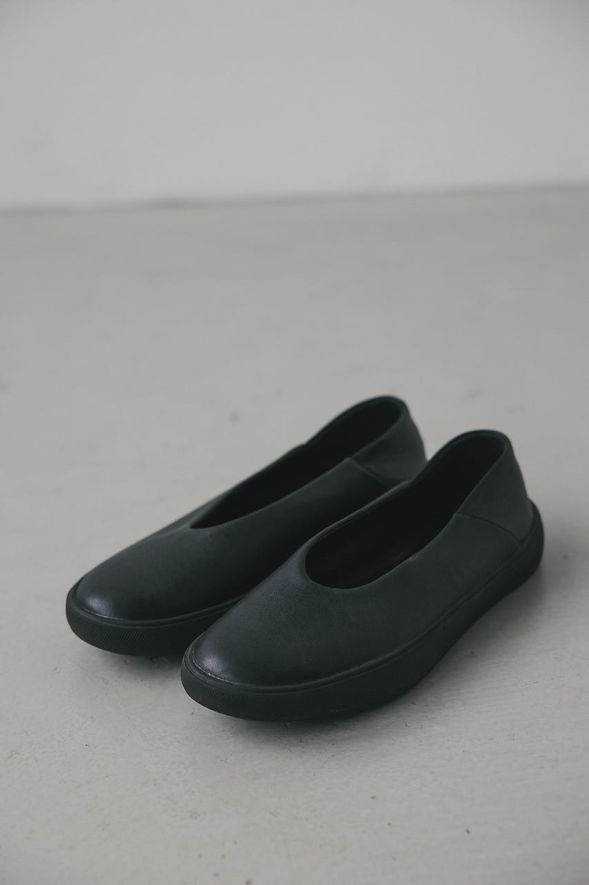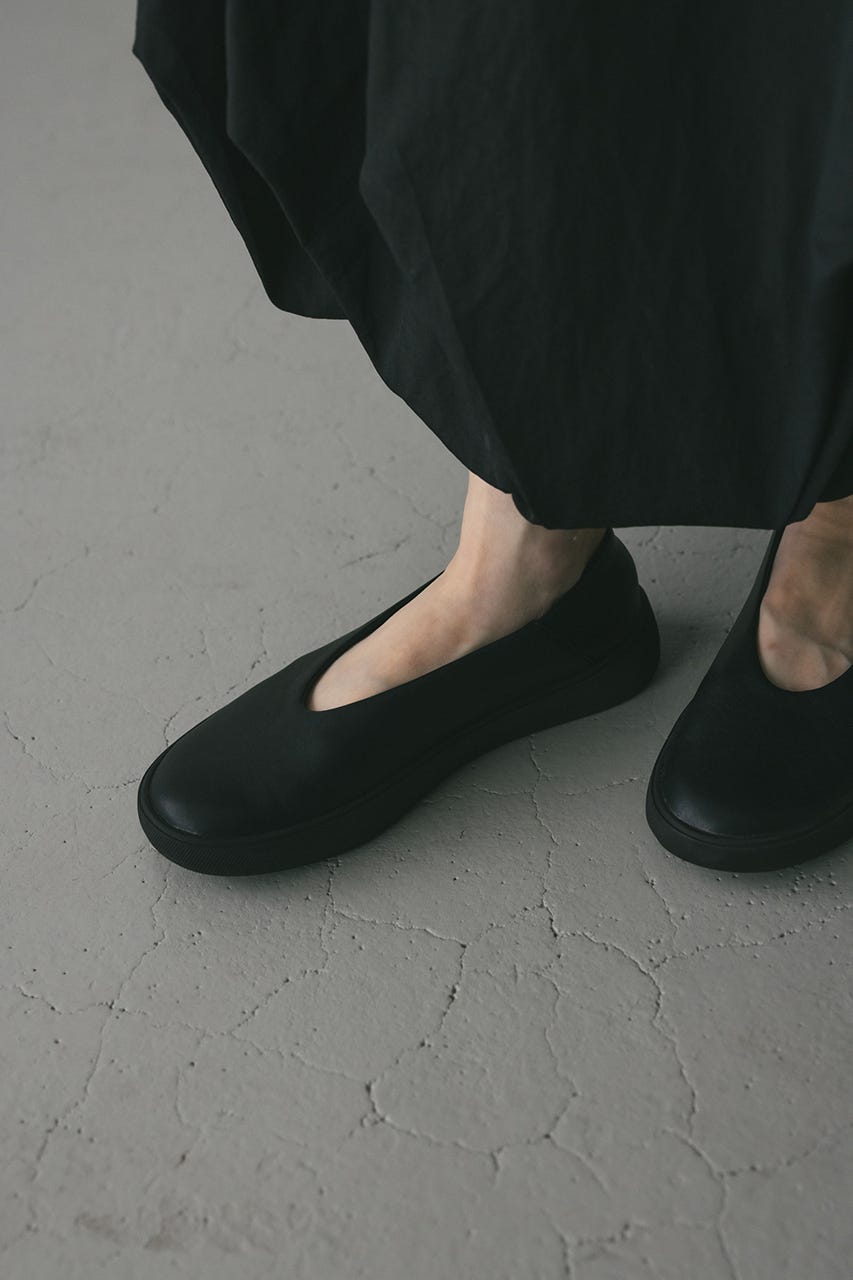 スニーカー仕立てのゴムソールとコロンとしたフォルムが可愛いフラットシューズ。