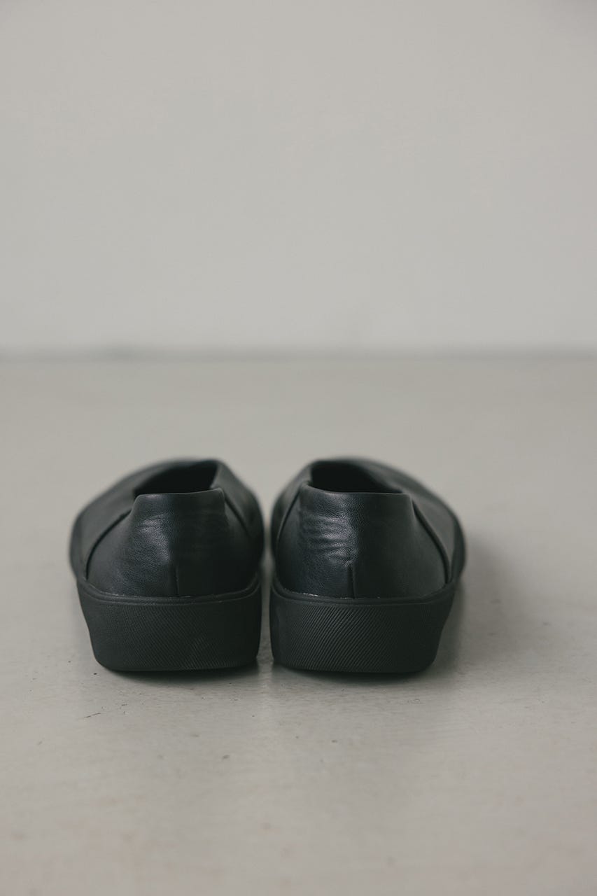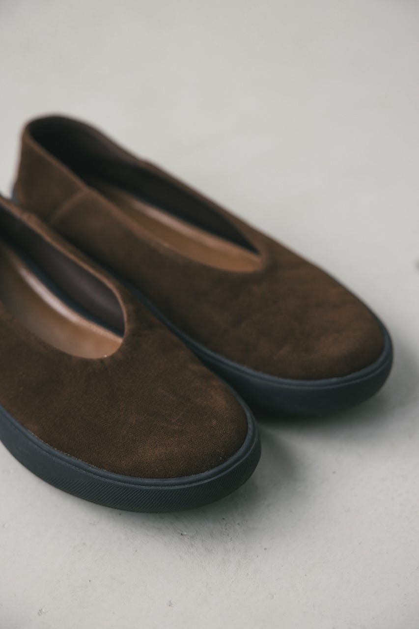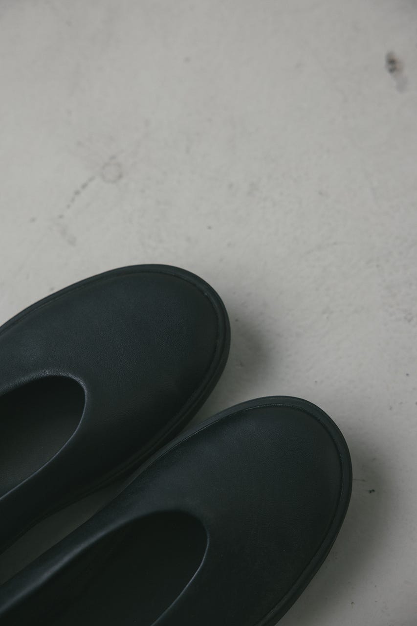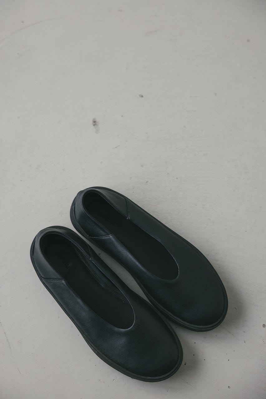 スニーカー仕立てのゴムソールとコロンとしたフォルムが可愛いフラットシューズ。