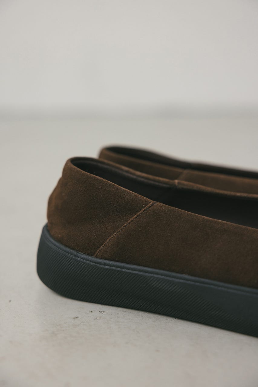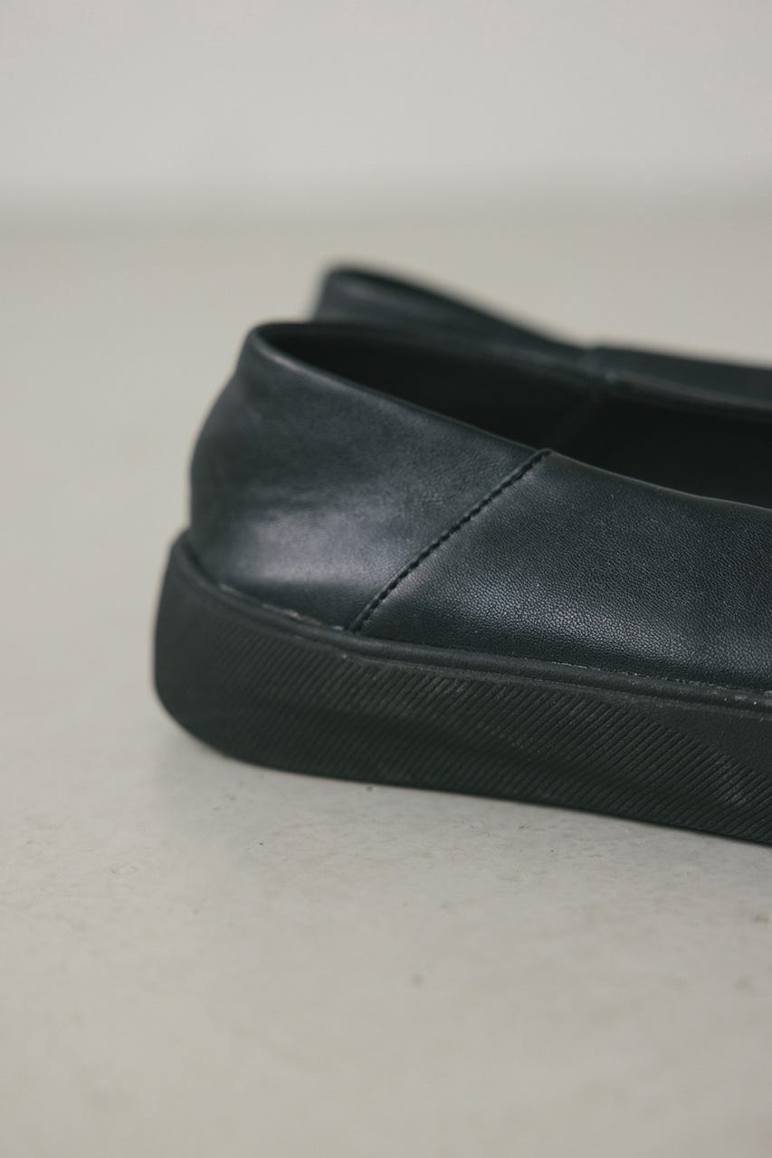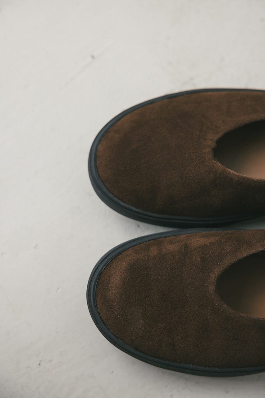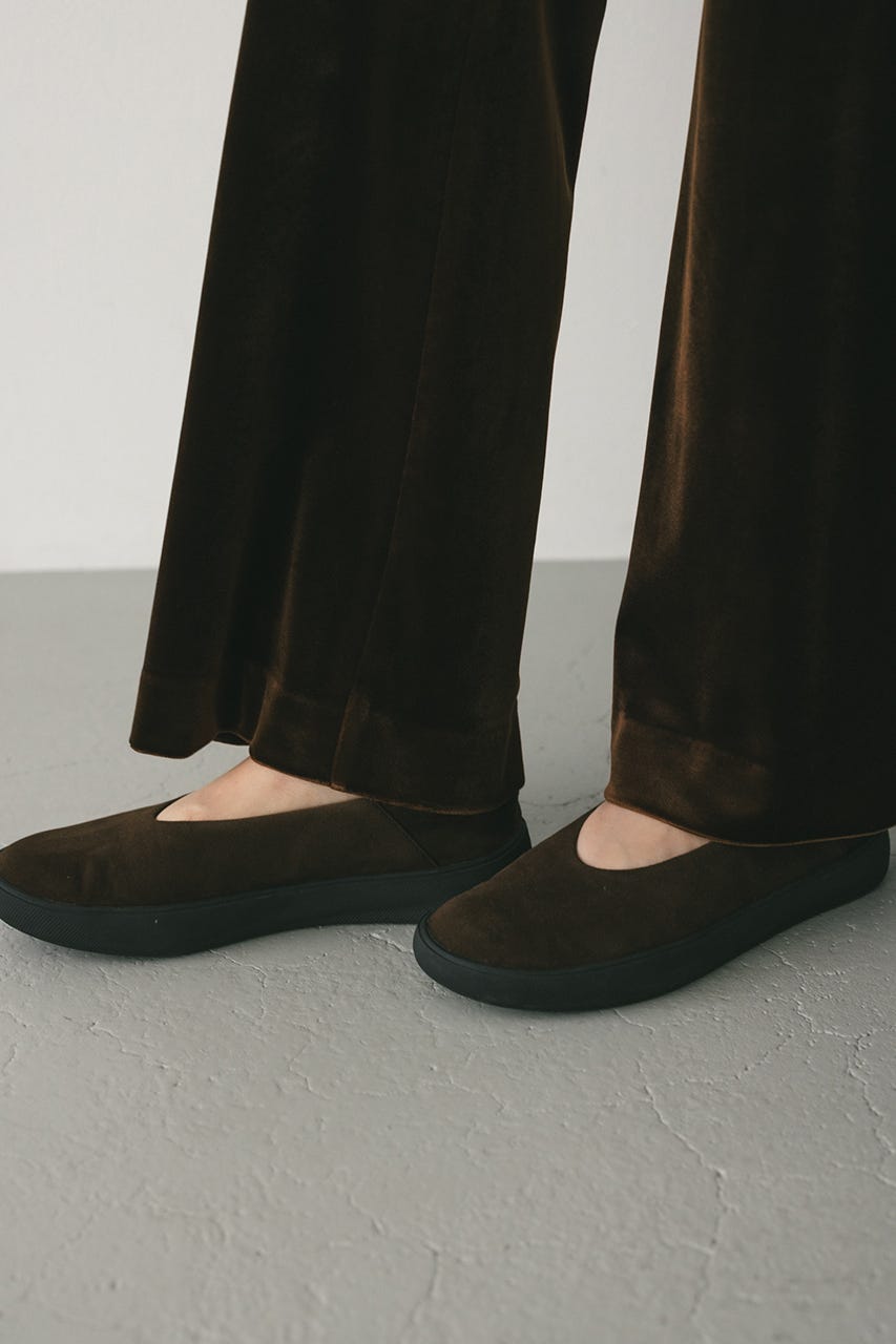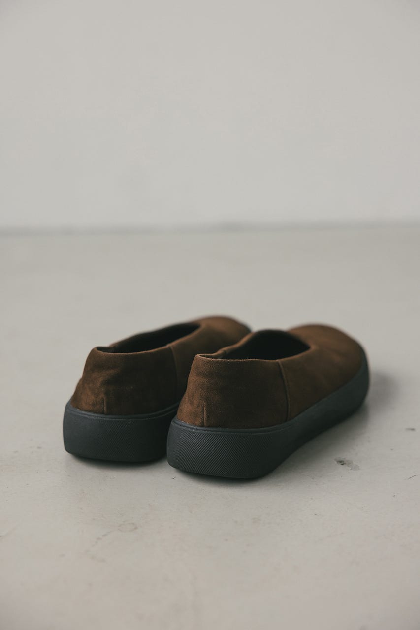 スニーカー仕立てのゴムソールとコロンとしたフォルムが可愛いフラットシューズ。