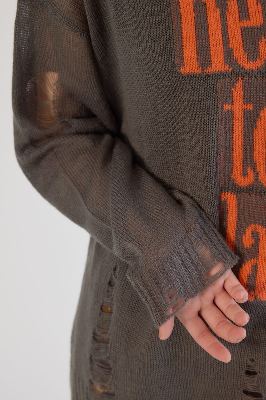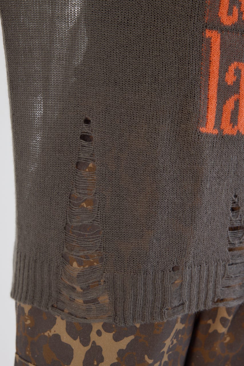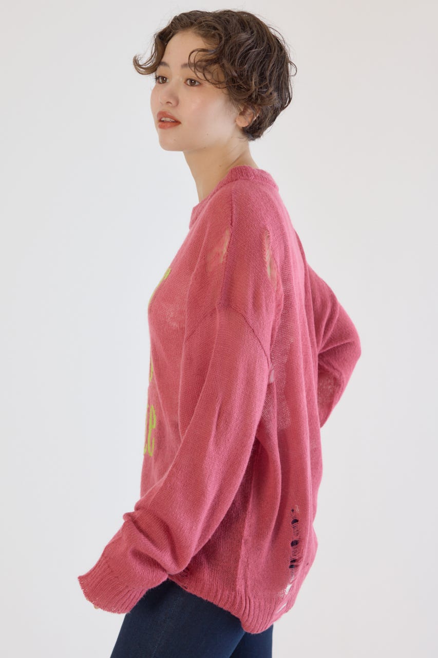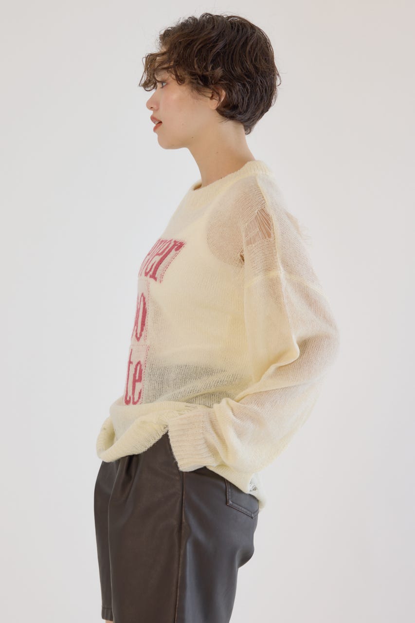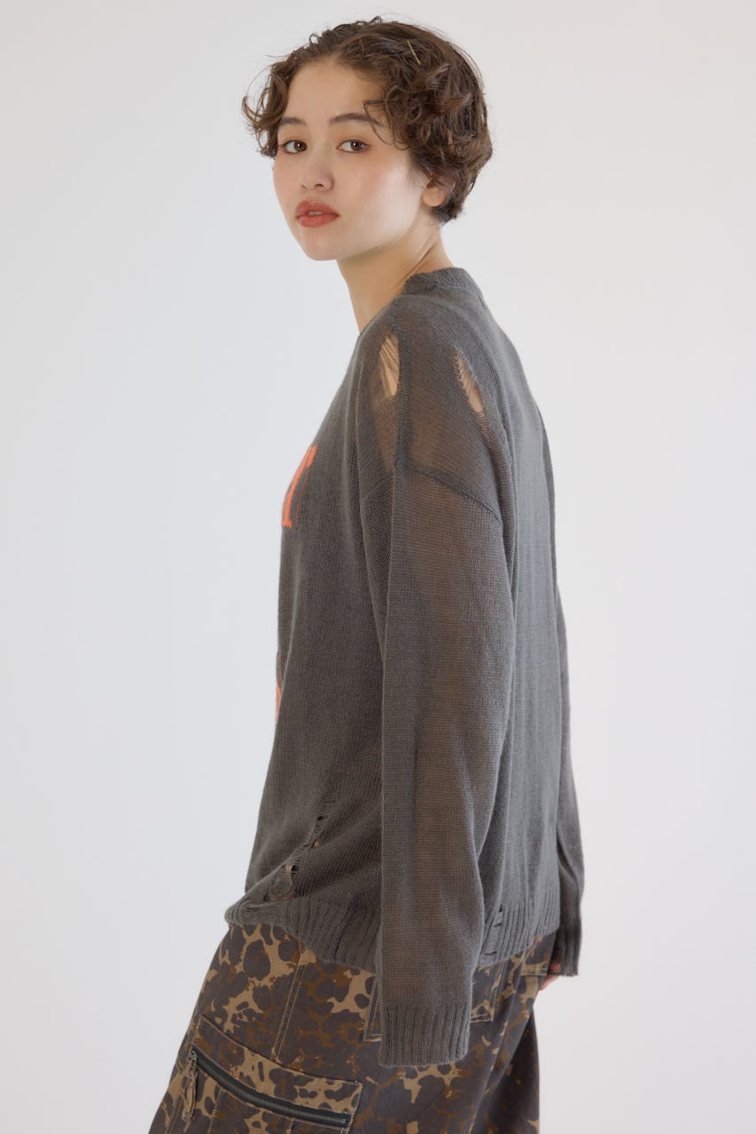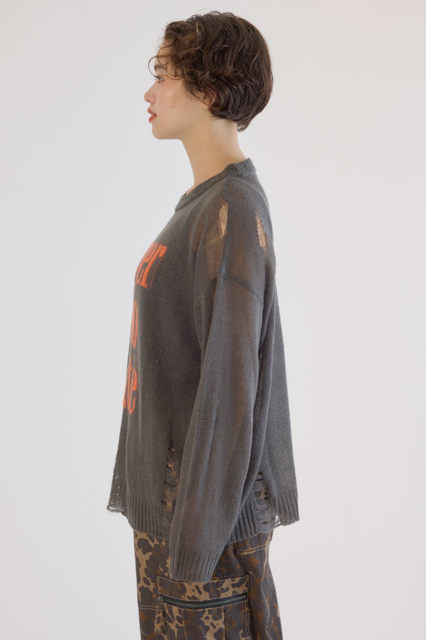 メッセージの配色がポイントで大胆なダメージを加え、エッジを効かせたデザインのニット。