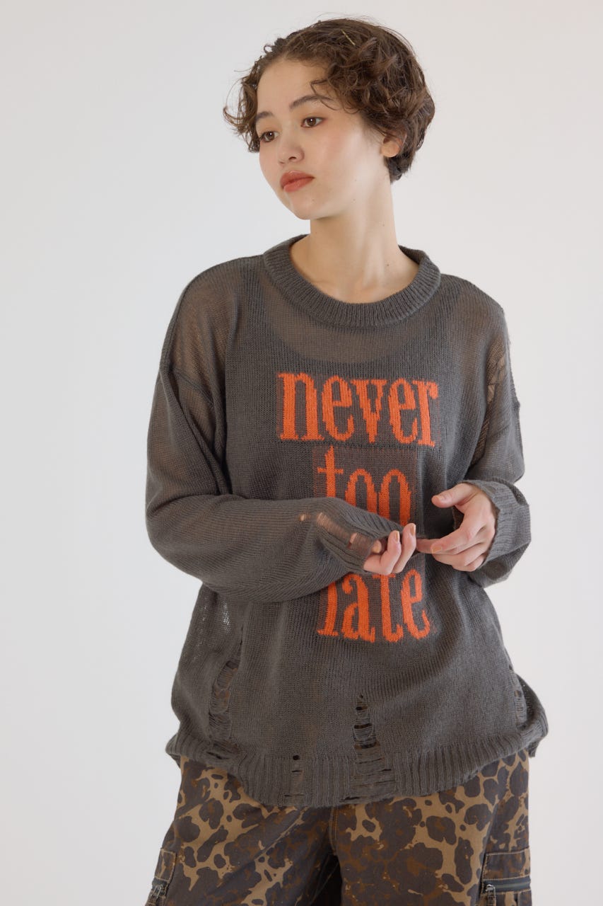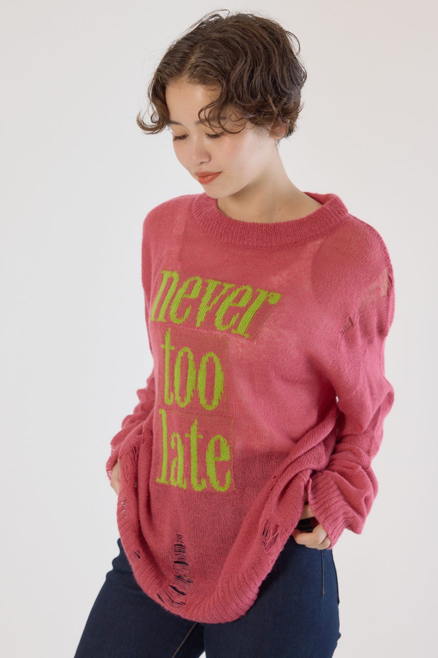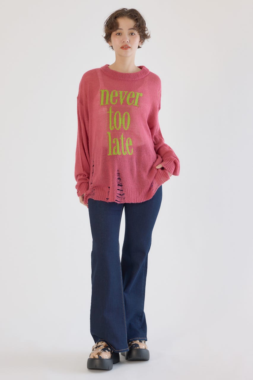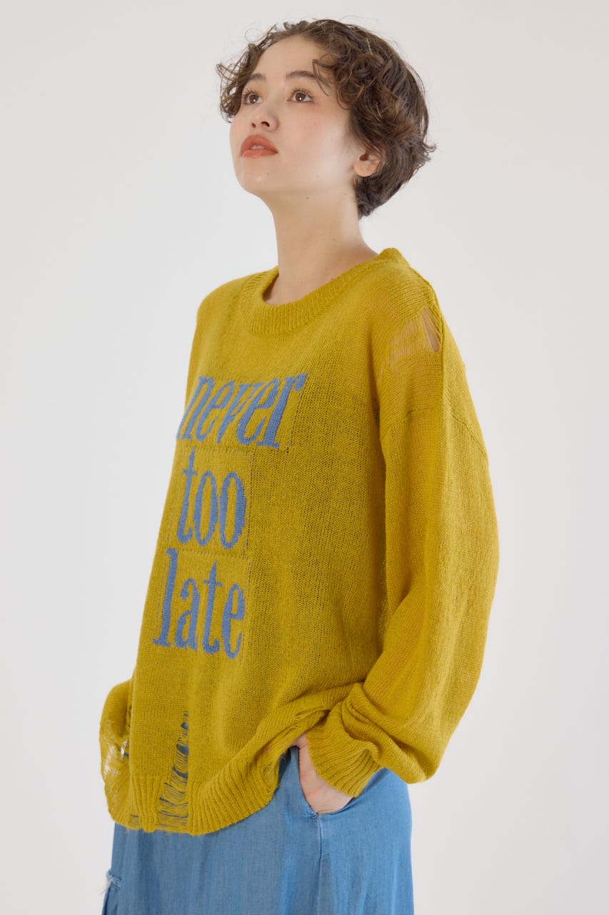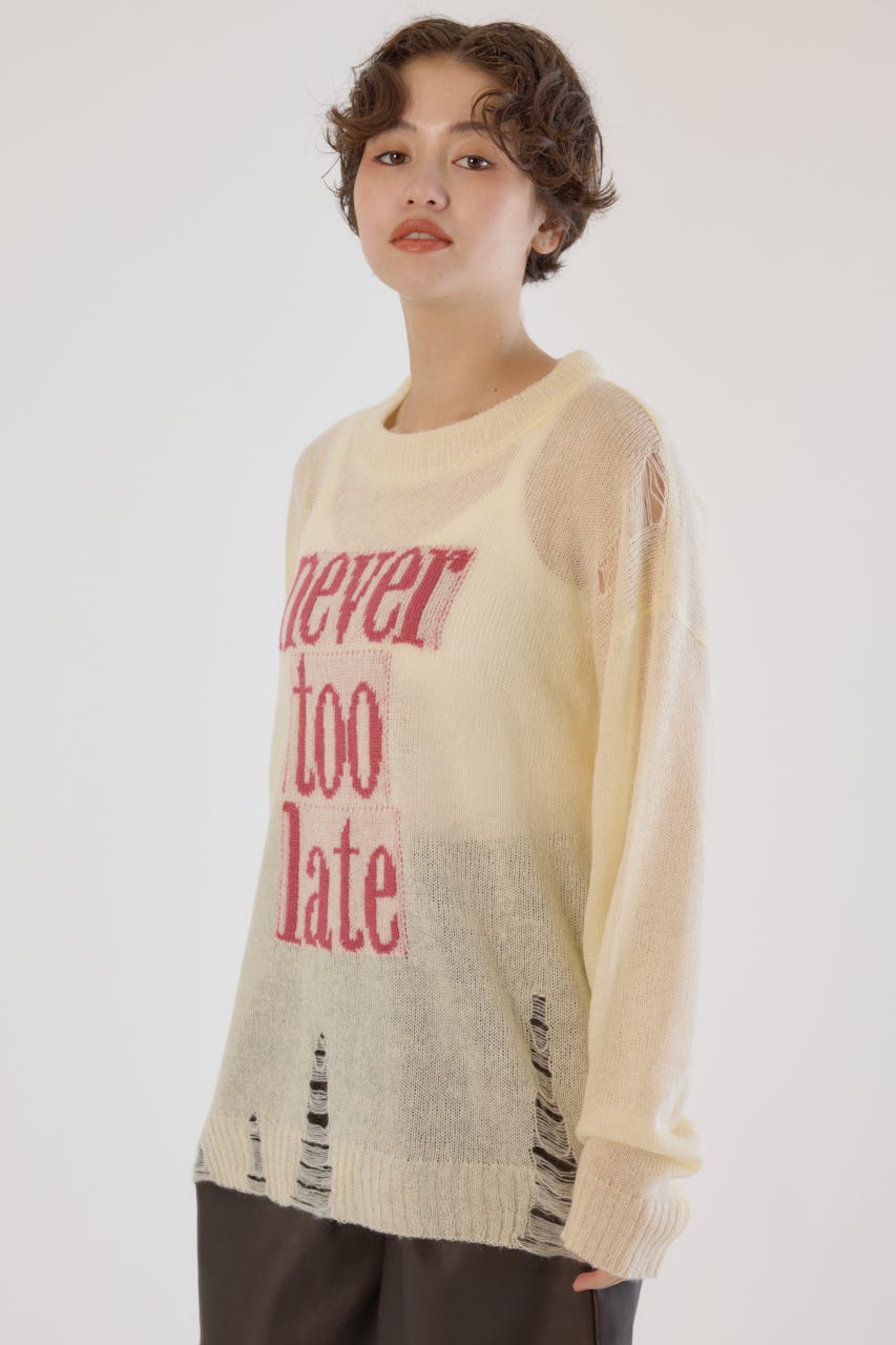 メッセージの配色がポイントで大胆なダメージを加え、エッジを効かせたデザインのニット。