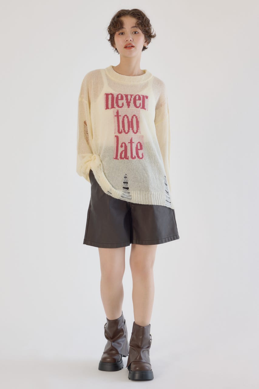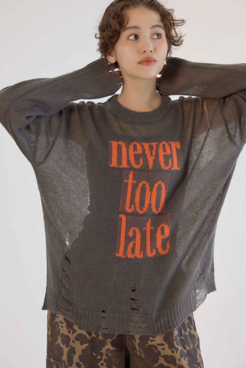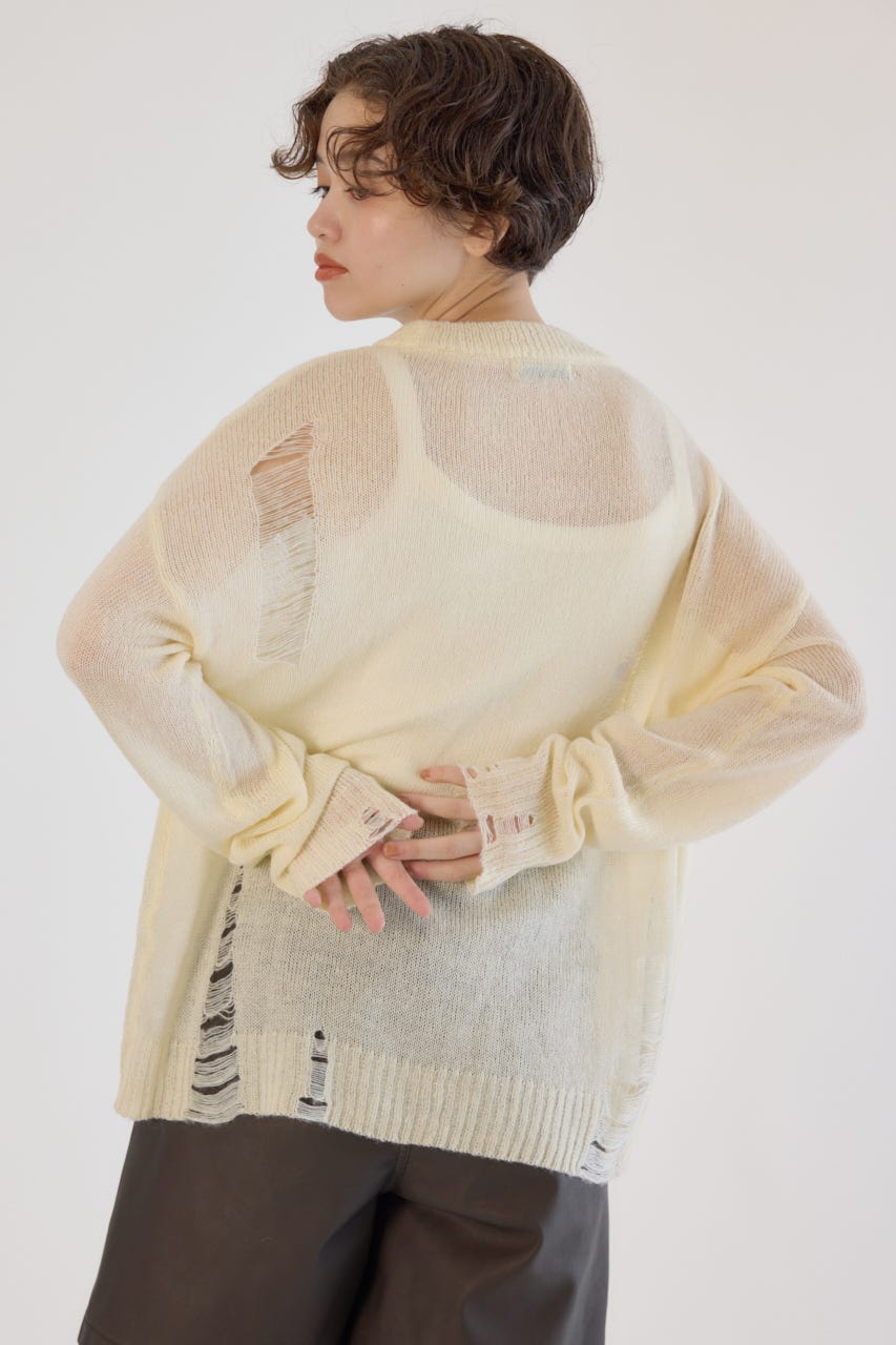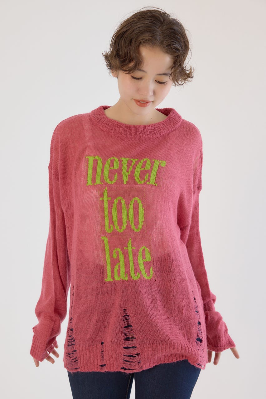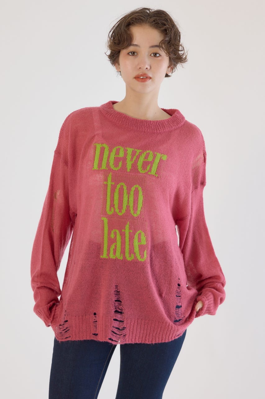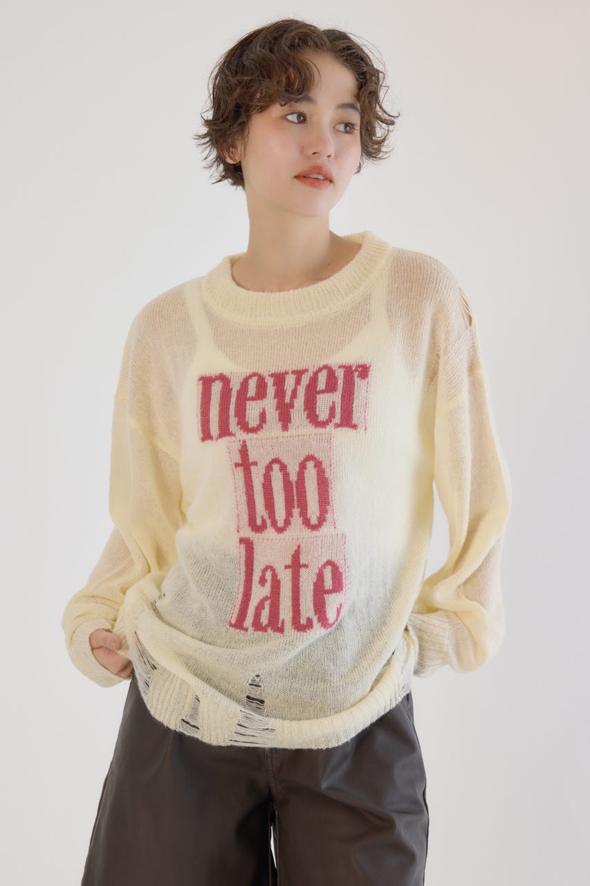 メッセージの配色がポイントで大胆なダメージを加え、エッジを効かせたデザインのニット。