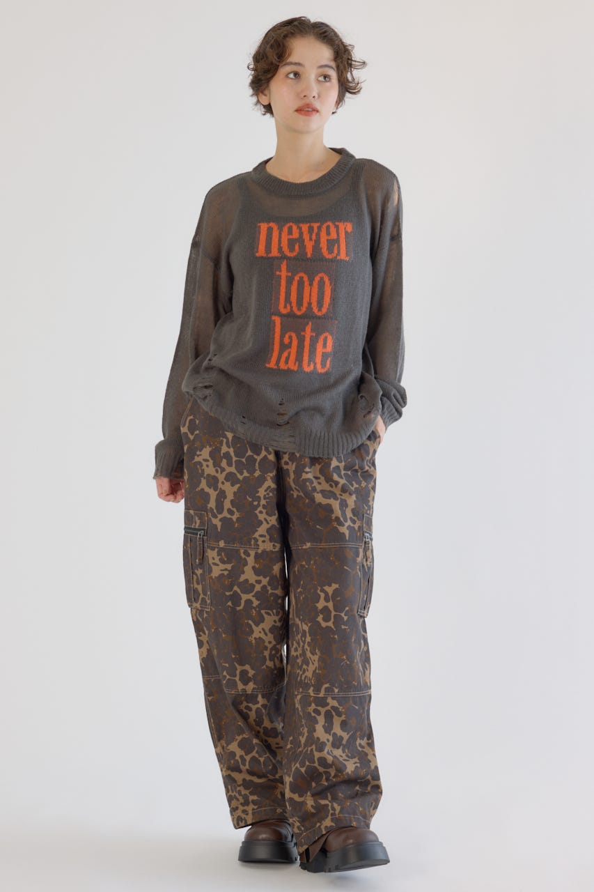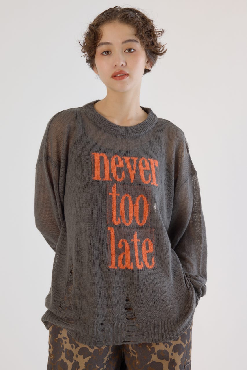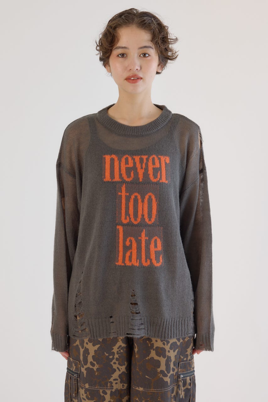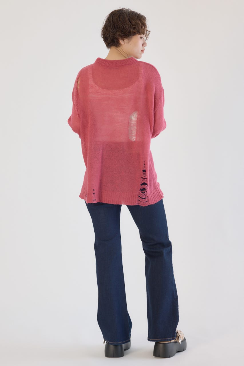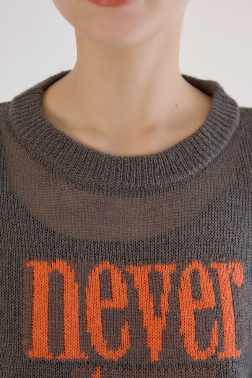 メッセージの配色がポイントで大胆なダメージを加え、エッジを効かせたデザインのニット。