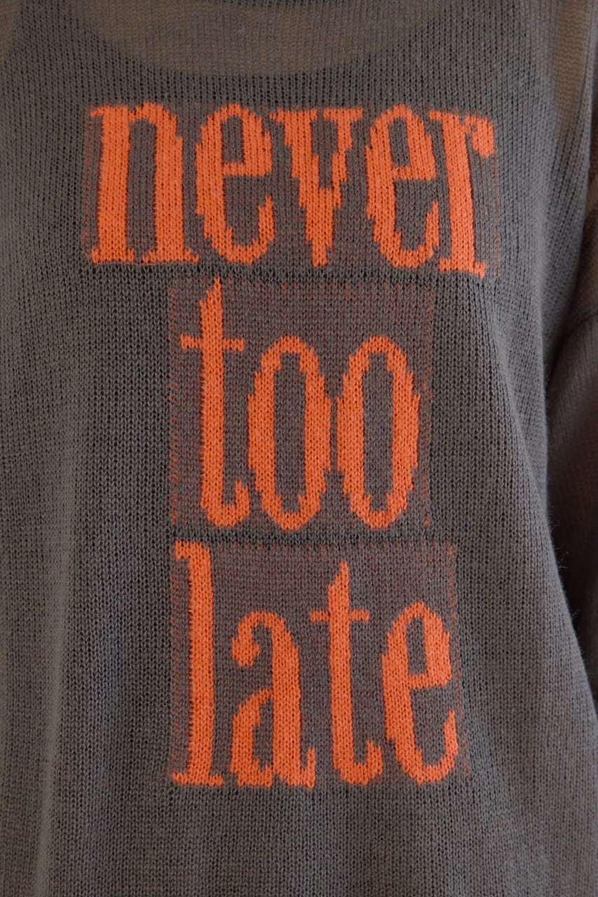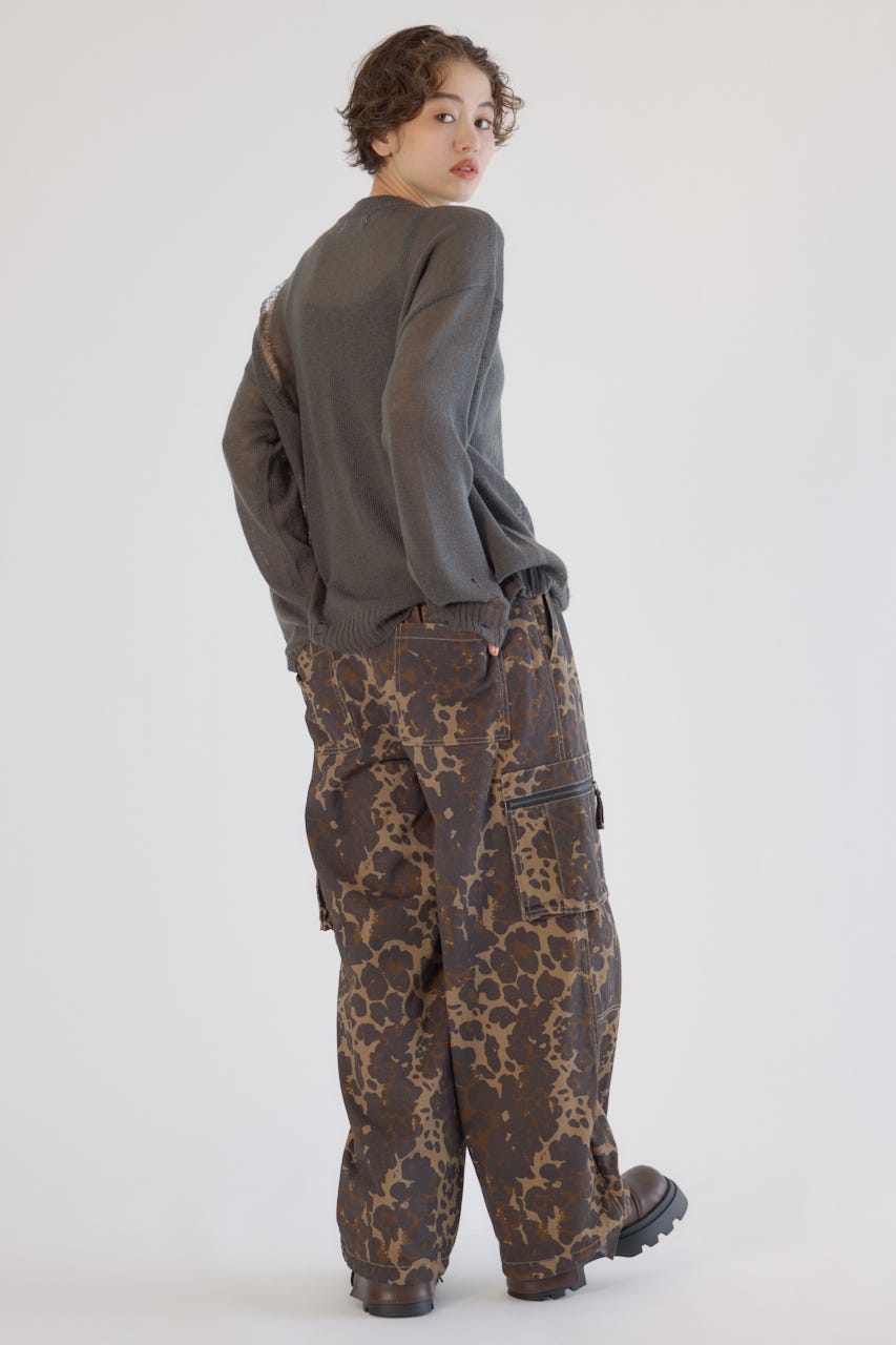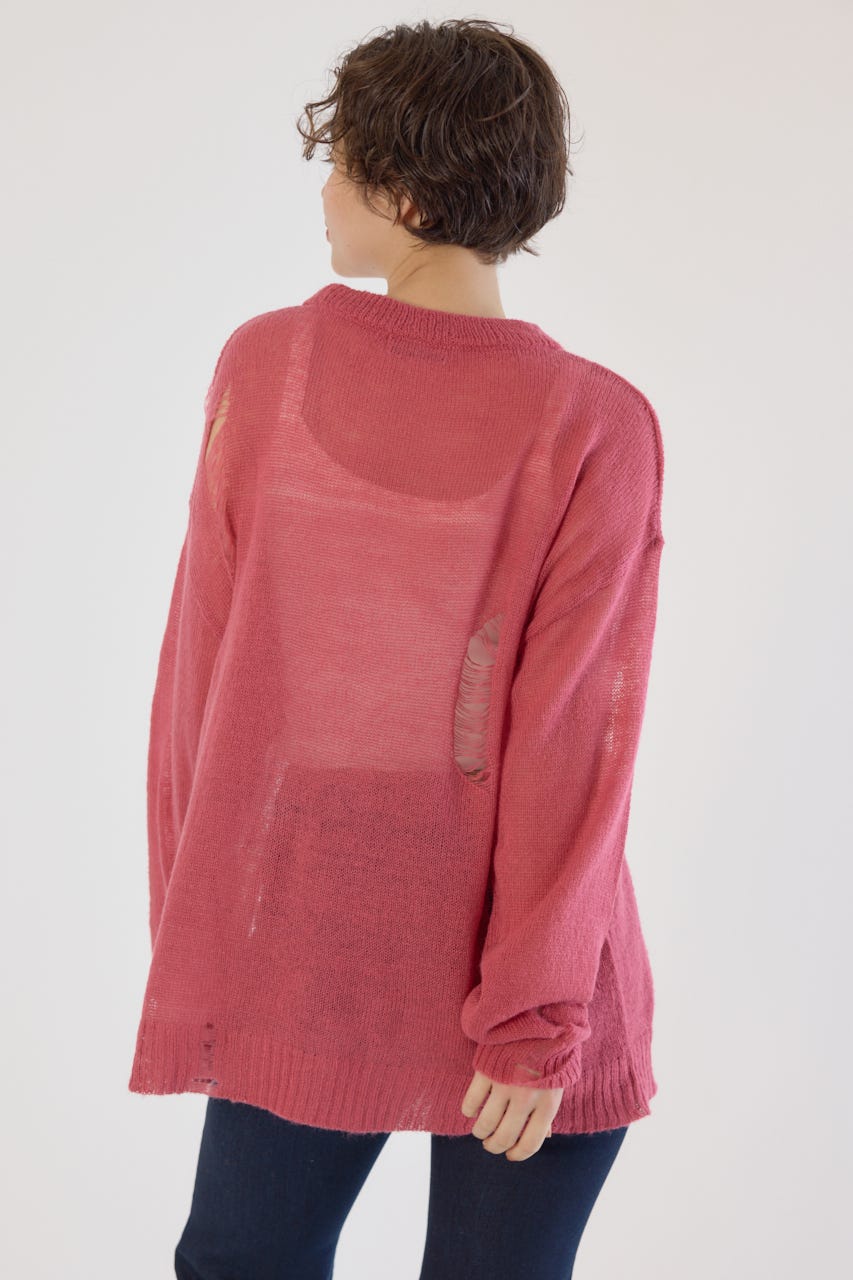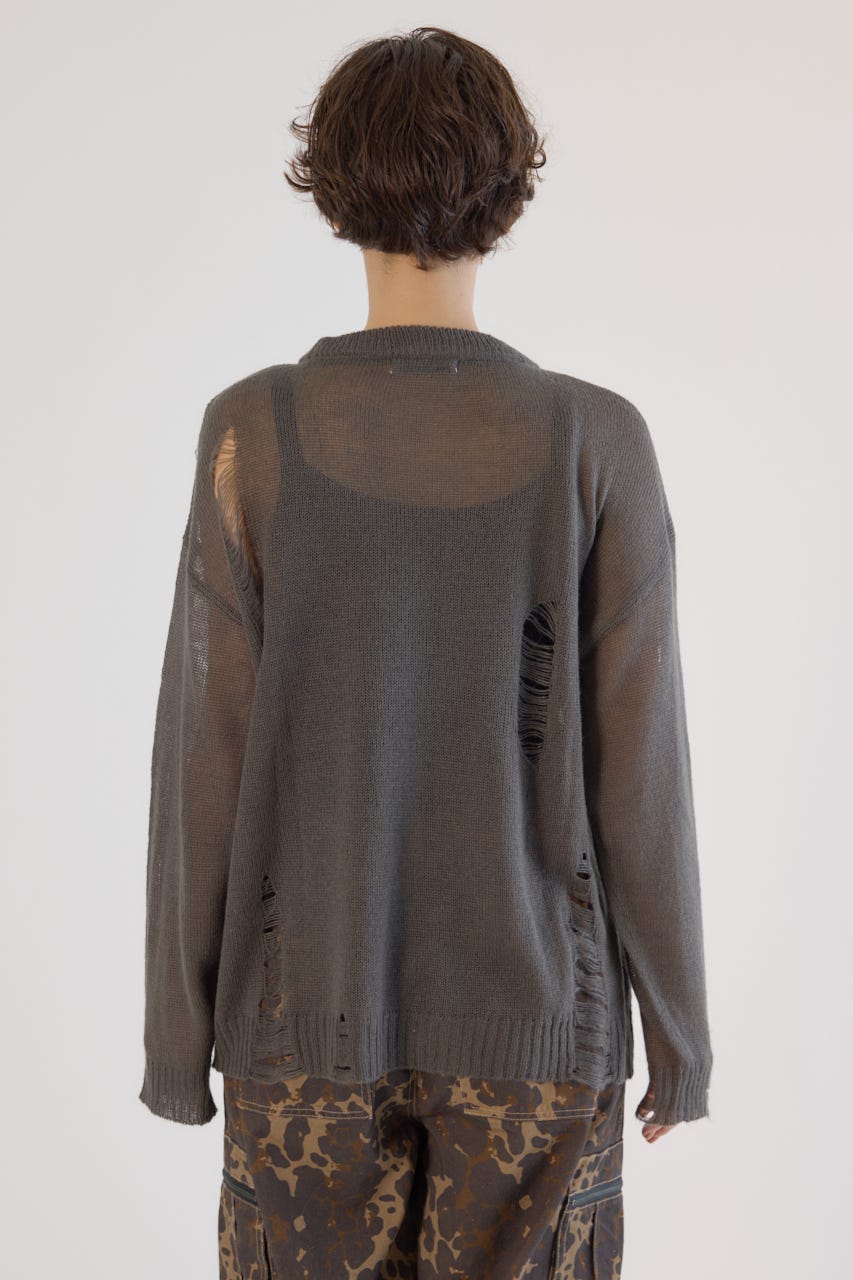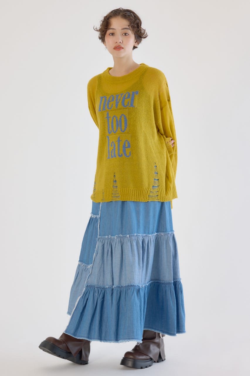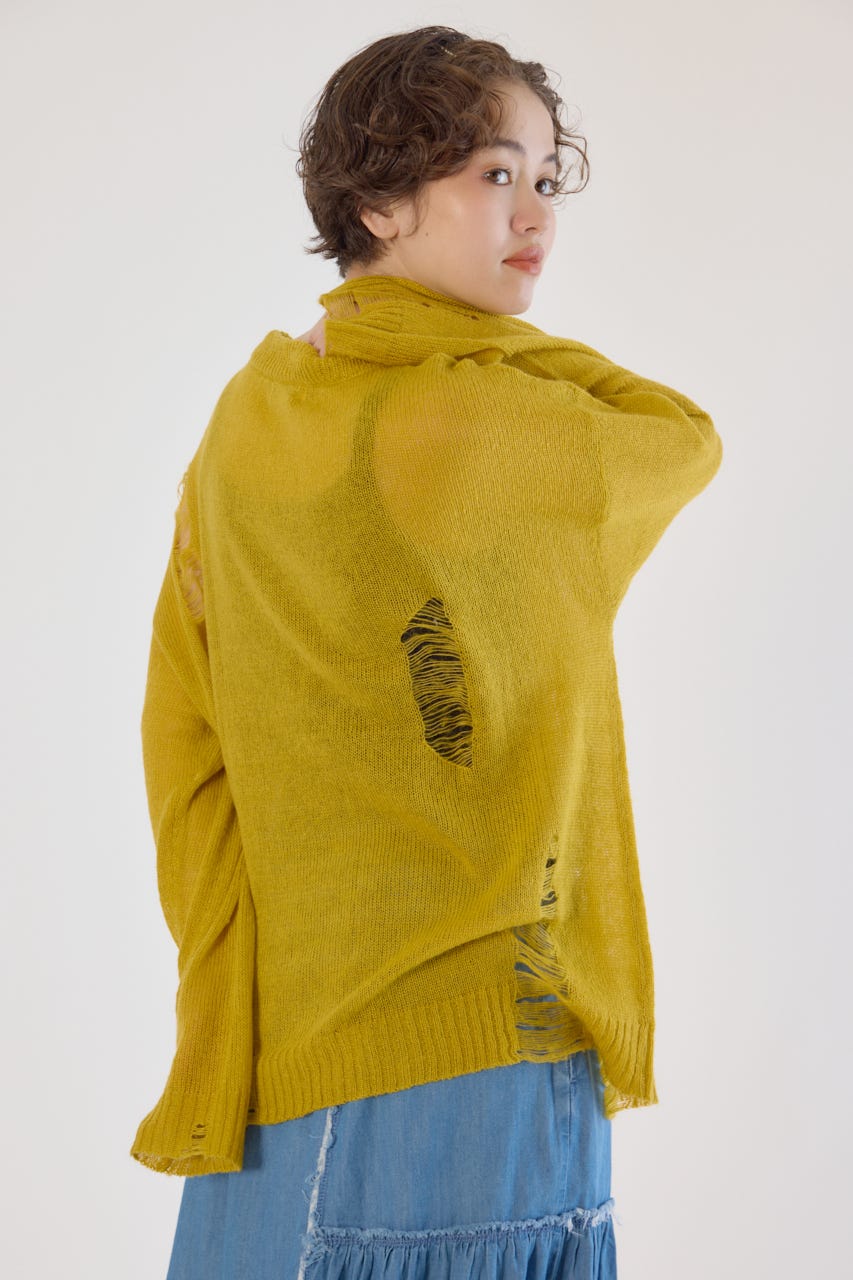 メッセージの配色がポイントで大胆なダメージを加え、エッジを効かせたデザインのニット。
