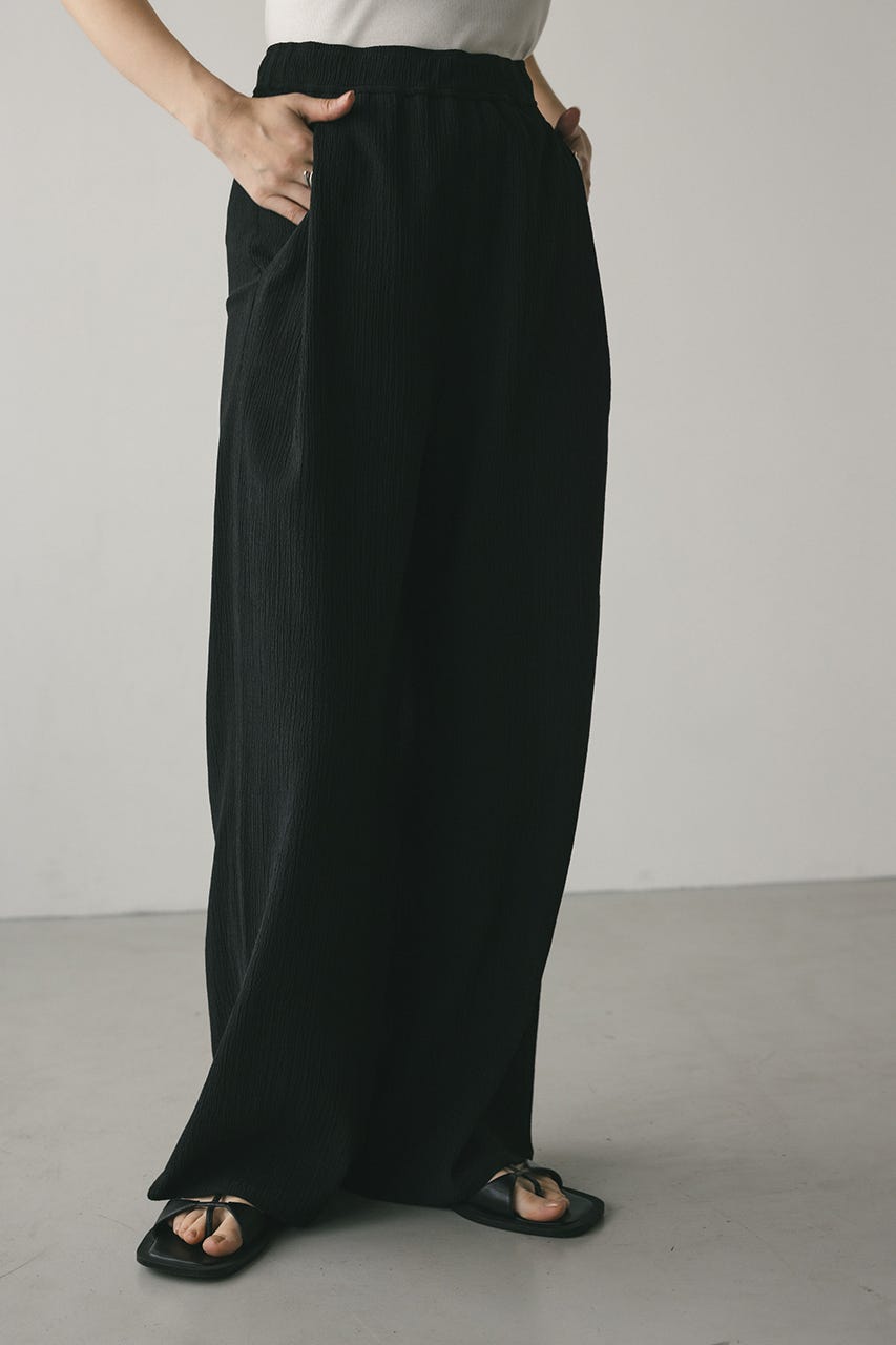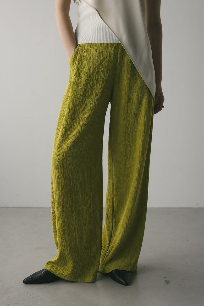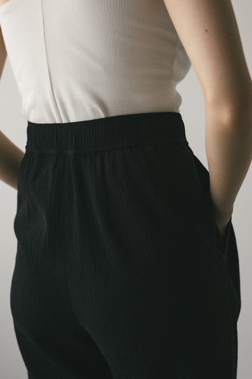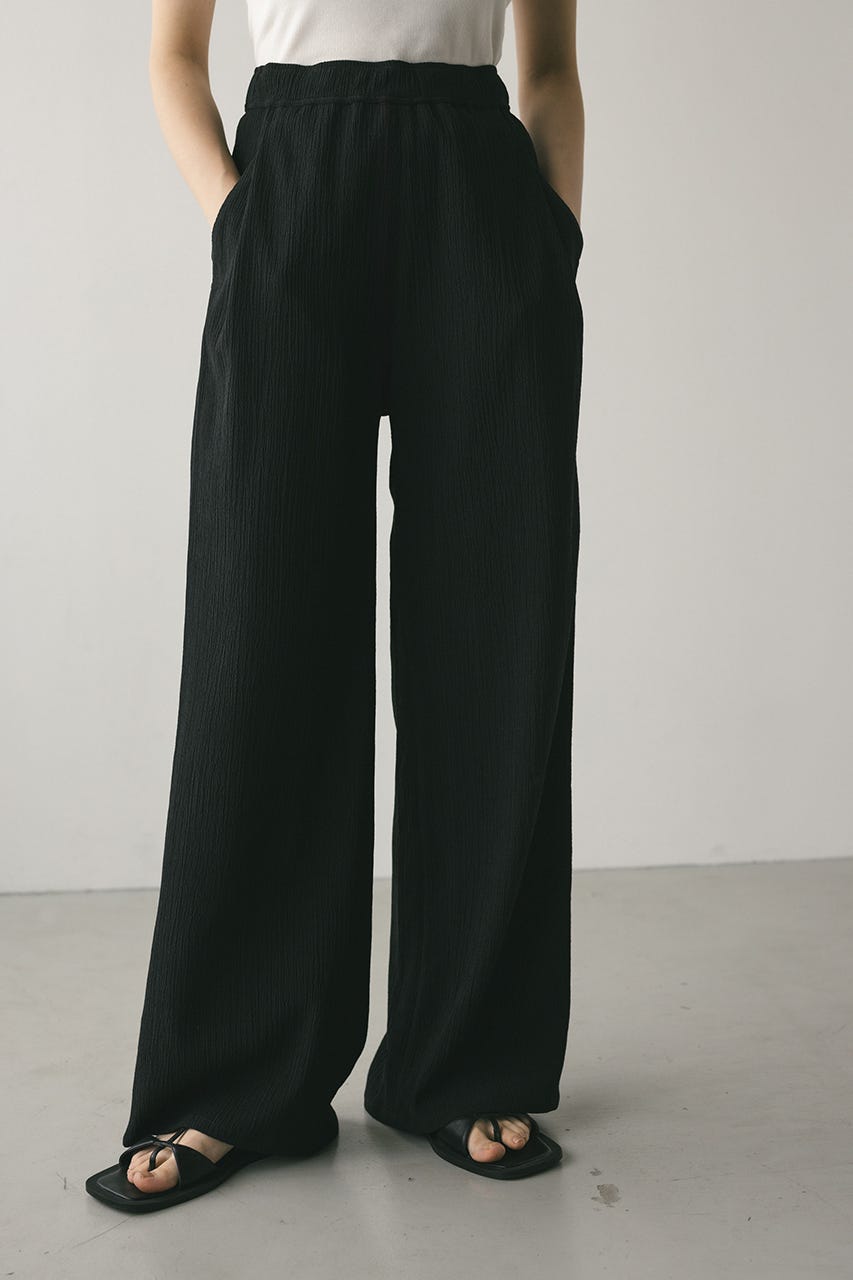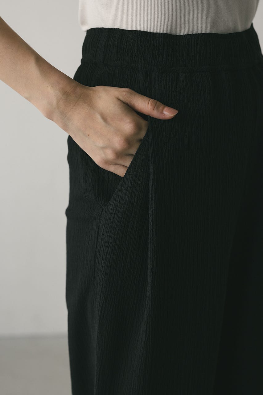 細かいシャーリング加工を施したストレッチ素材を使用したドライタッチなワイドパンツ。
