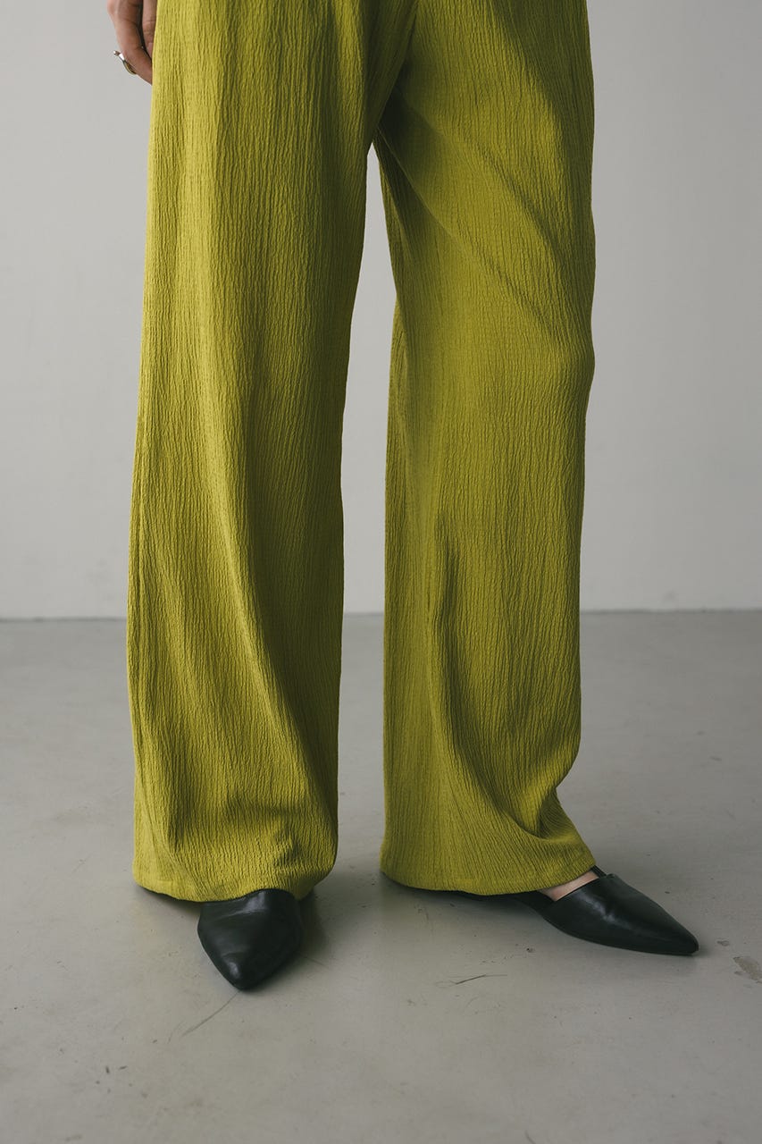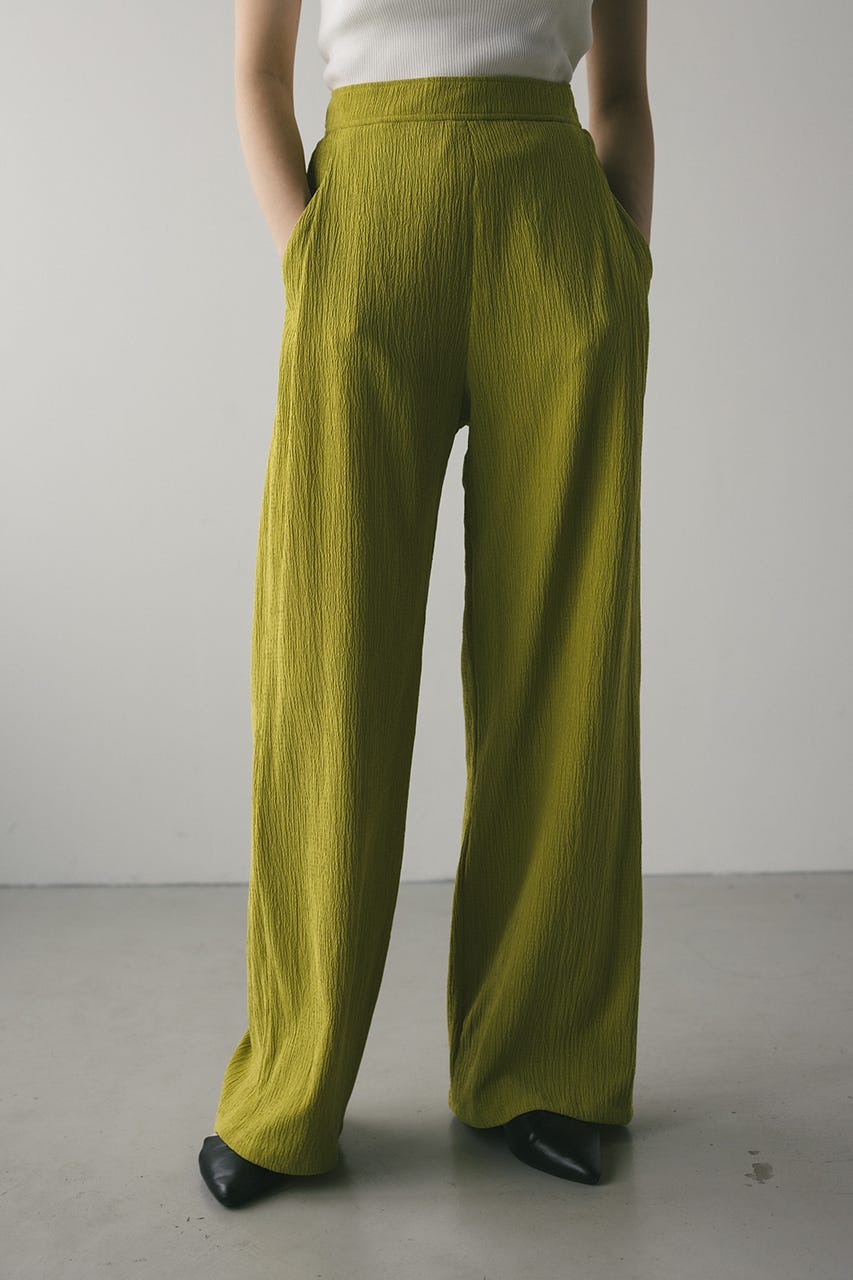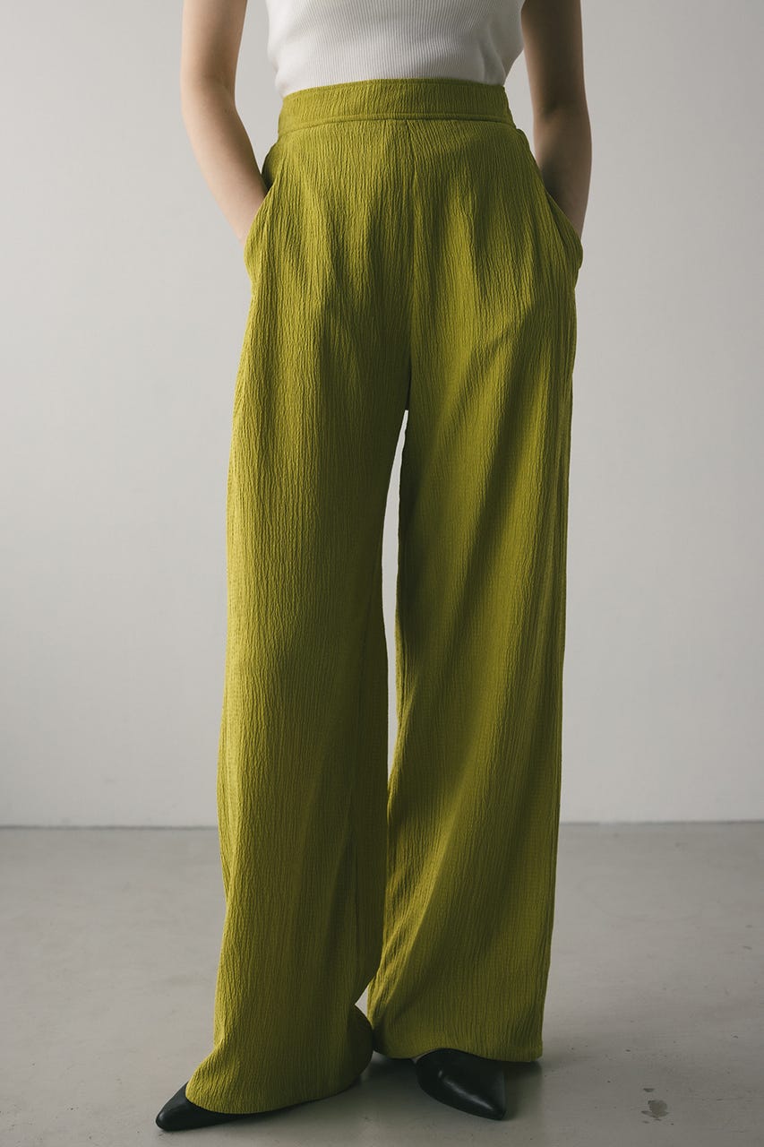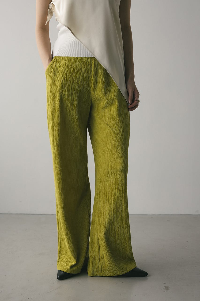細かいシャーリング加工を施したストレッチ素材を使用したドライタッチなワイドパンツ。