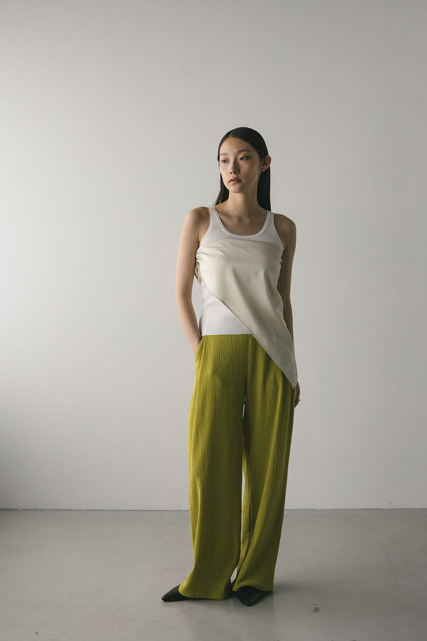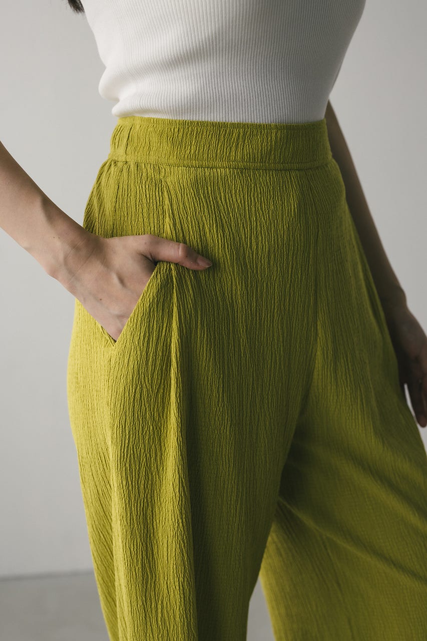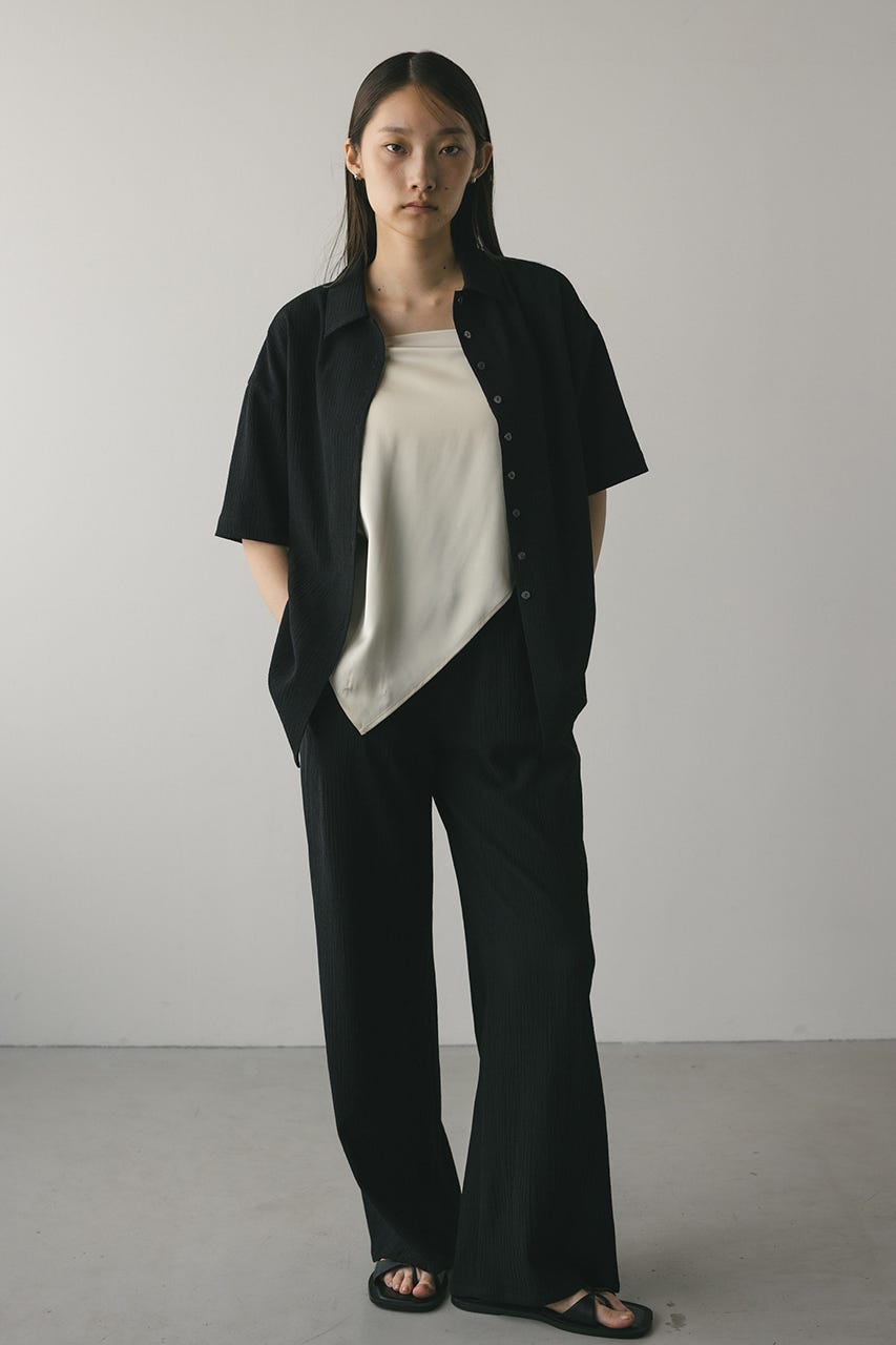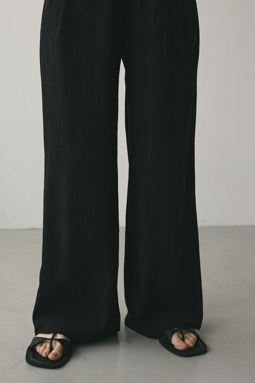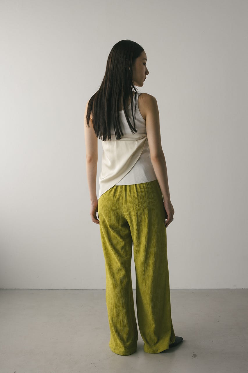 細かいシャーリング加工を施したストレッチ素材を使用したドライタッチなワイドパンツ。