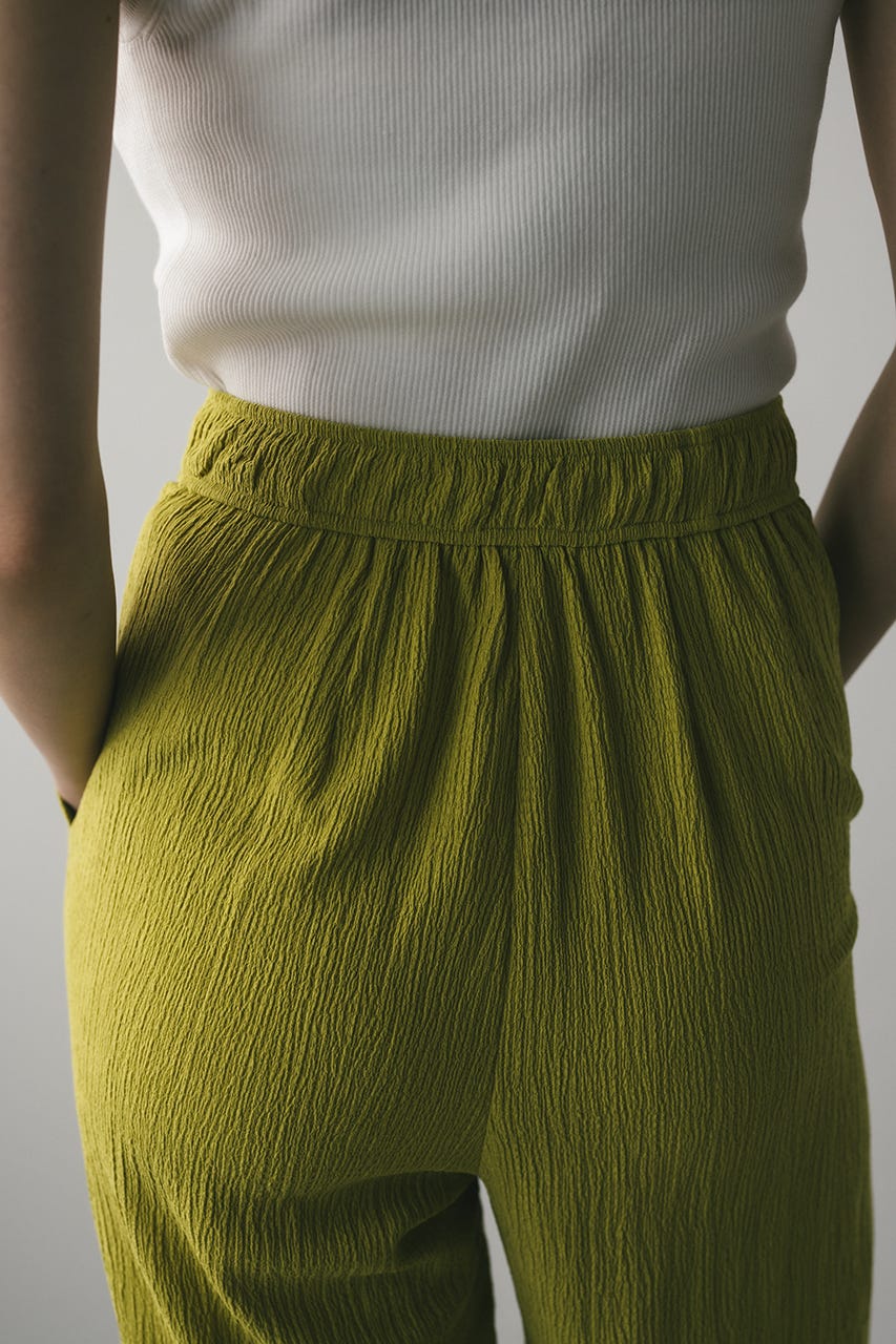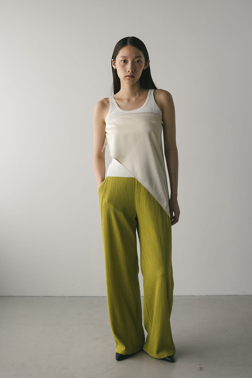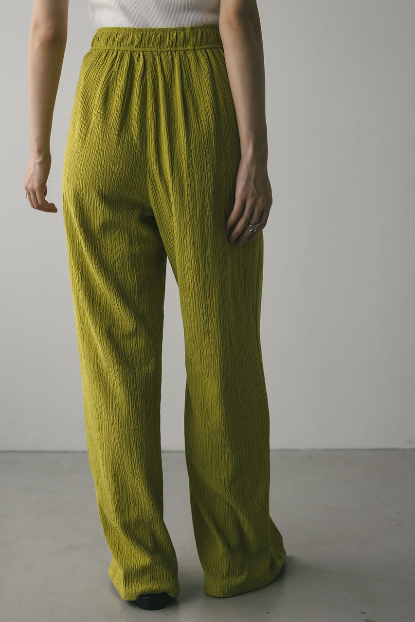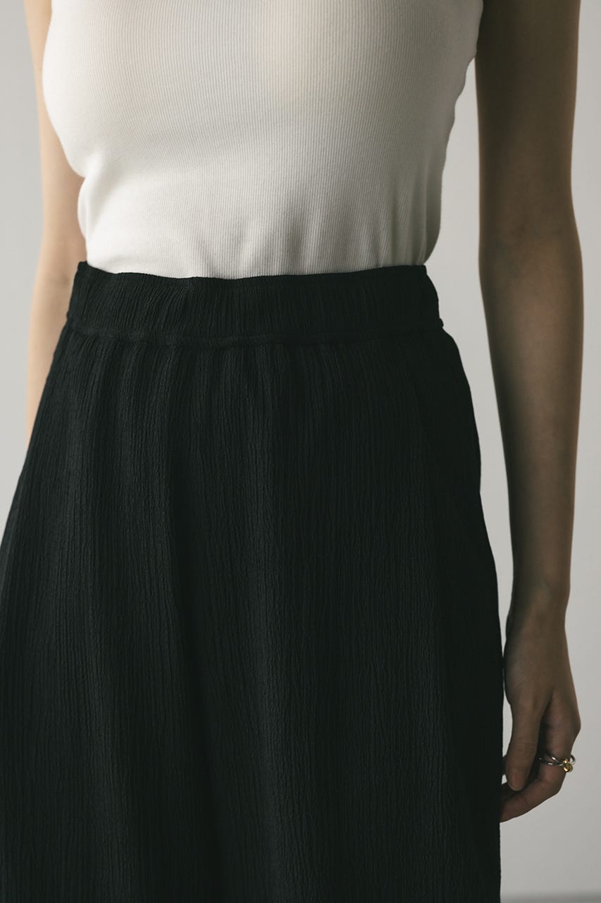 細かいシャーリング加工を施したストレッチ素材を使用したドライタッチなワイドパンツ。