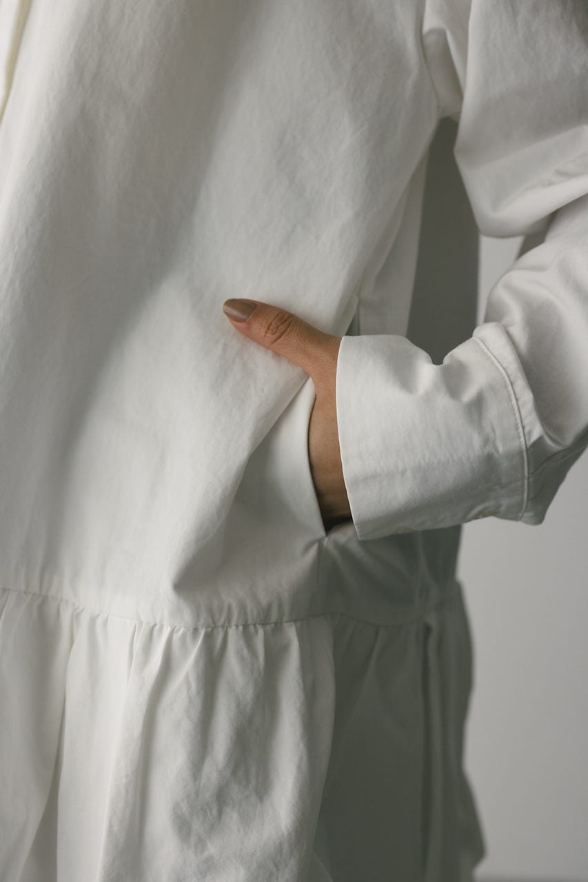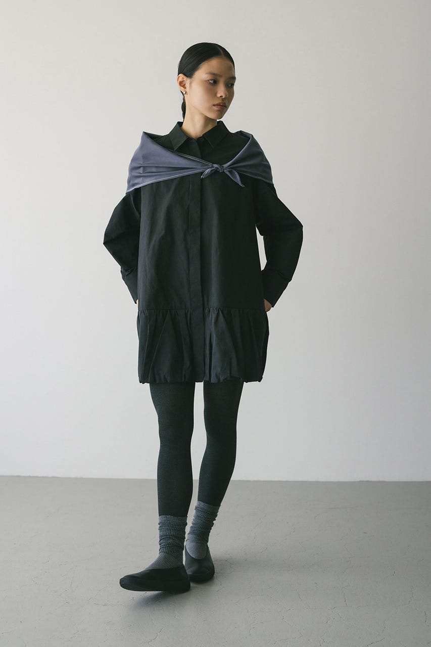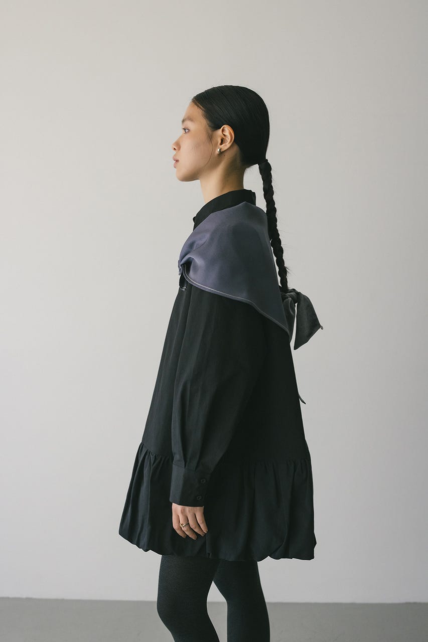 シャツ衿とワイドスリーブでモード要素をプラスすることで、甘くなりすぎない大人なミニワンピースに仕上げました。