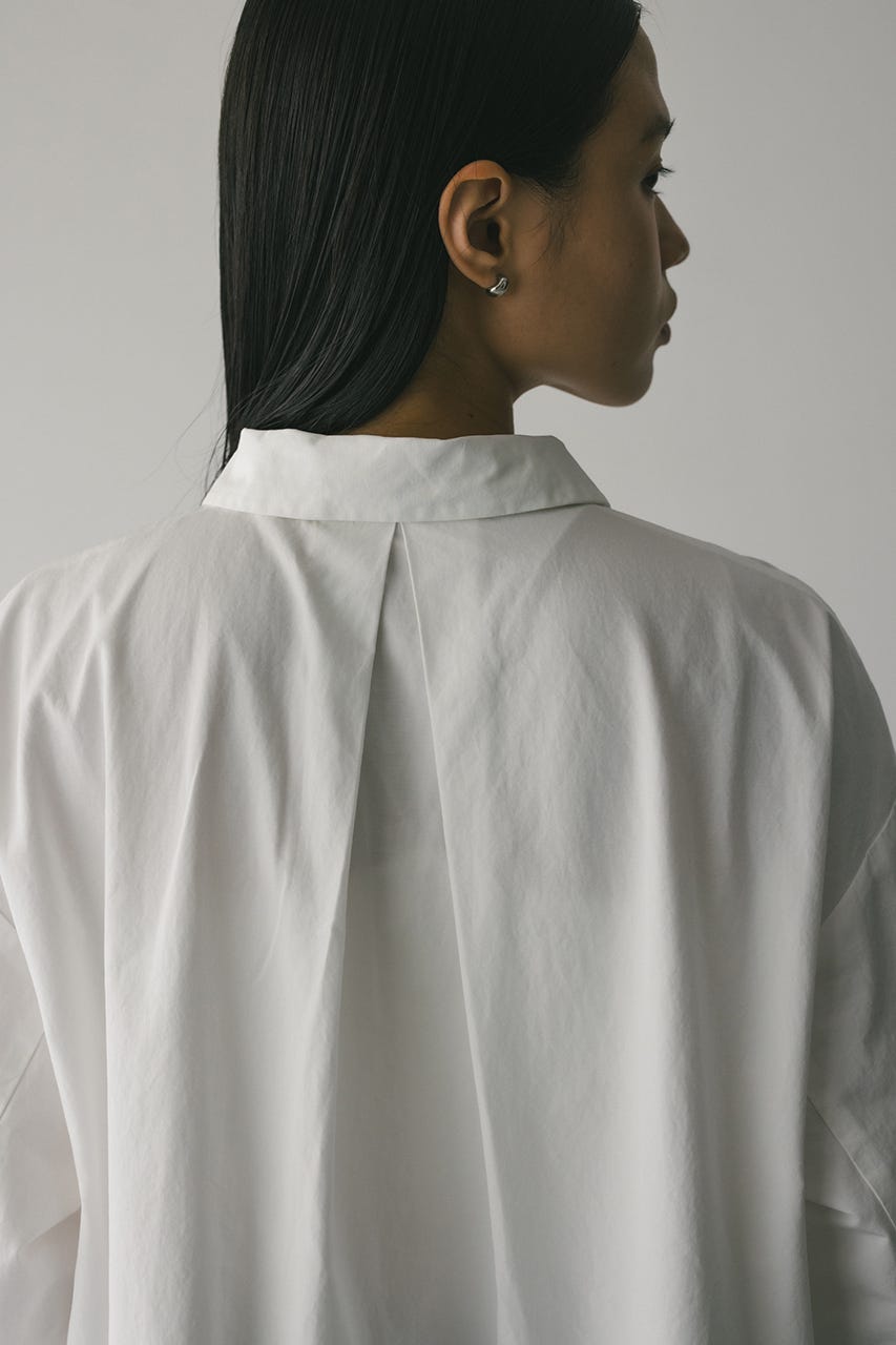程よいハリ感と柔らかさをあわせもったクリアな表面感の素材を使用しているので、ボリュームシルエットでも軽い着心地で着膨れもしにくい一枚。