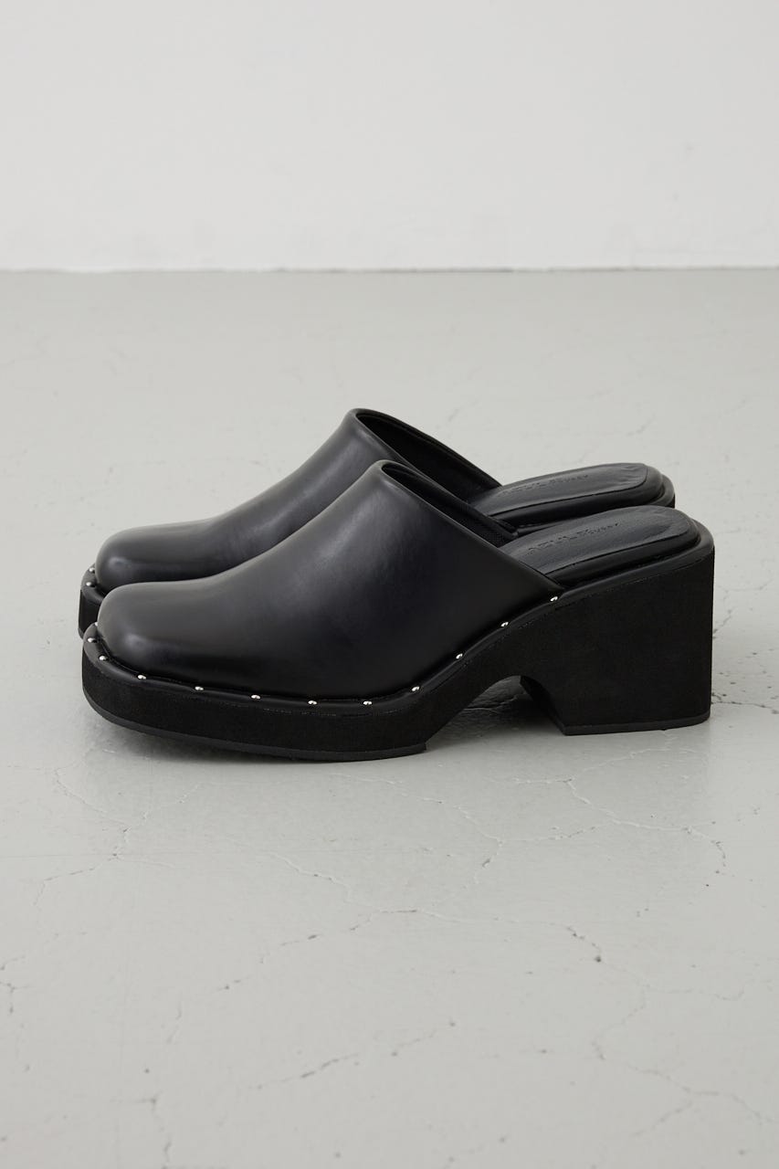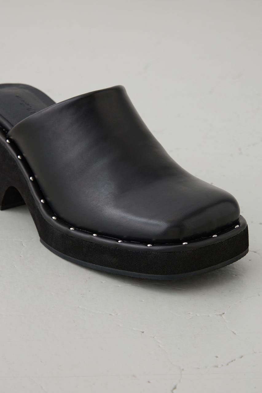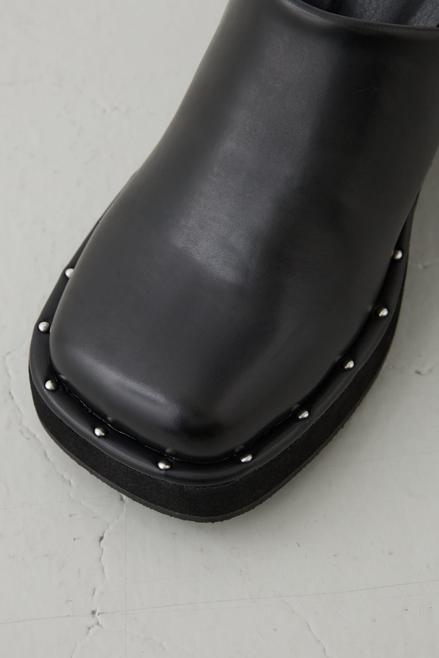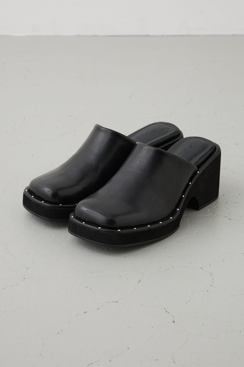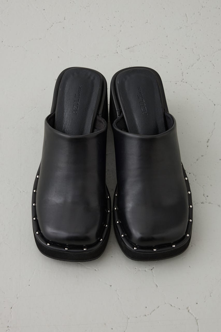 トレンドのスタッズをあしらった、モードな雰囲気漂うスクエアトゥミュール。