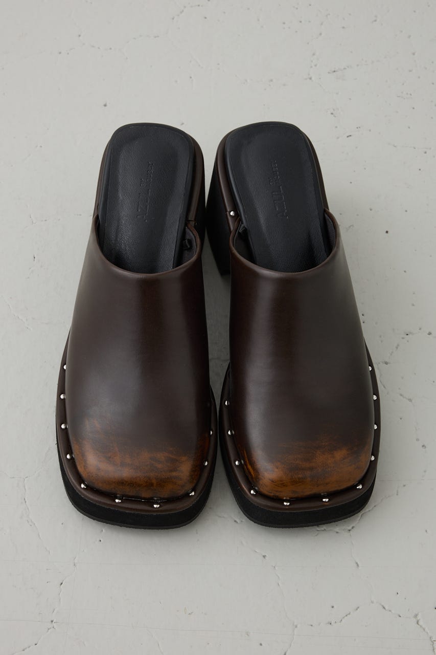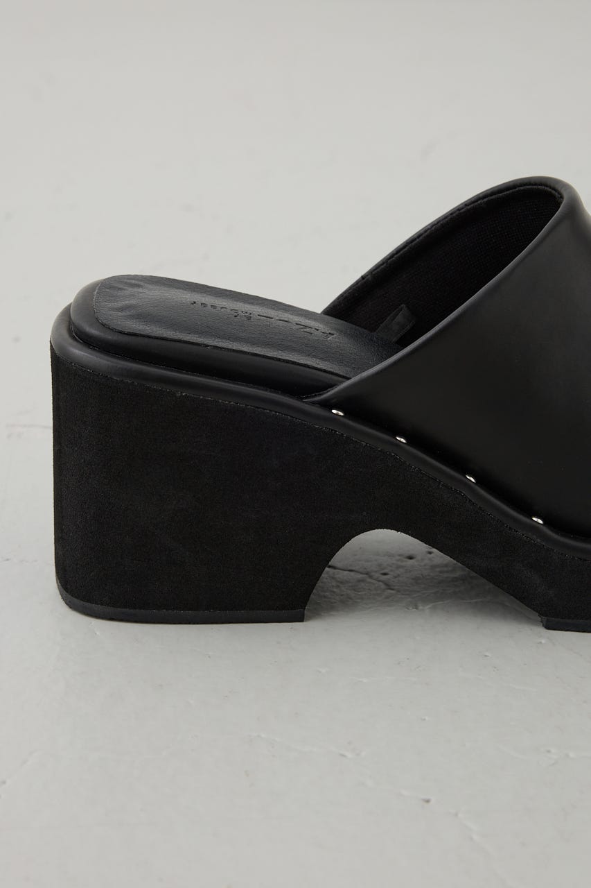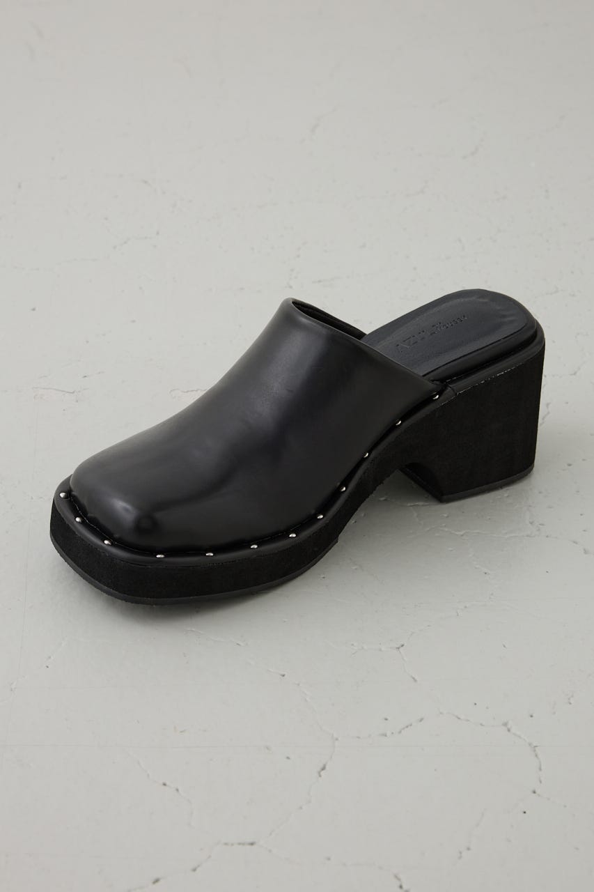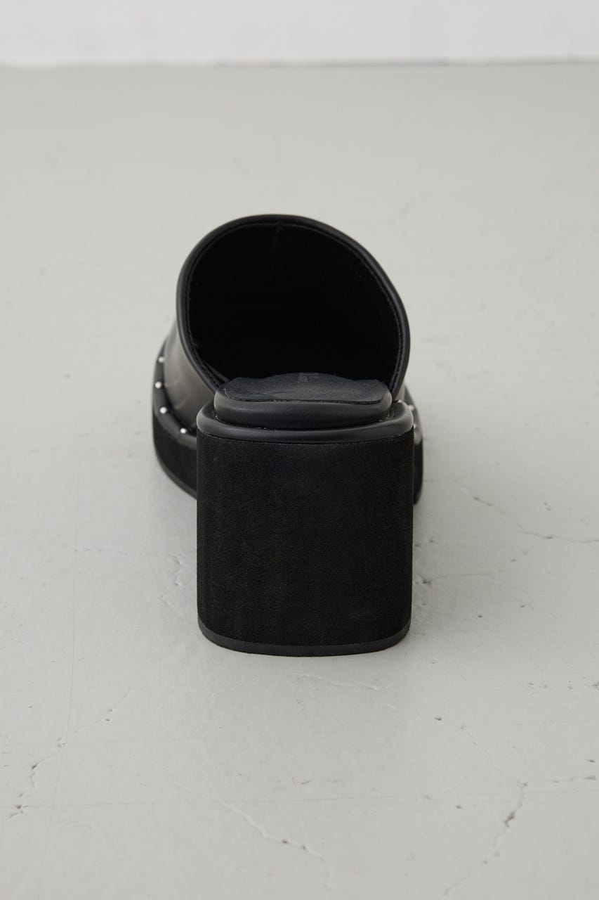 トレンドのスタッズをあしらった、モードな雰囲気漂うスクエアトゥミュール。