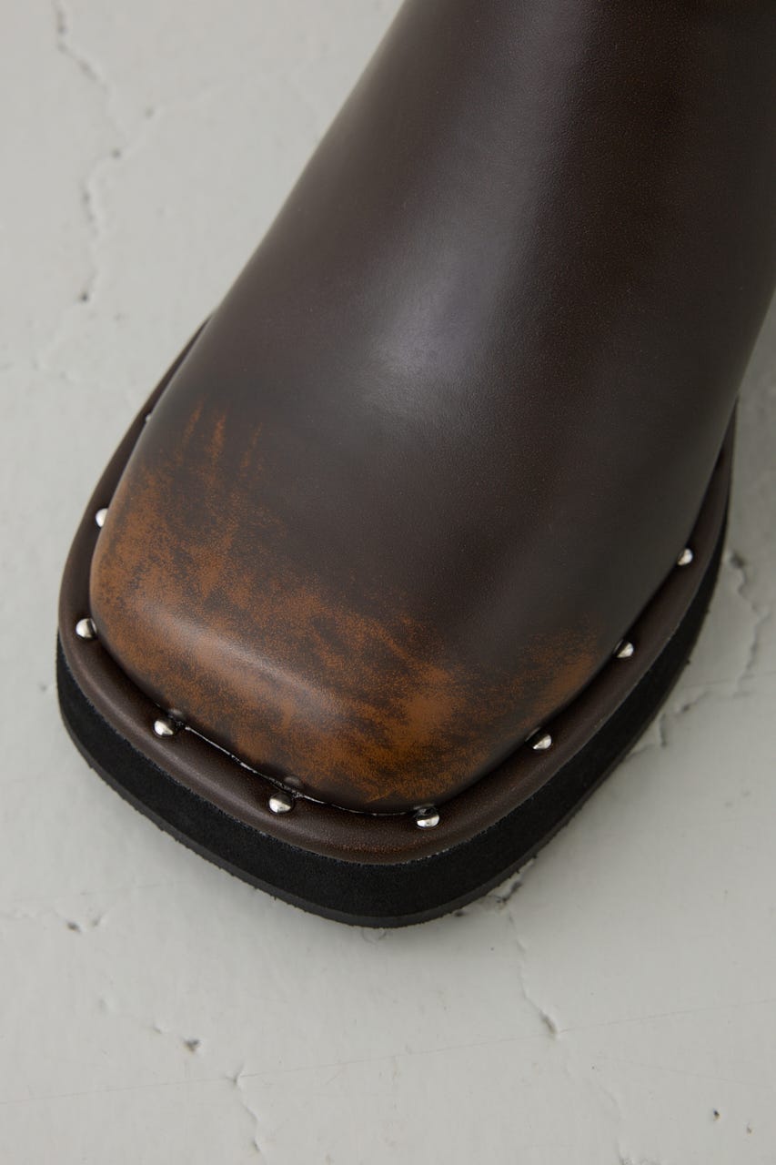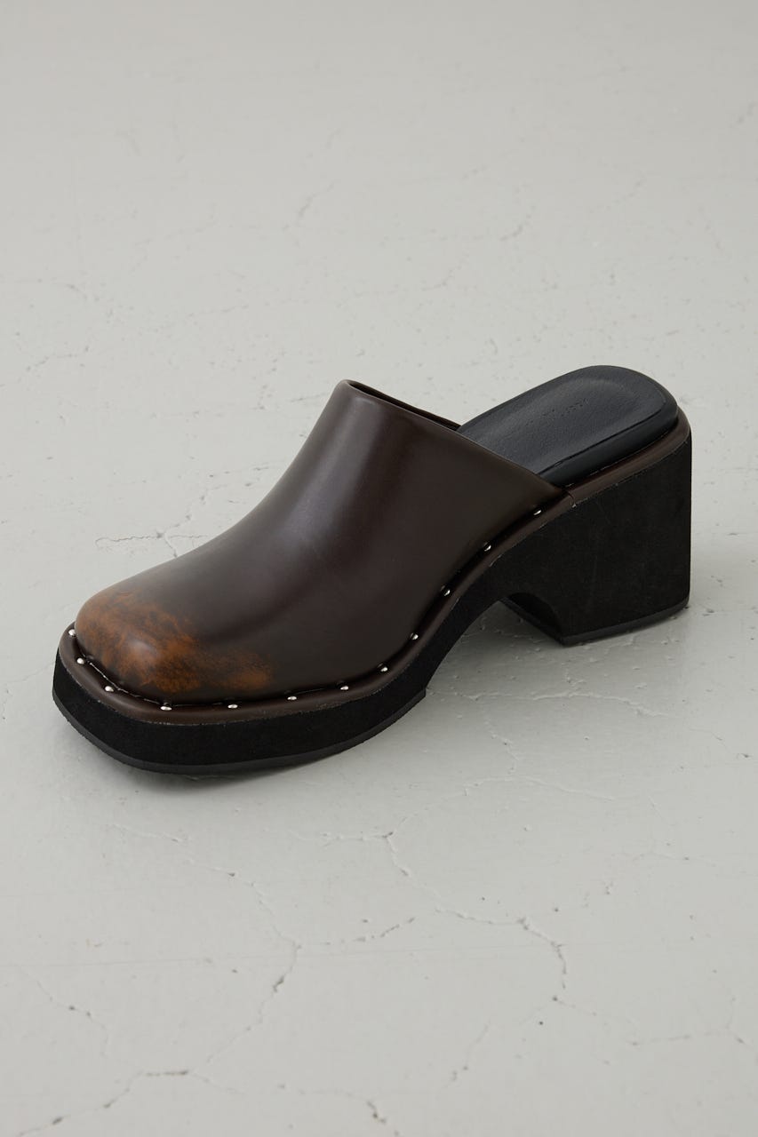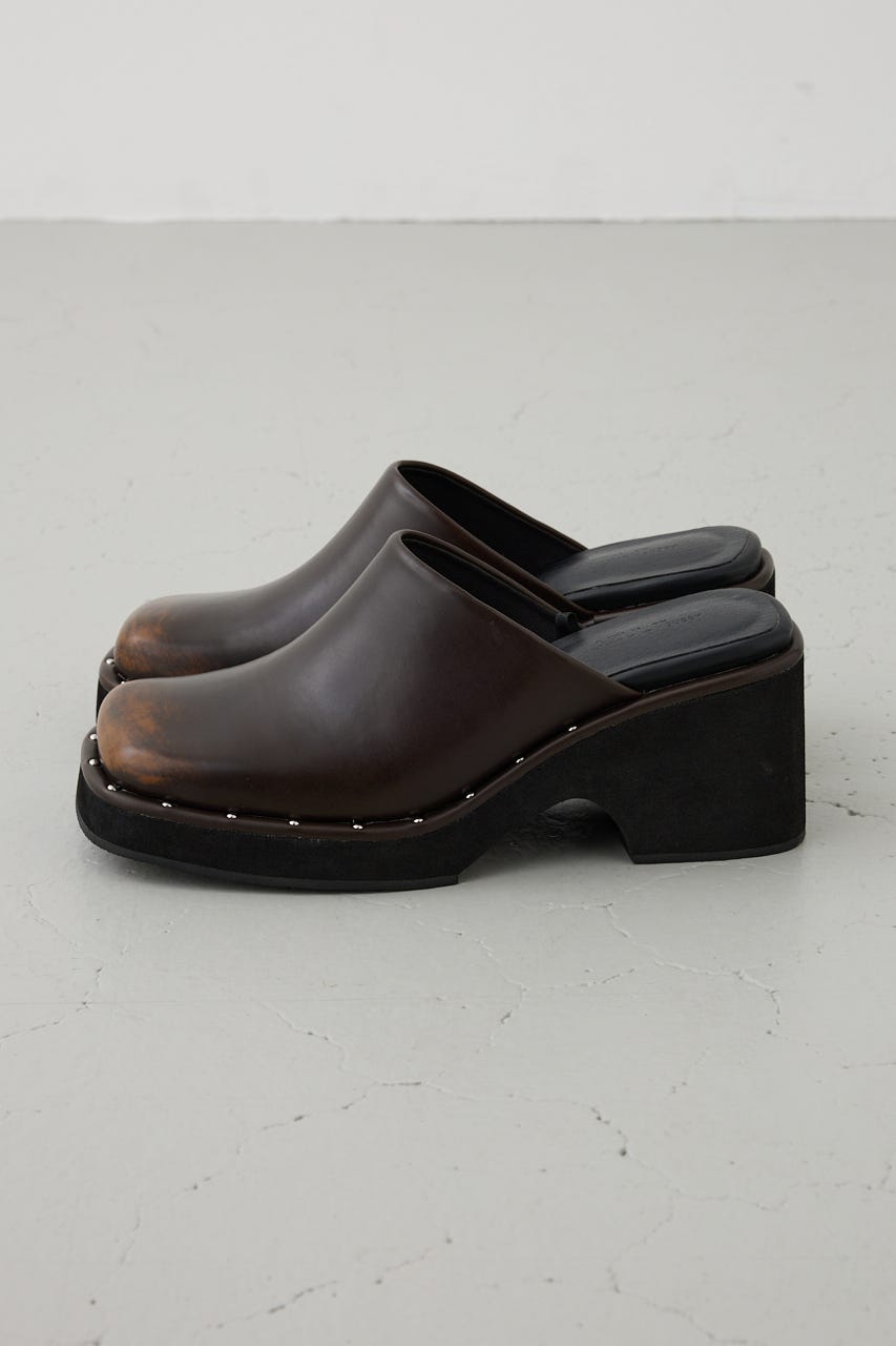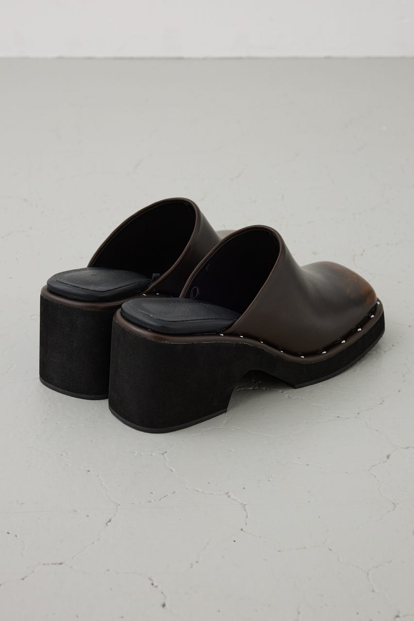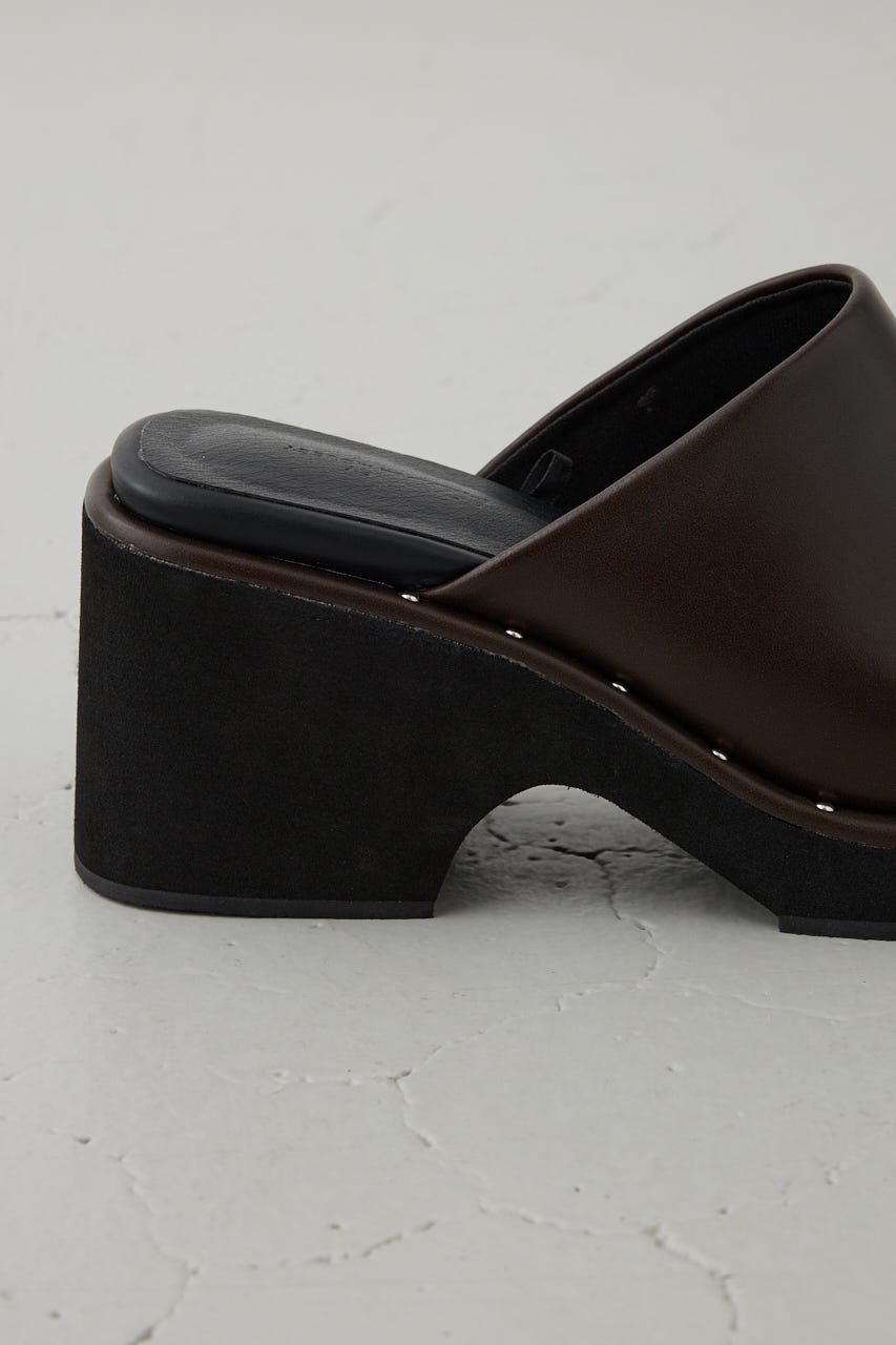トレンドのスタッズをあしらった、モードな雰囲気漂うスクエアトゥミュール。