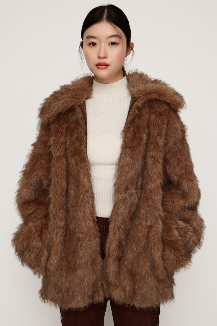 ■POINT:ボリュームたっぷりのビッグカラーが顔まわりを華やかに演出する、フェイクファーコート。