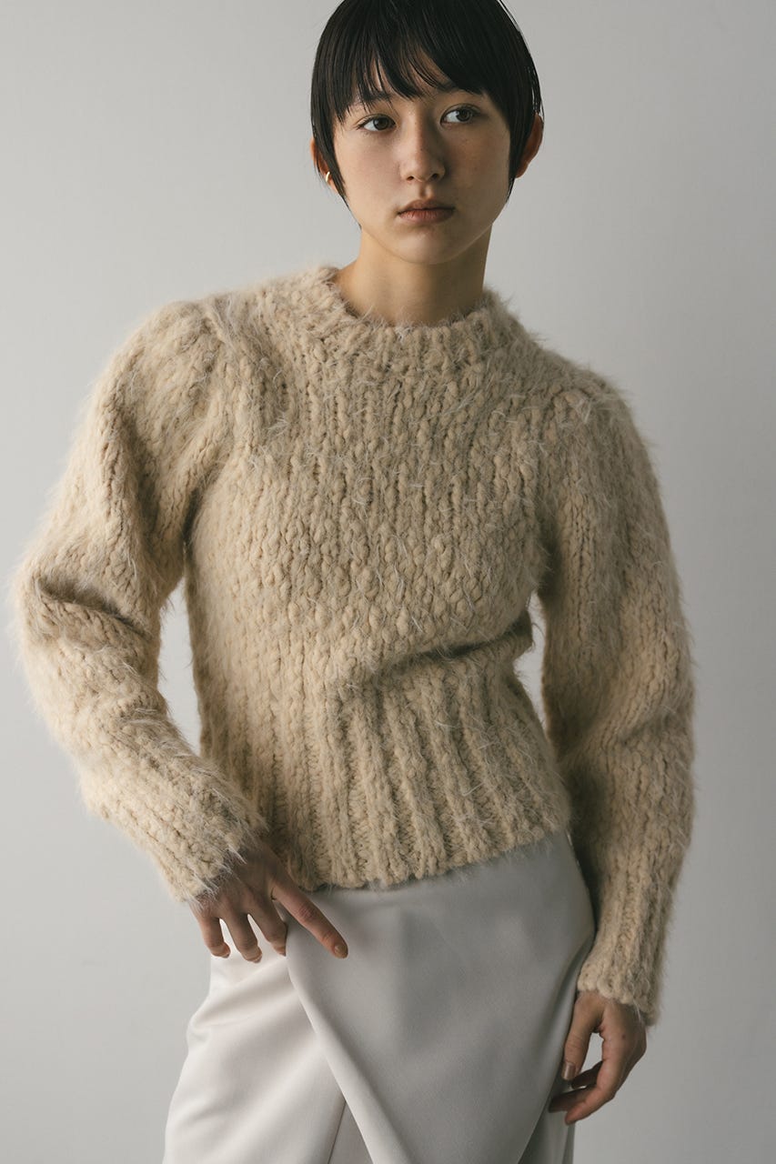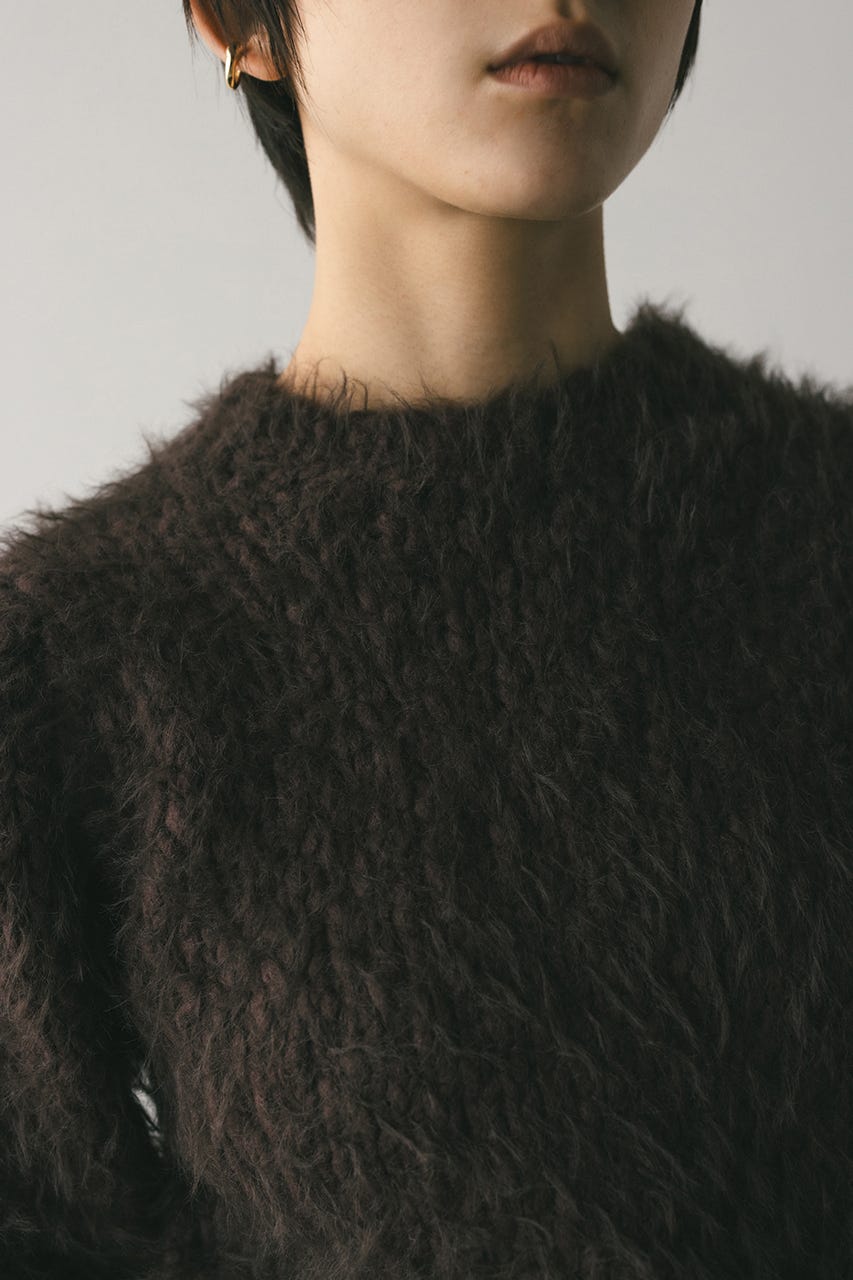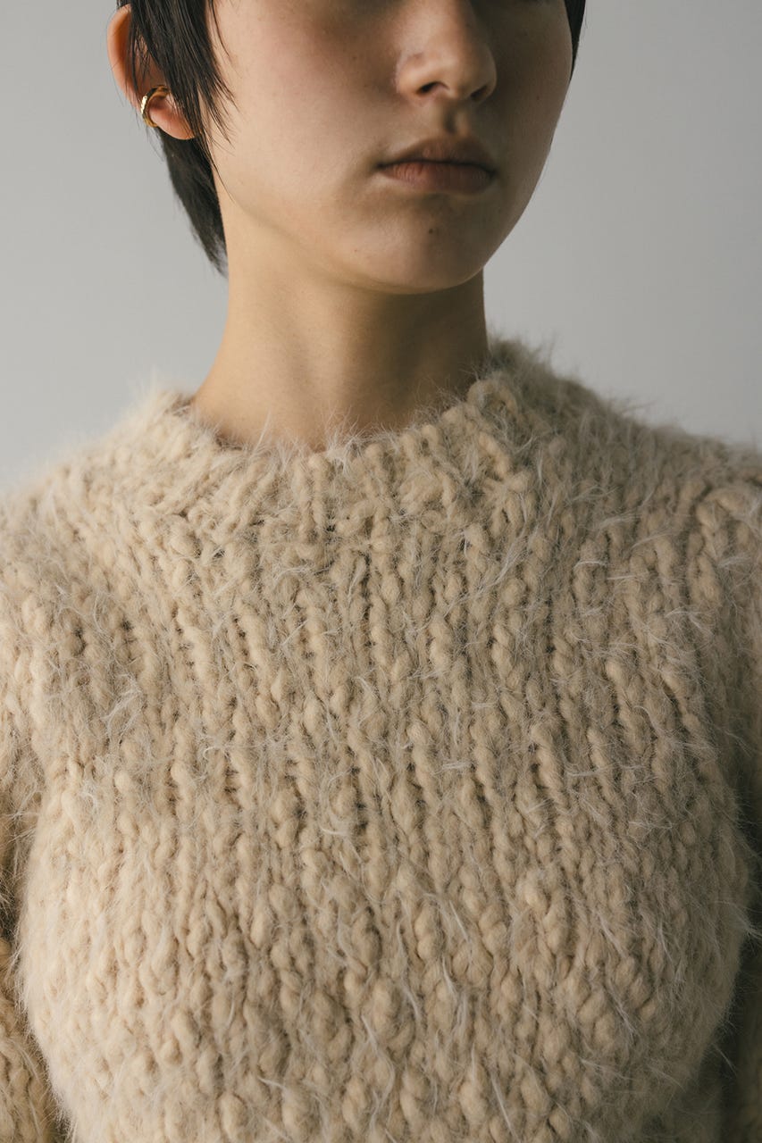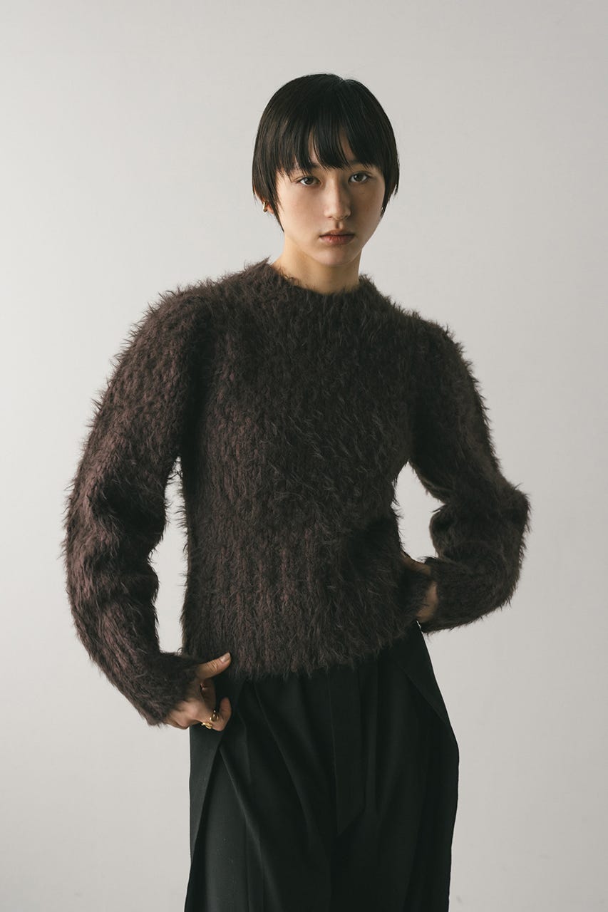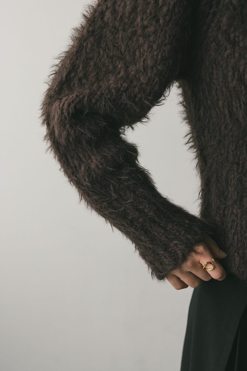 凹凸感のあるローゲージスラブ糸と毛足のあるシャギー糸を一緒に引き揃えて編み立てた暖かみのあるスラブシャギーニット。