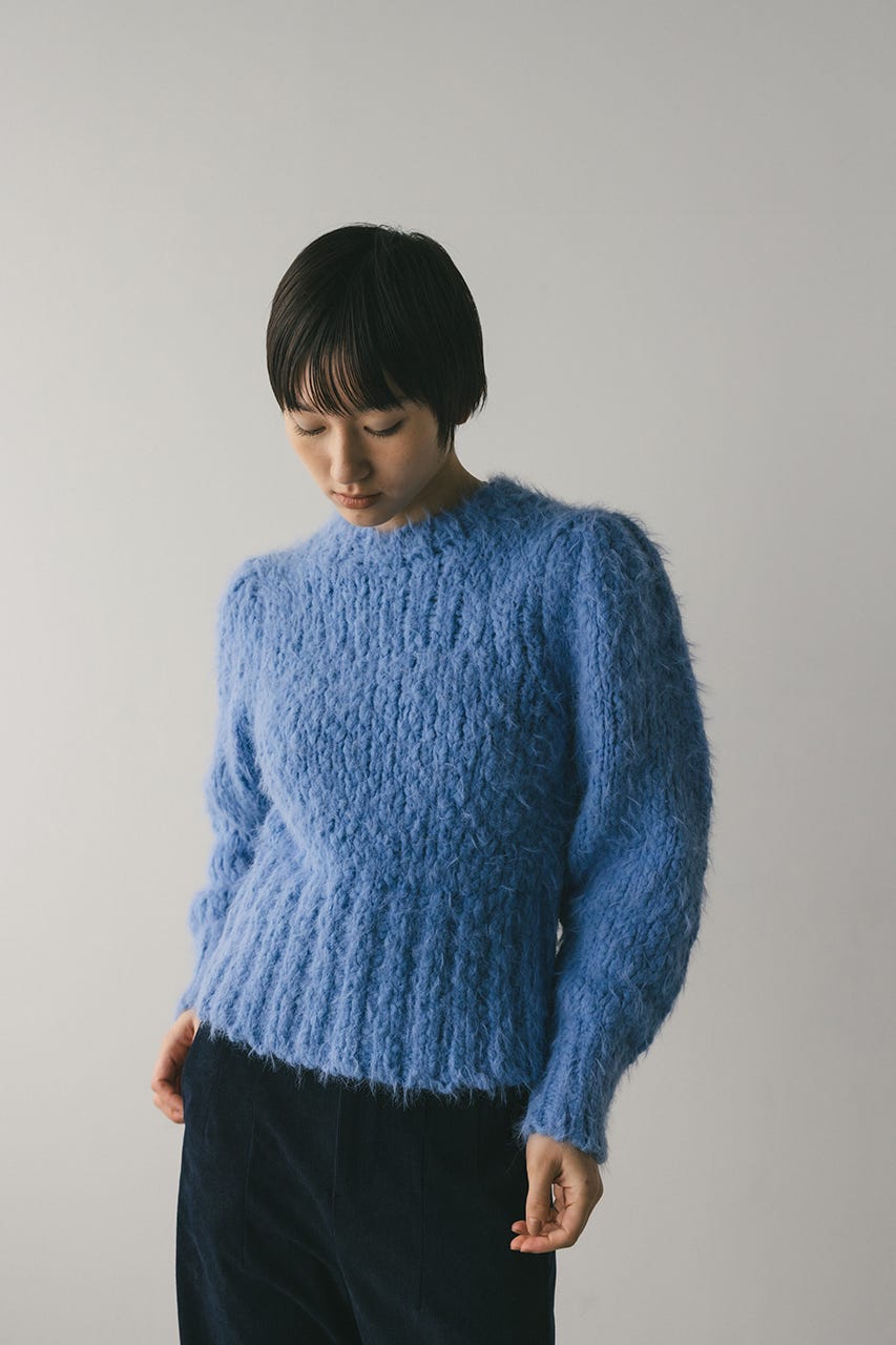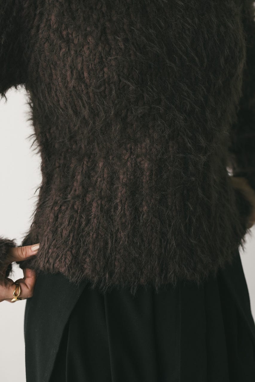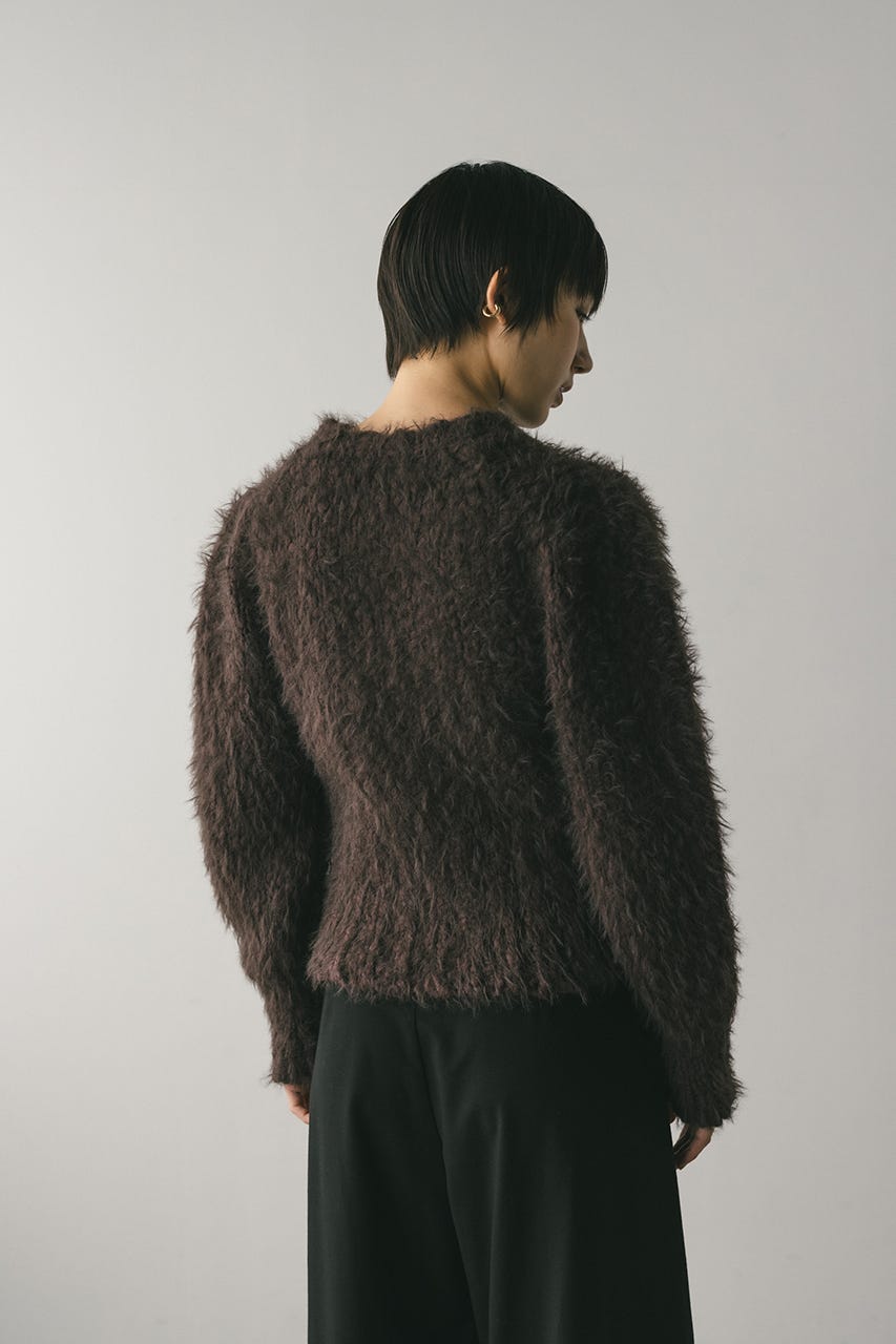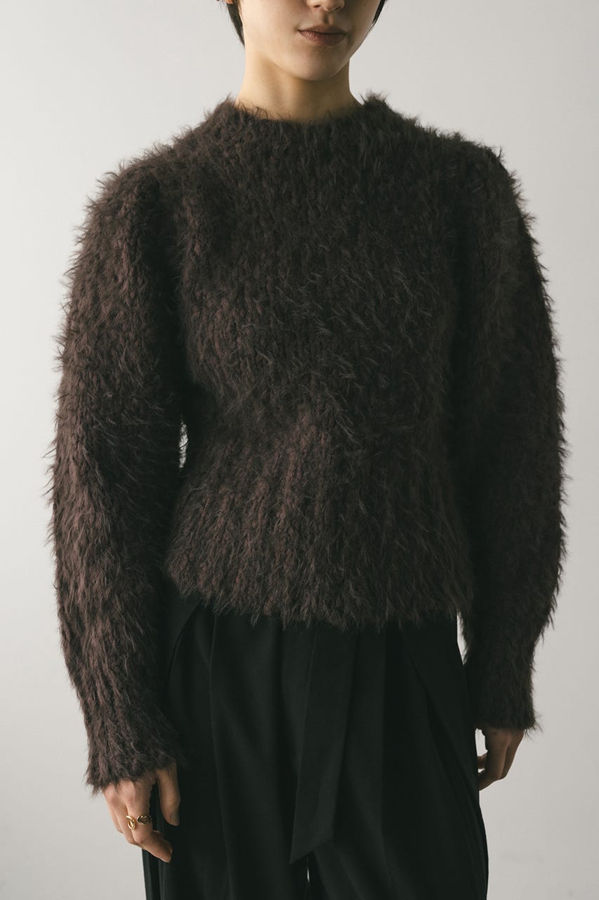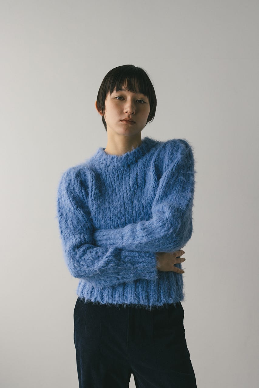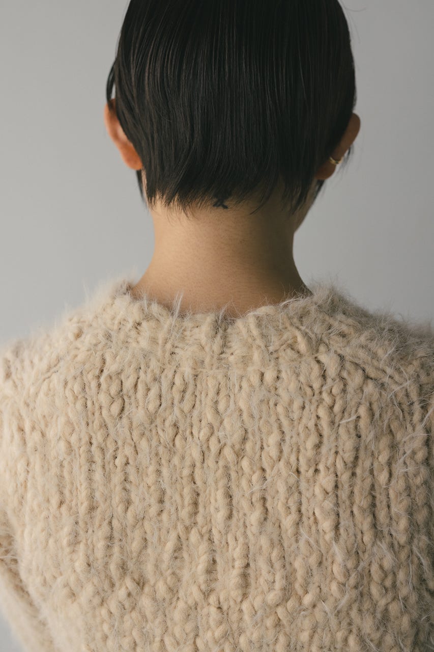 凹凸感のあるローゲージスラブ糸と毛足のあるシャギー糸を一緒に引き揃えて編み立てた暖かみのあるスラブシャギーニット。