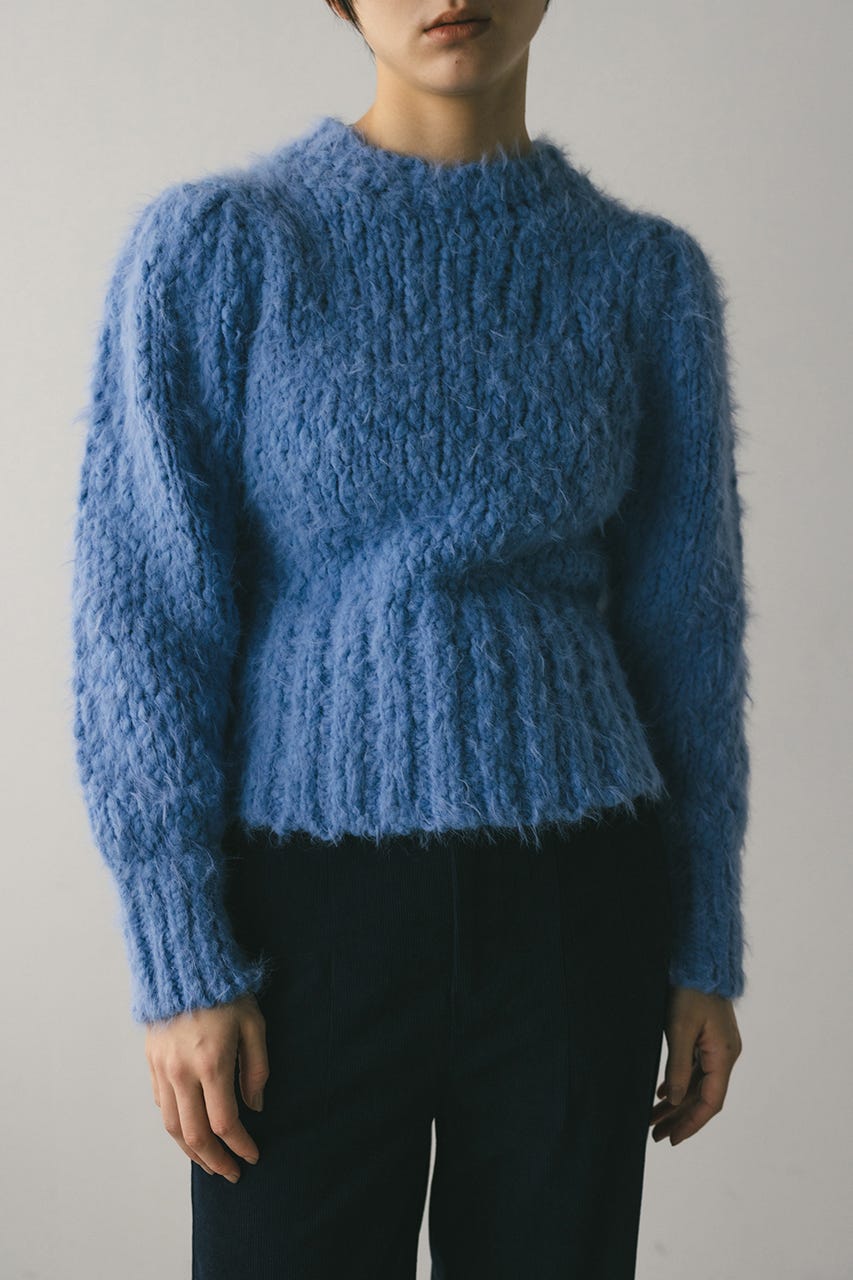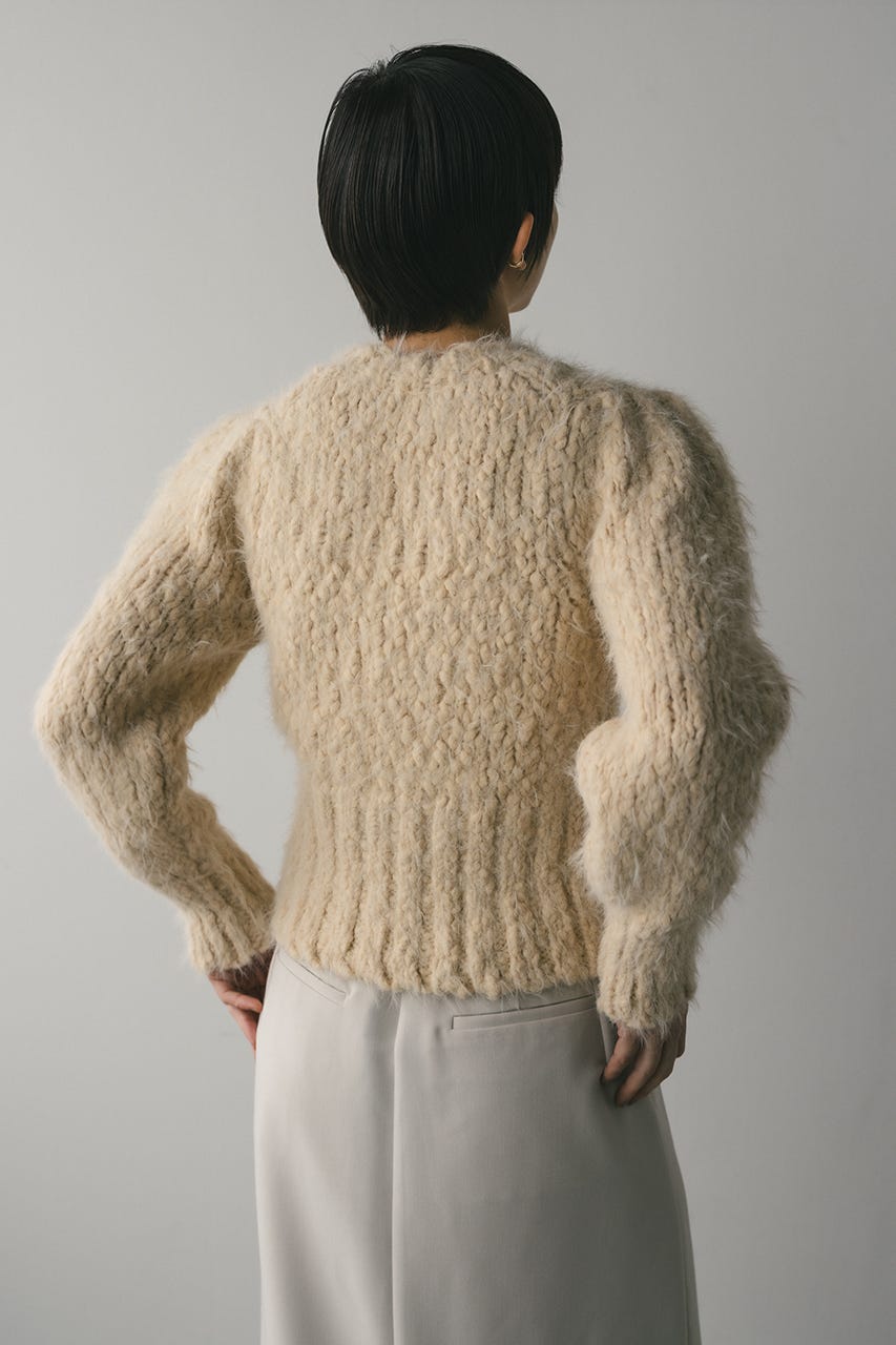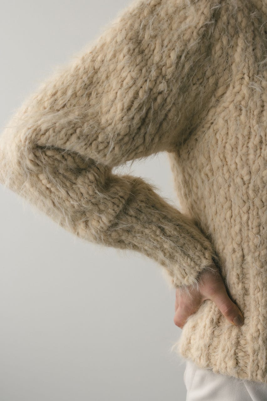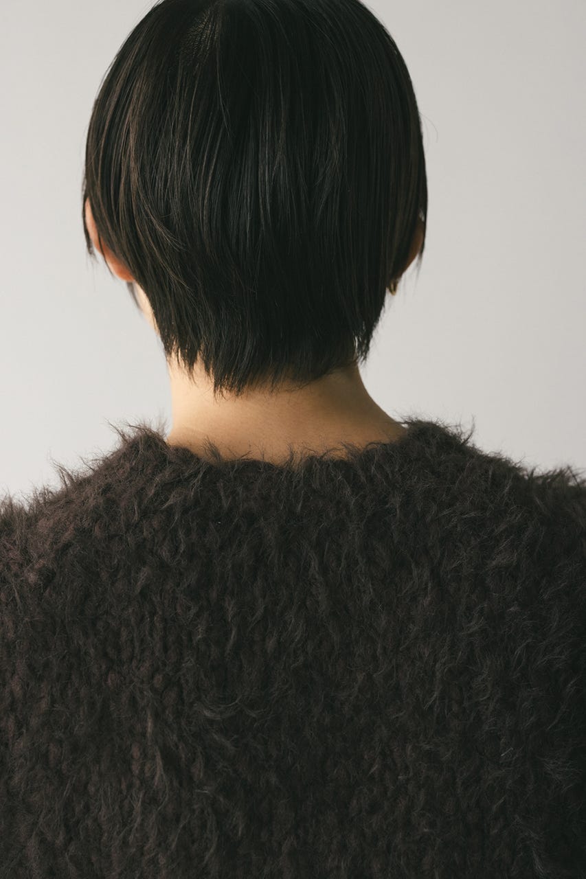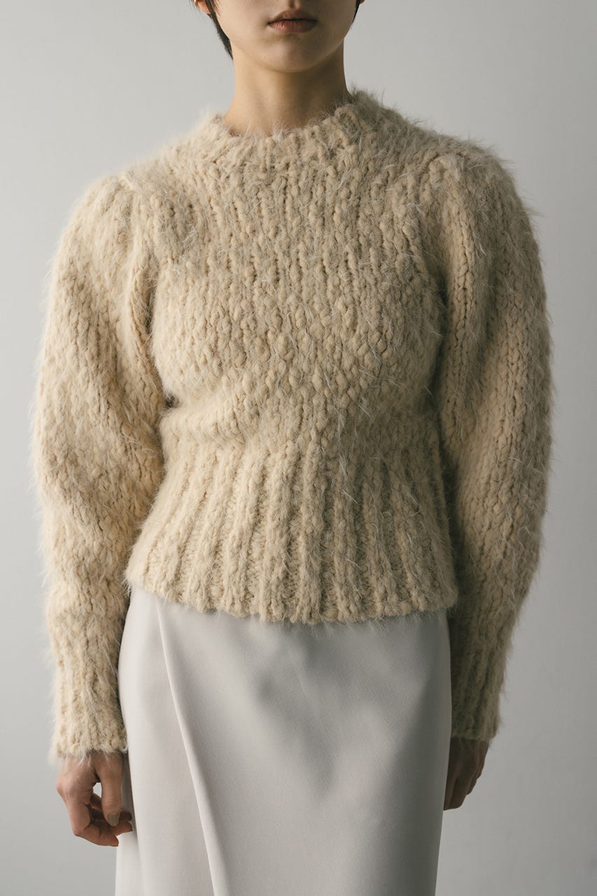 凹凸感のあるローゲージスラブ糸と毛足のあるシャギー糸を一緒に引き揃えて編み立てた暖かみのあるスラブシャギーニット。