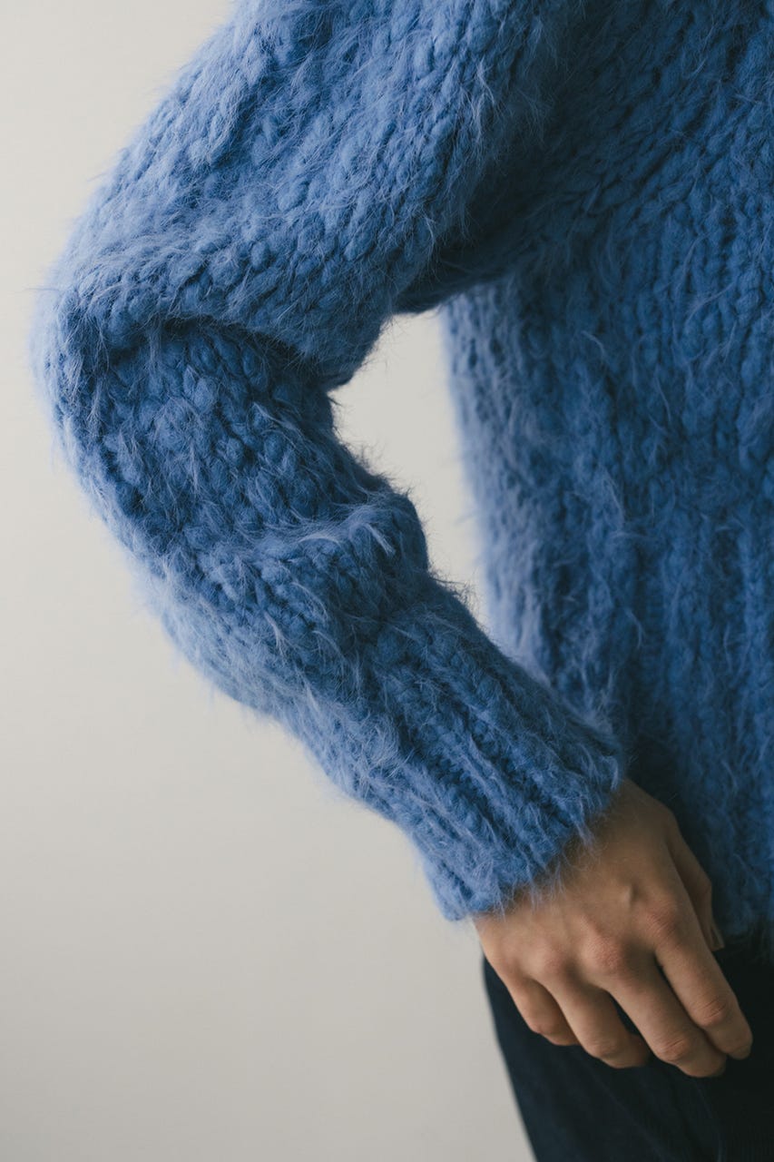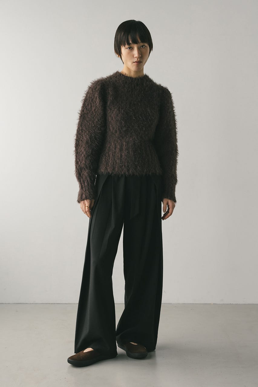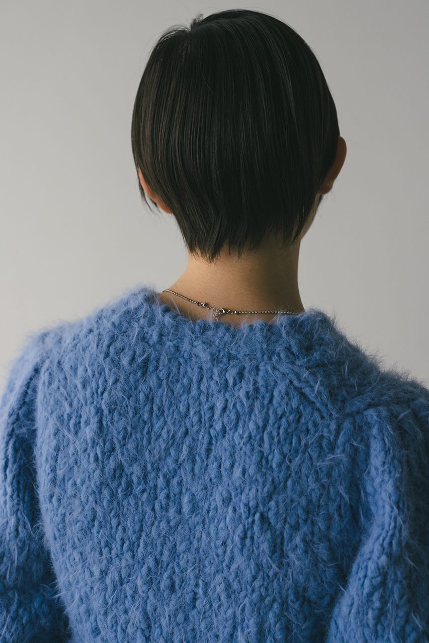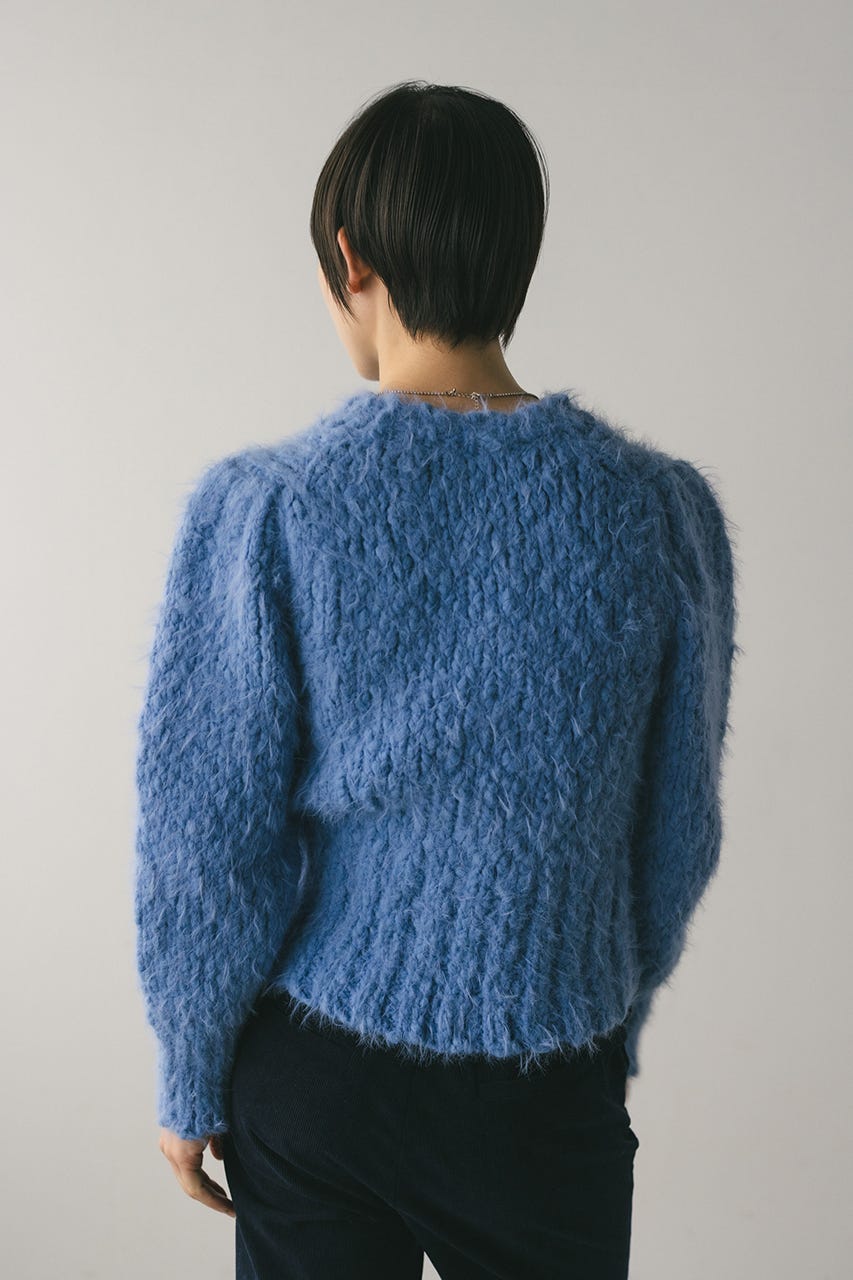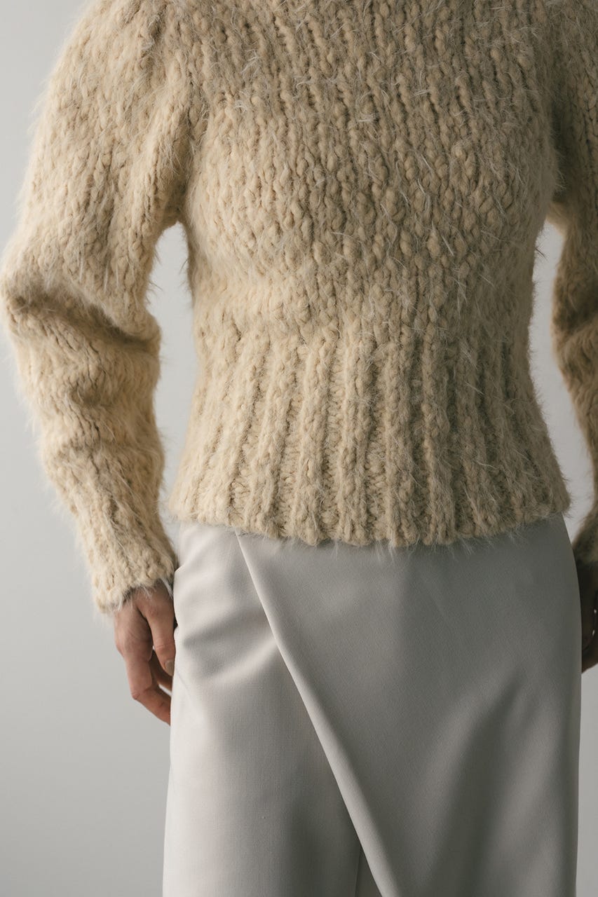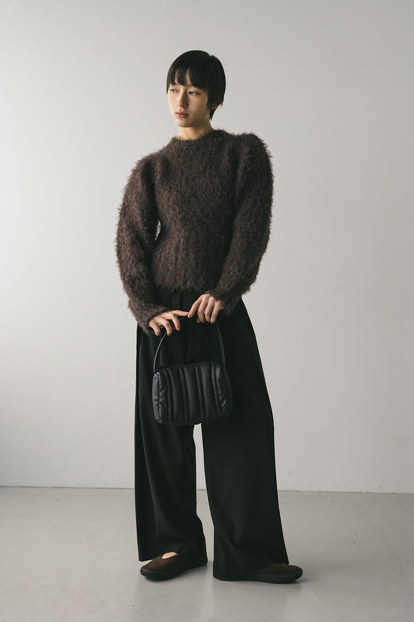 凹凸感のあるローゲージスラブ糸と毛足のあるシャギー糸を一緒に引き揃えて編み立てた暖かみのあるスラブシャギーニット。