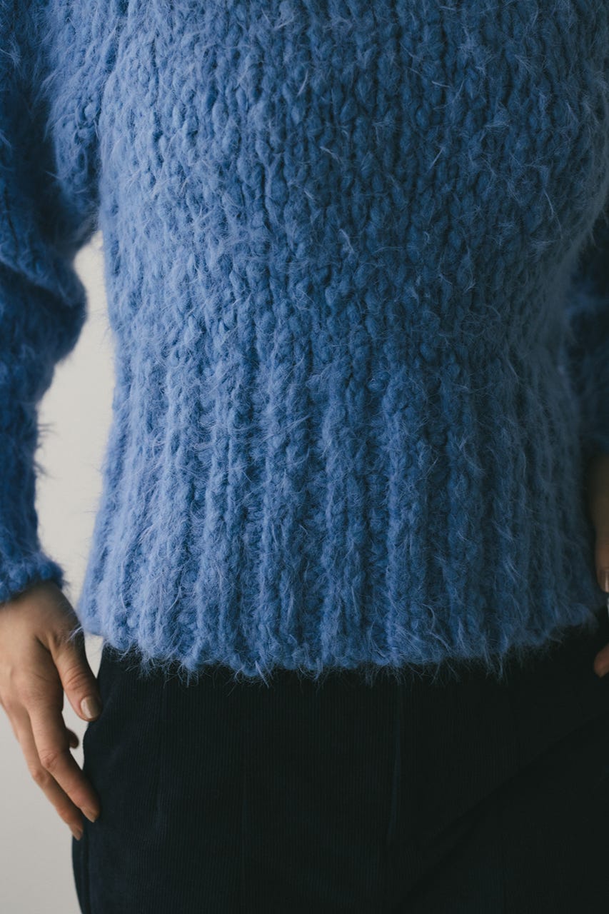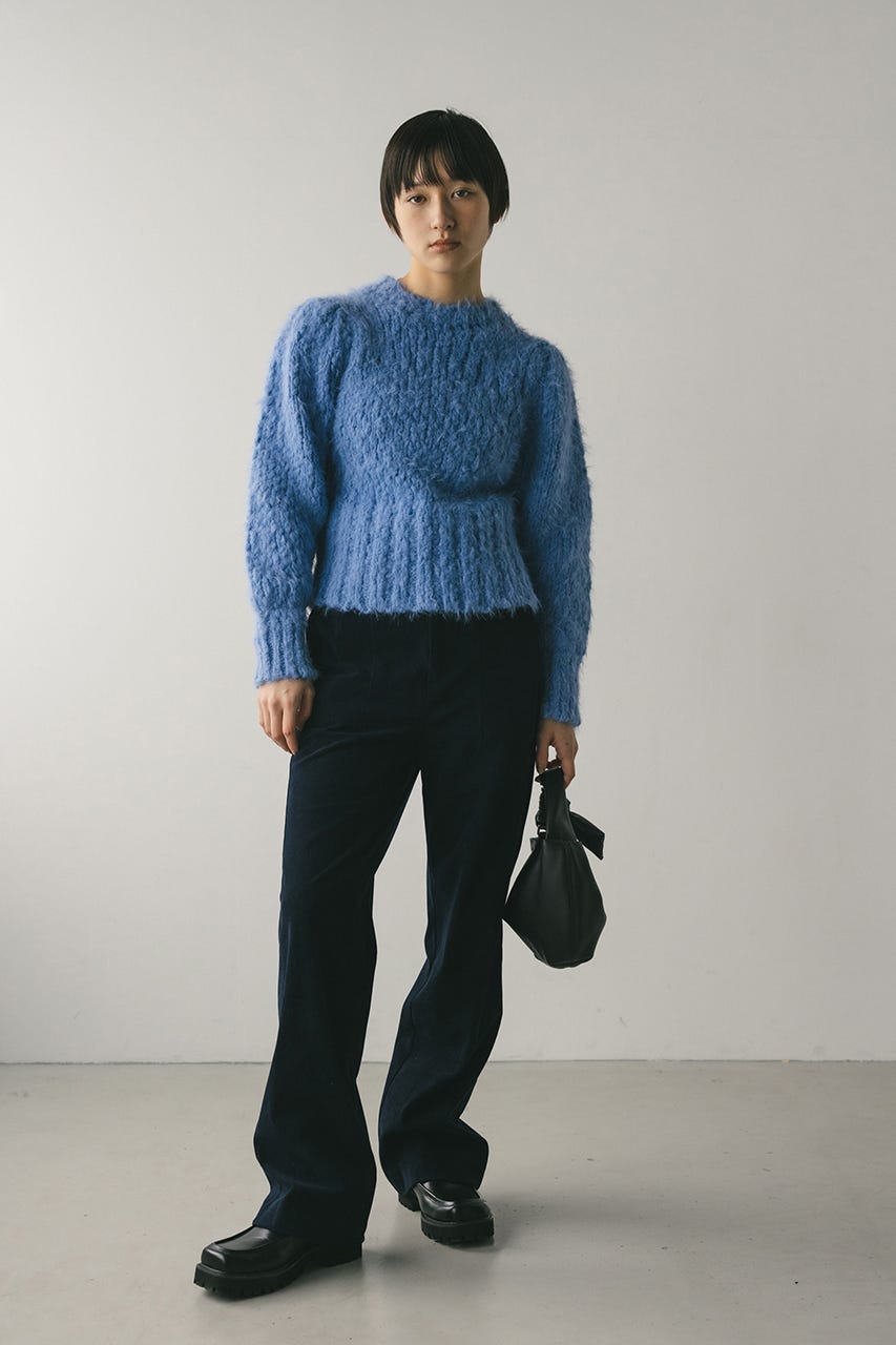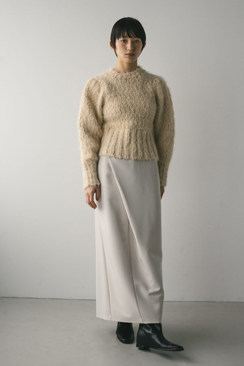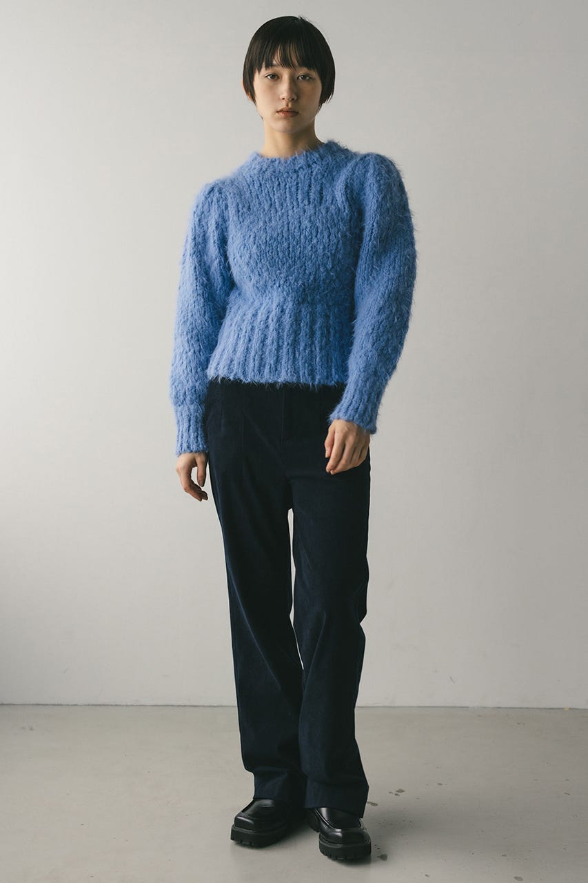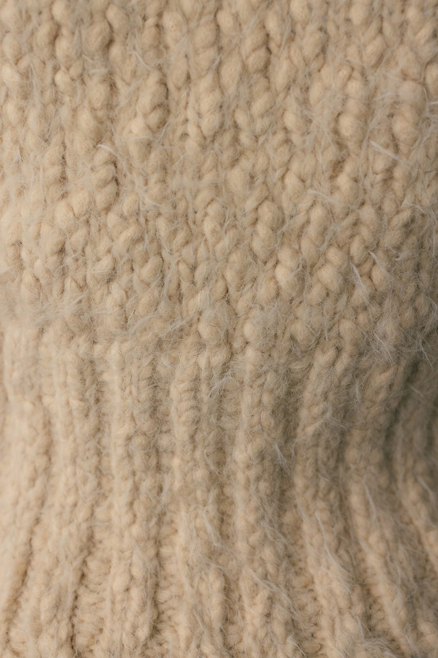 凹凸感のあるローゲージスラブ糸と毛足のあるシャギー糸を一緒に引き揃えて編み立てた暖かみのあるスラブシャギーニット。