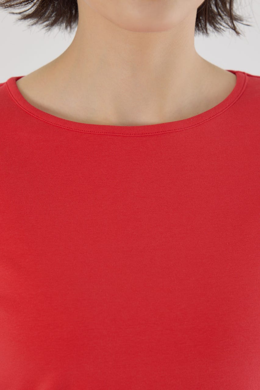 伸縮性のあるフライス生地を使用しており、タイト目なデザインながらも窮屈に感じない着用感となっています。