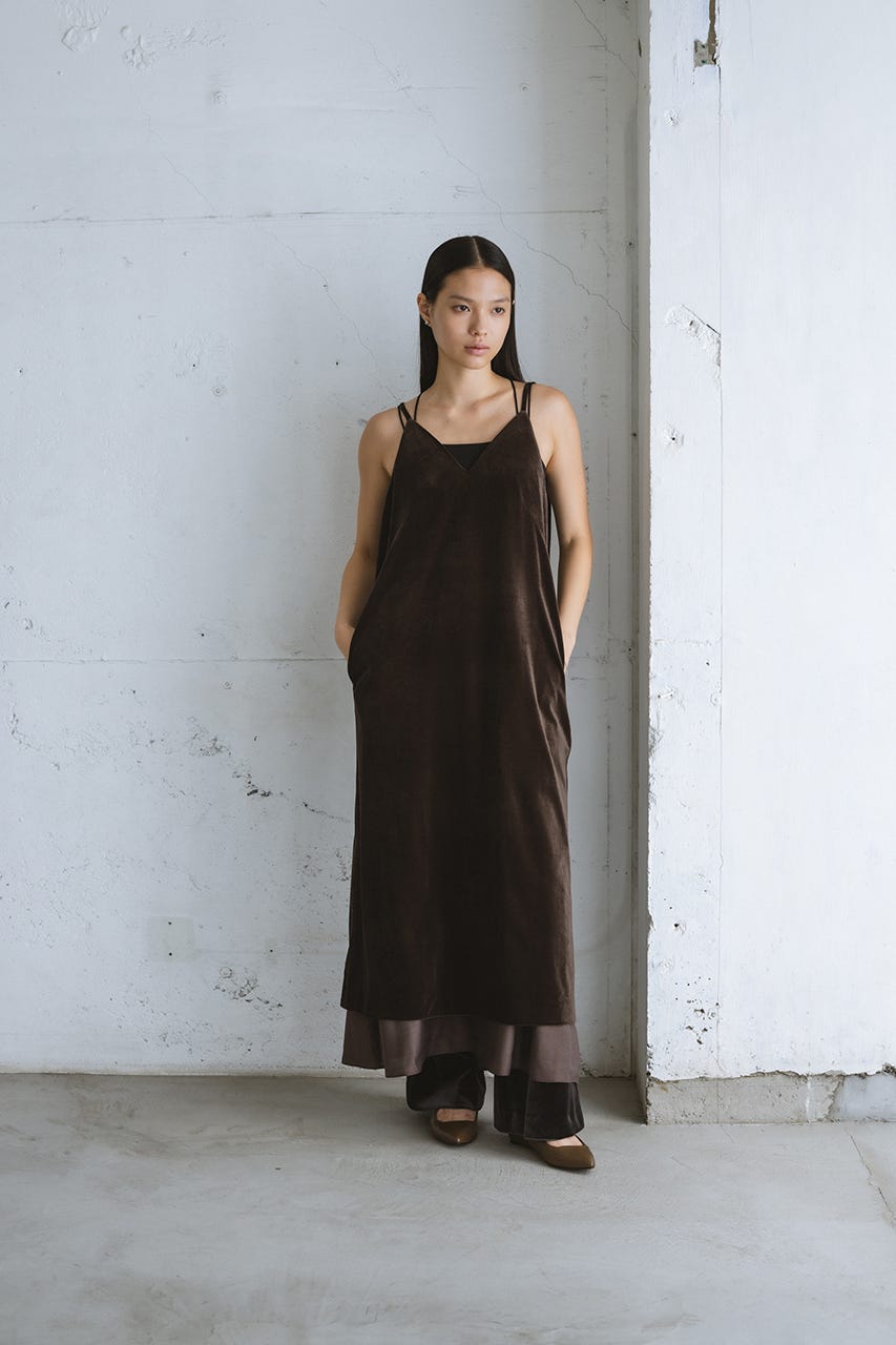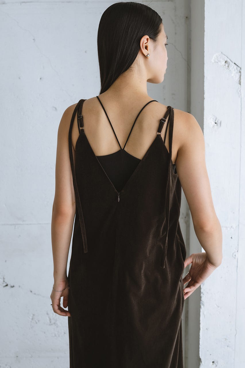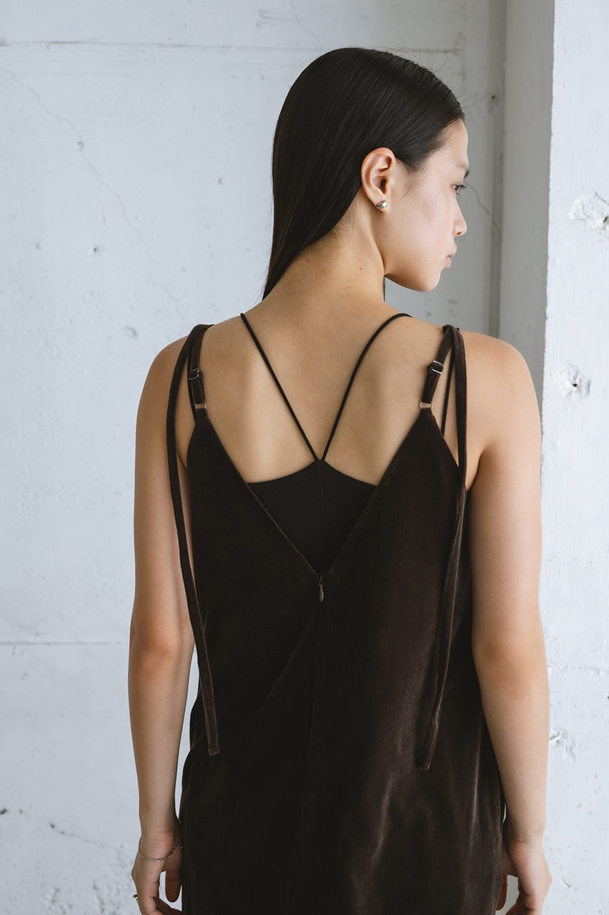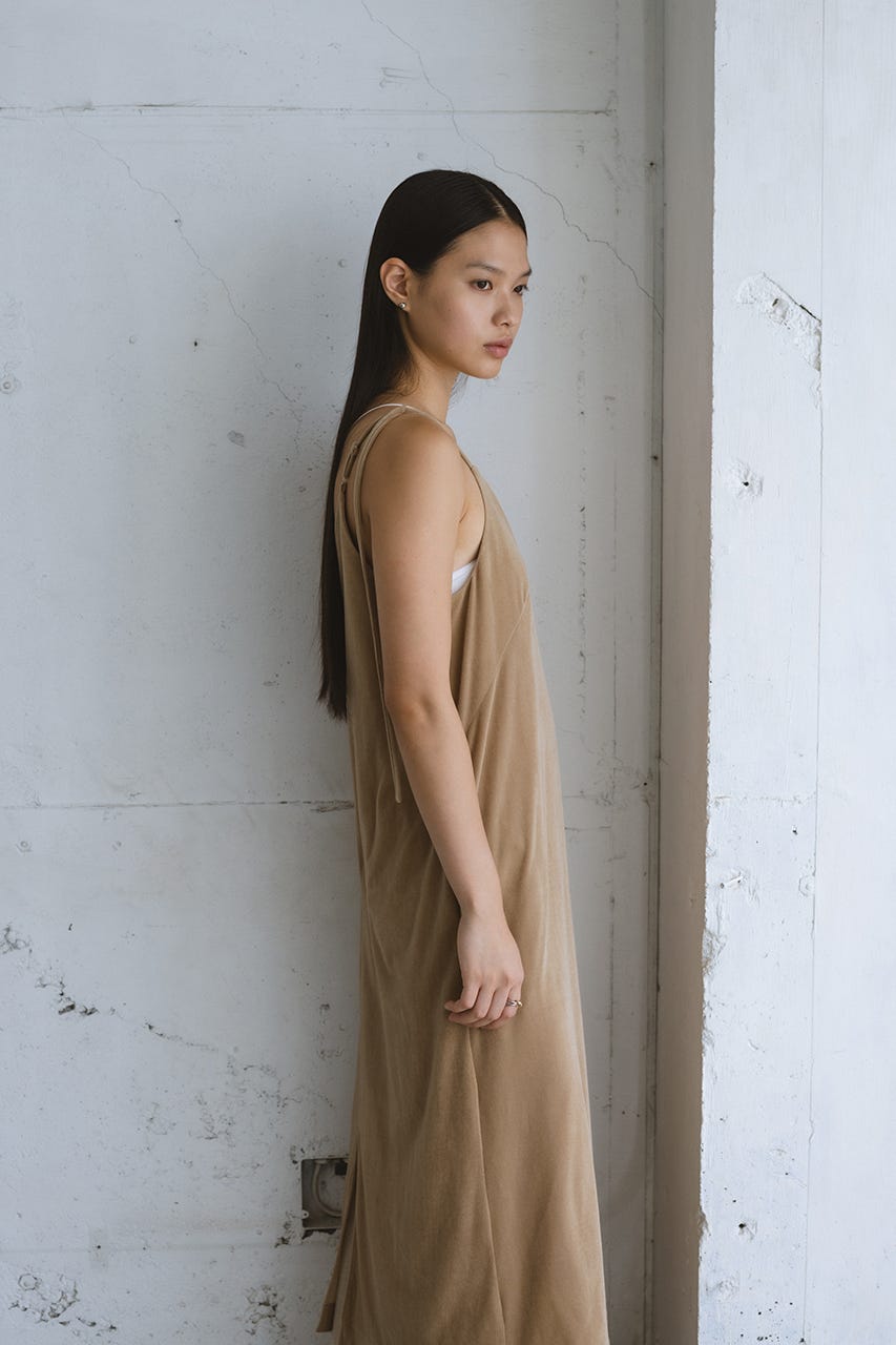 ストレッチの効いた軽くてしなやかなメッシュベロアと天然見えの布帛ラッフルヘムのレイヤーデザインが可愛いキャミワンピース。