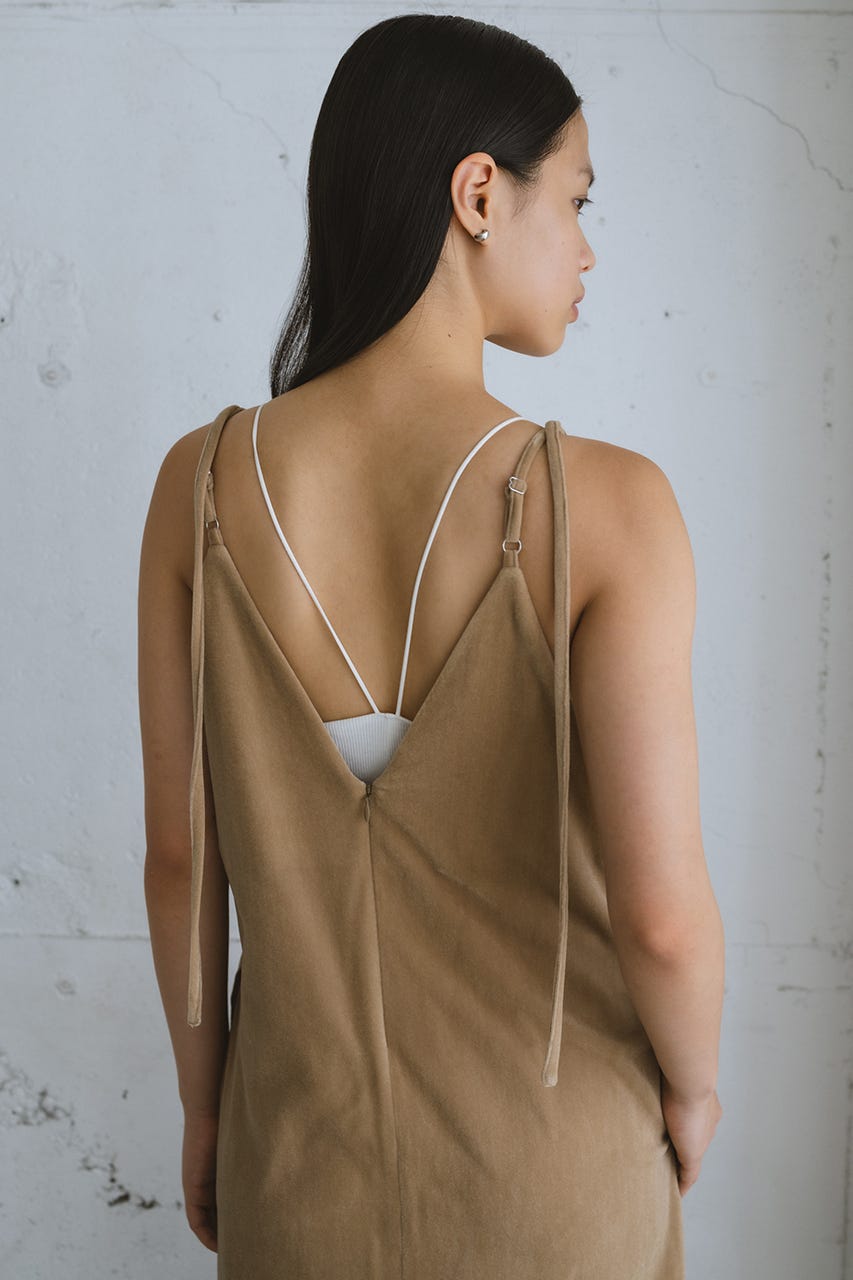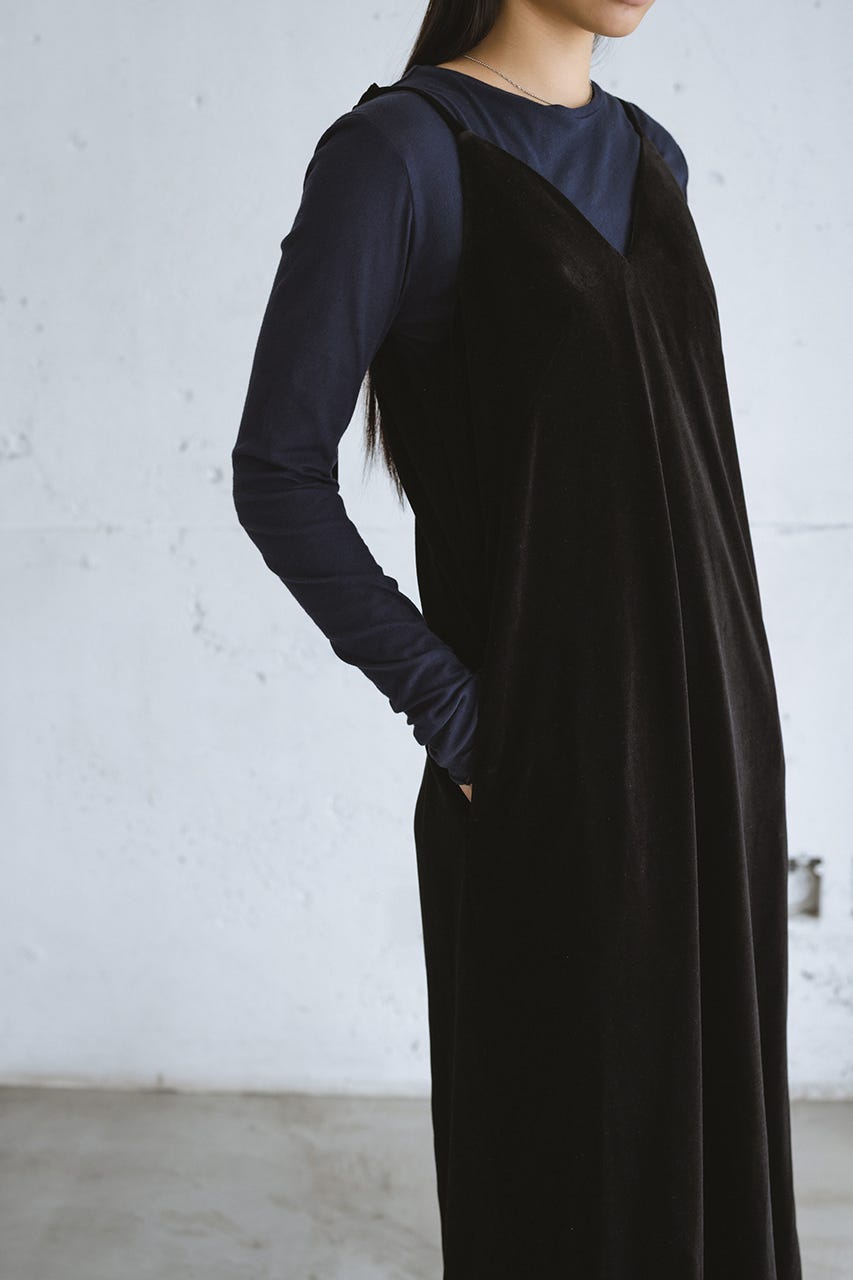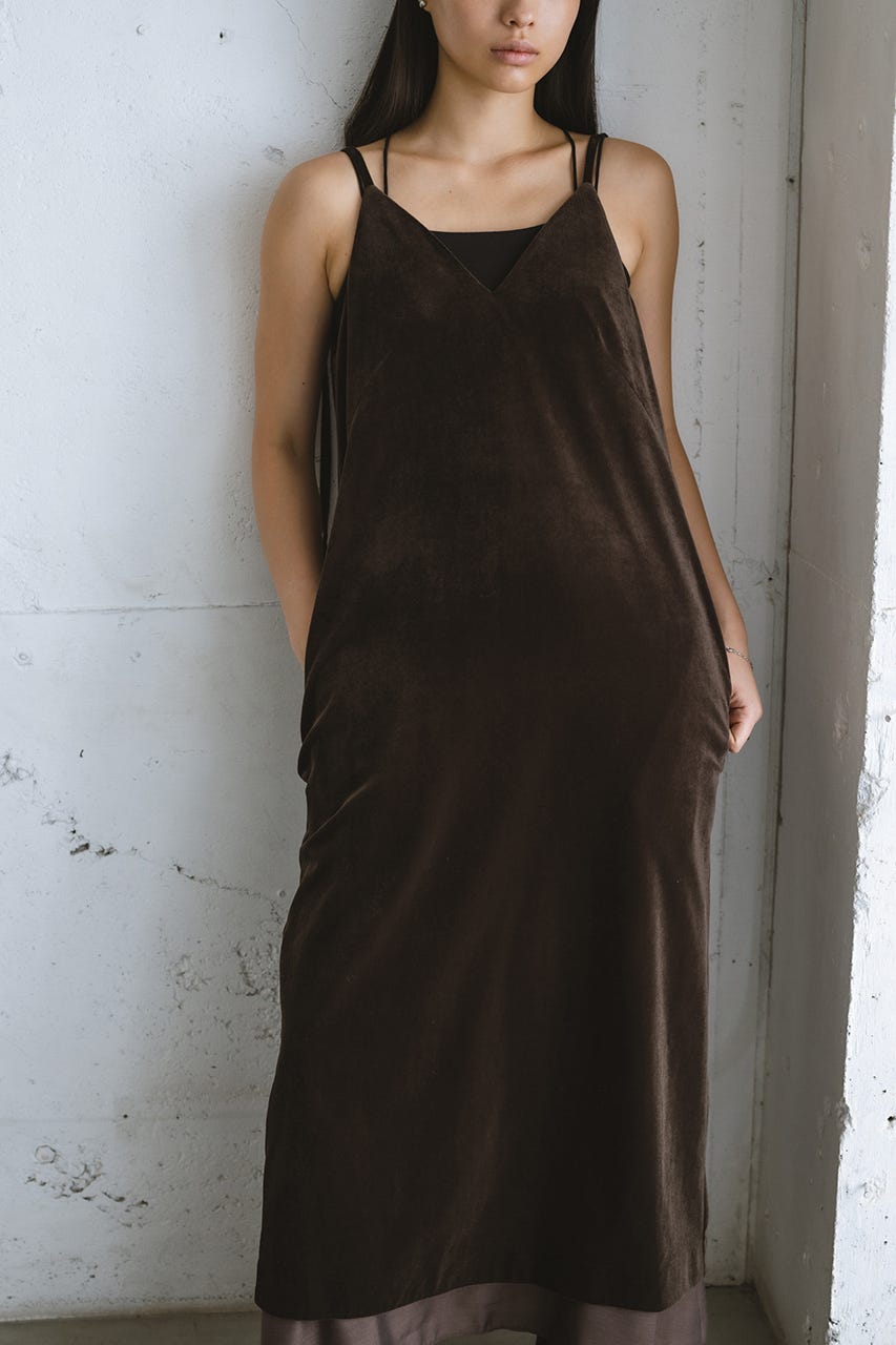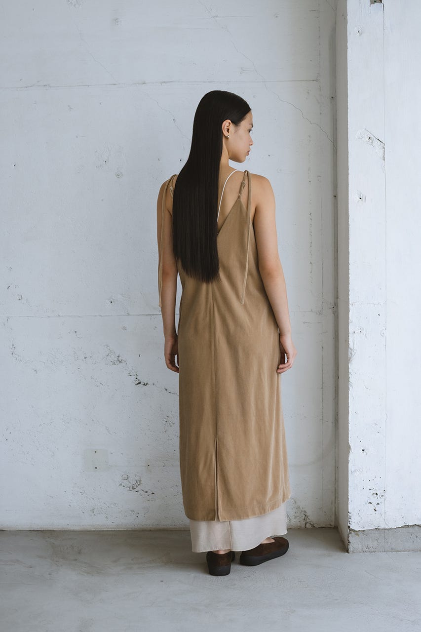 ストレッチの効いた軽くてしなやかなメッシュベロアと天然見えの布帛ラッフルヘムのレイヤーデザインが可愛いキャミワンピース。