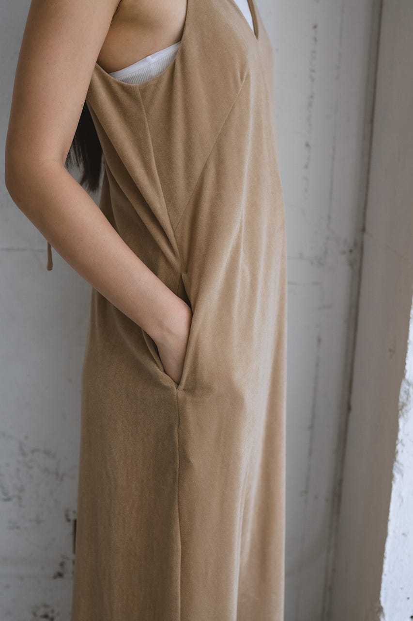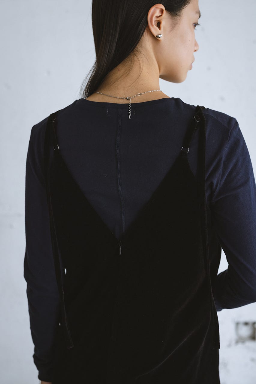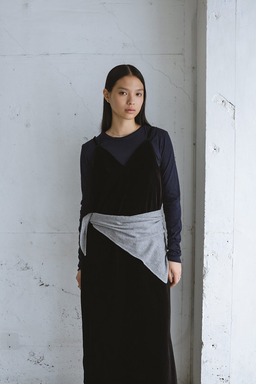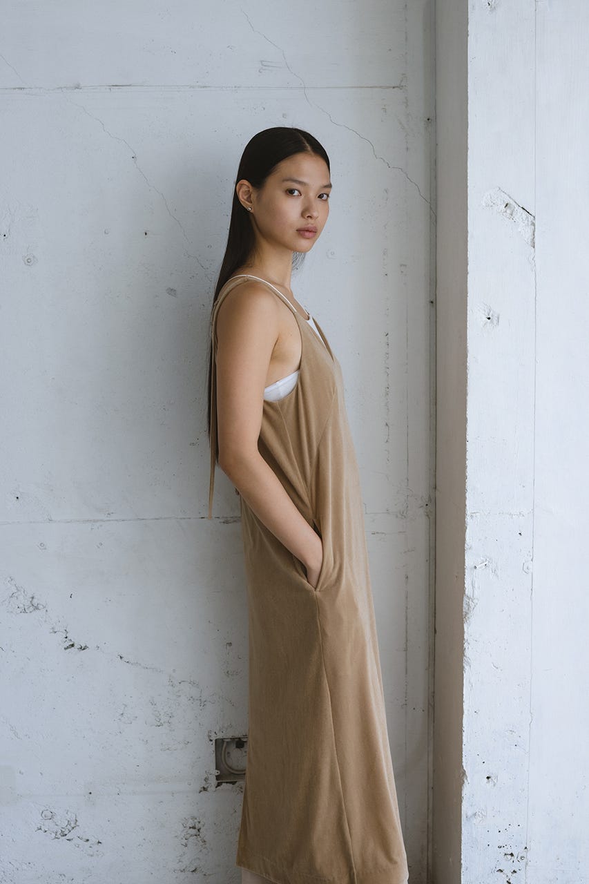 ストレッチの効いた軽くてしなやかなメッシュベロアと天然見えの布帛ラッフルヘムのレイヤーデザインが可愛いキャミワンピース。