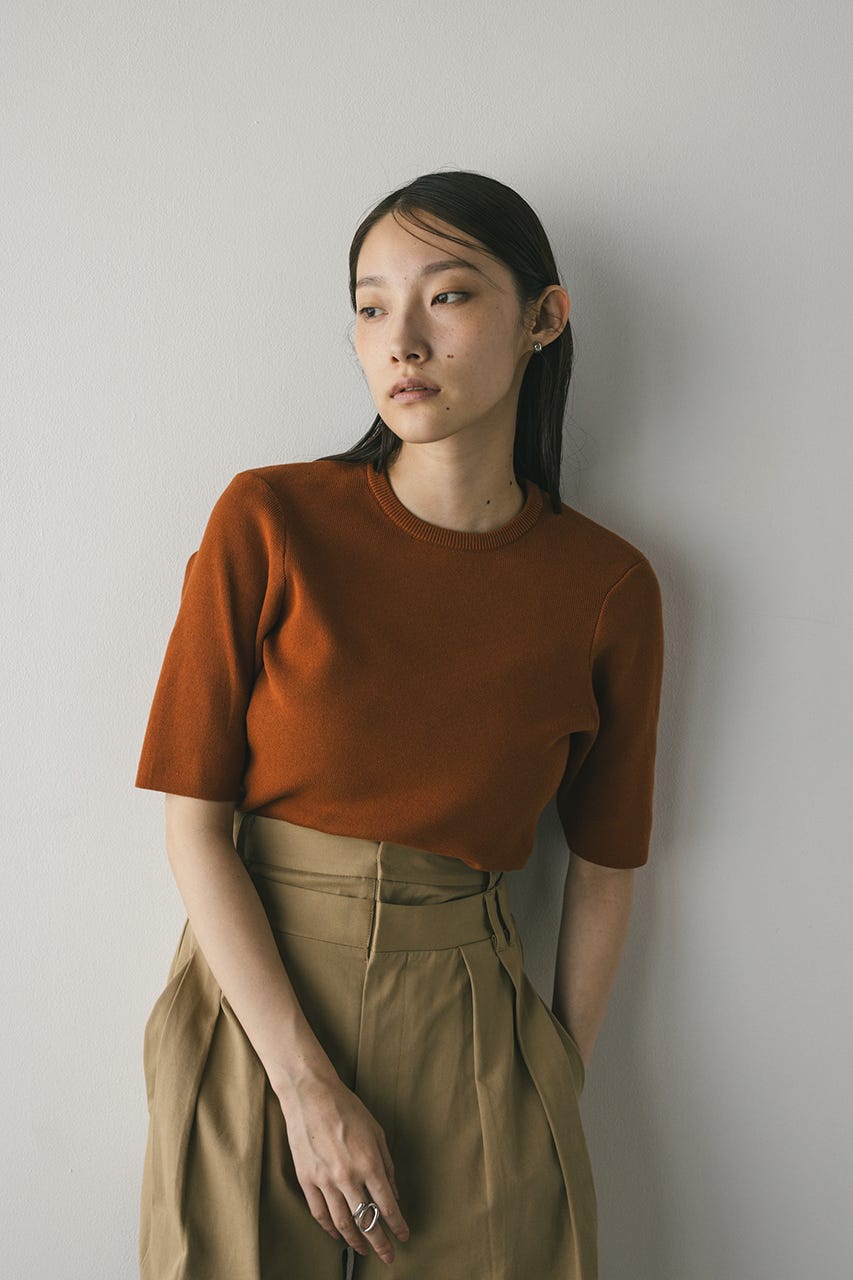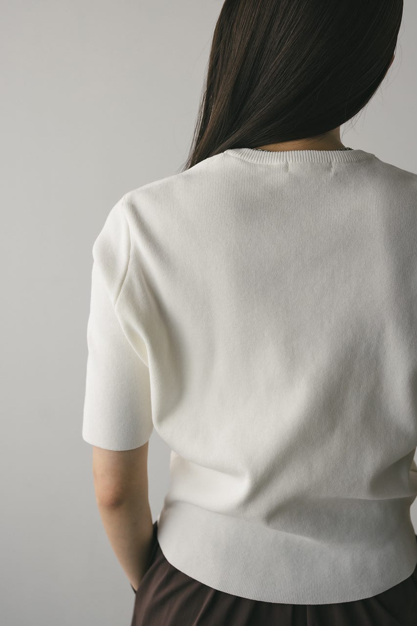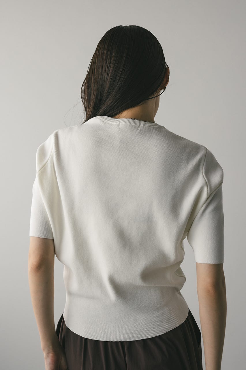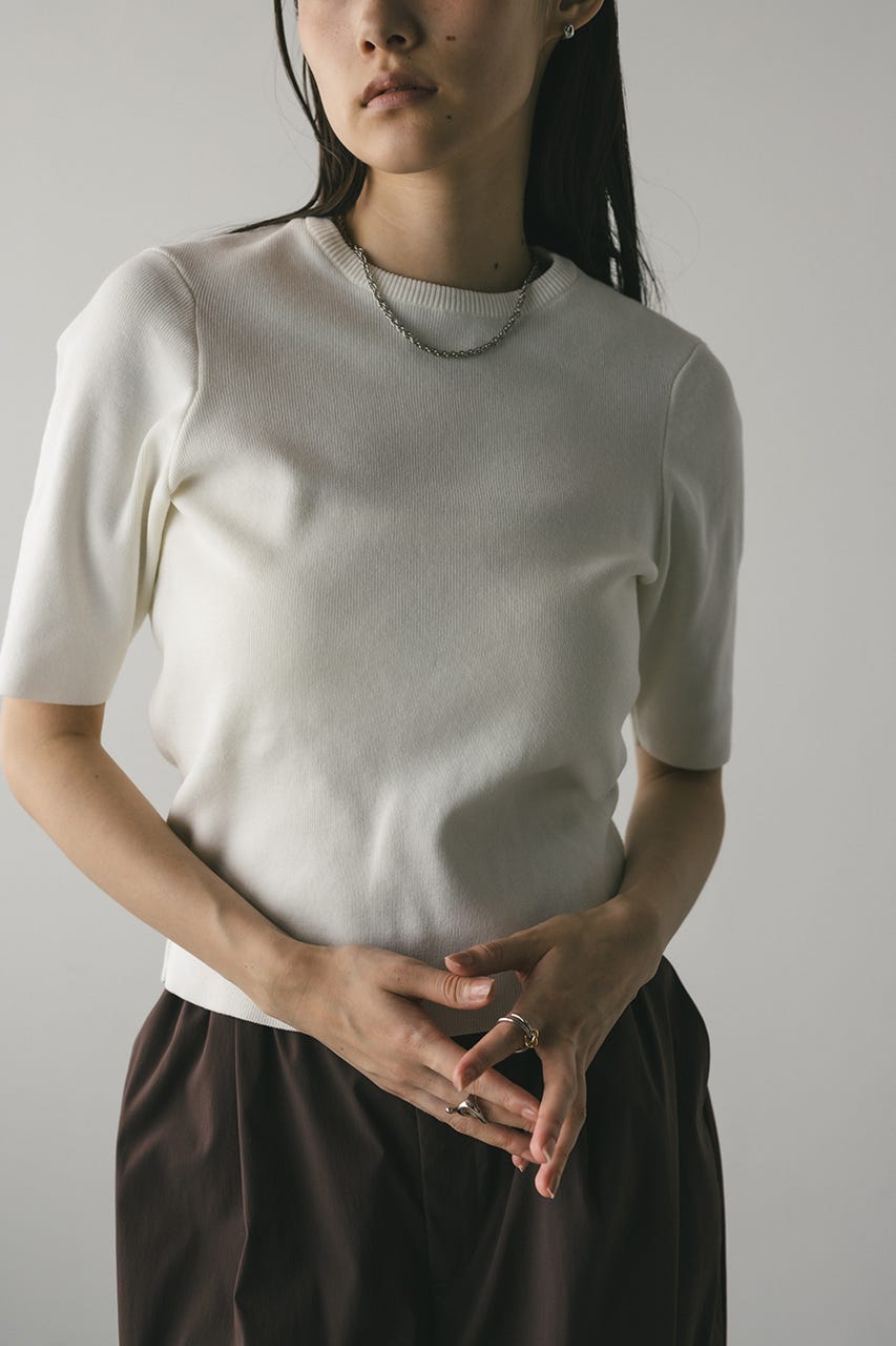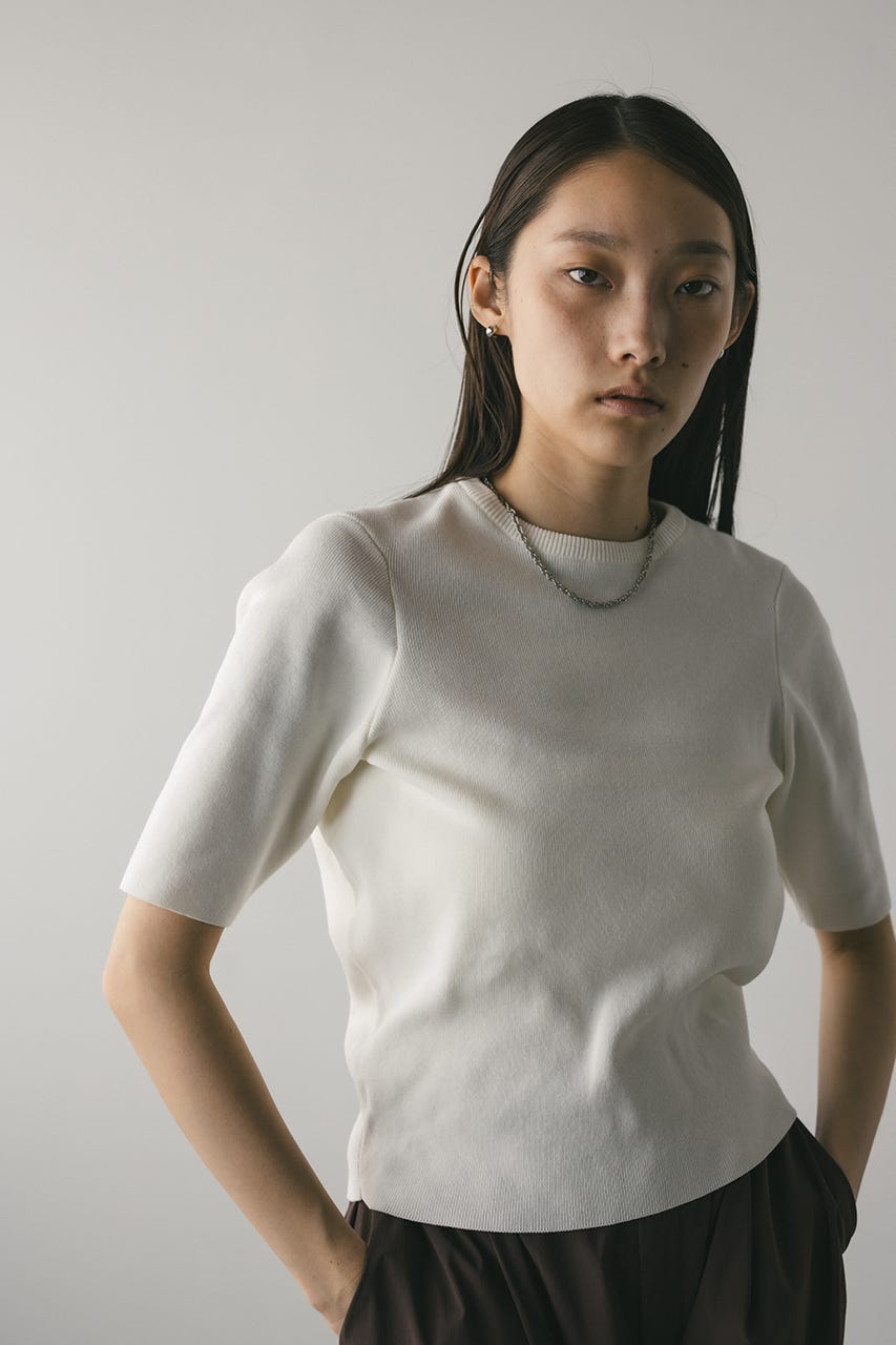 ドライなハイツイストコットンで仕立てたモードな上品な5分袖のフォルムニット。