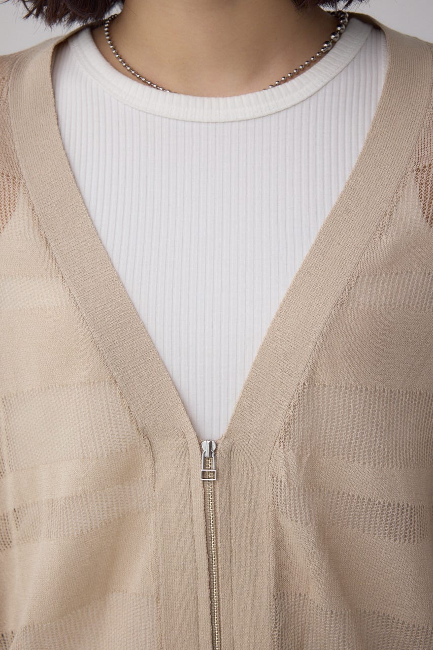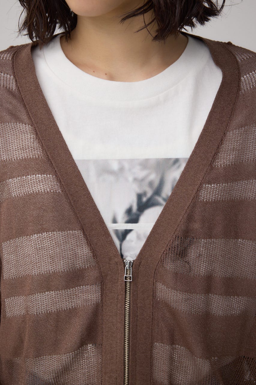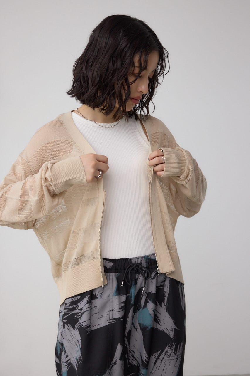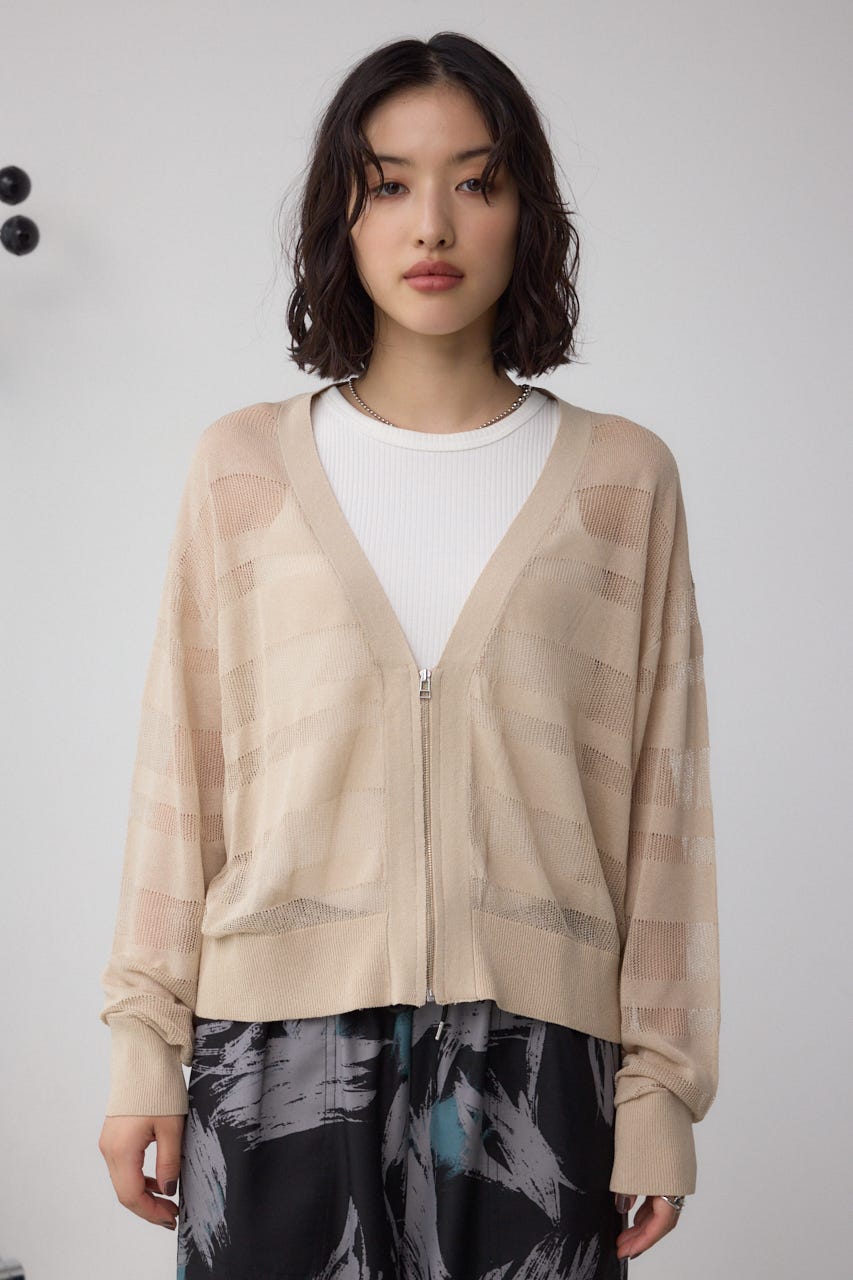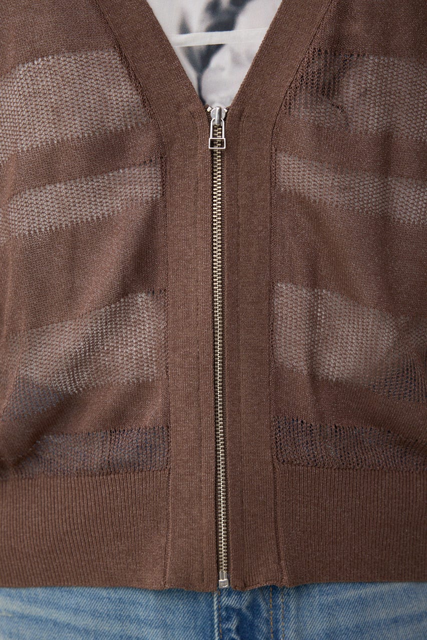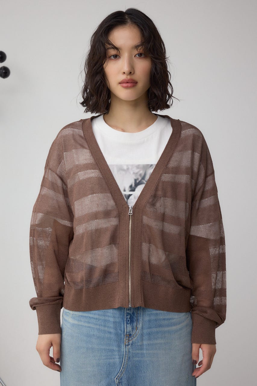 メッシュ編みのシアーボーダー柄のジップカーディガン。