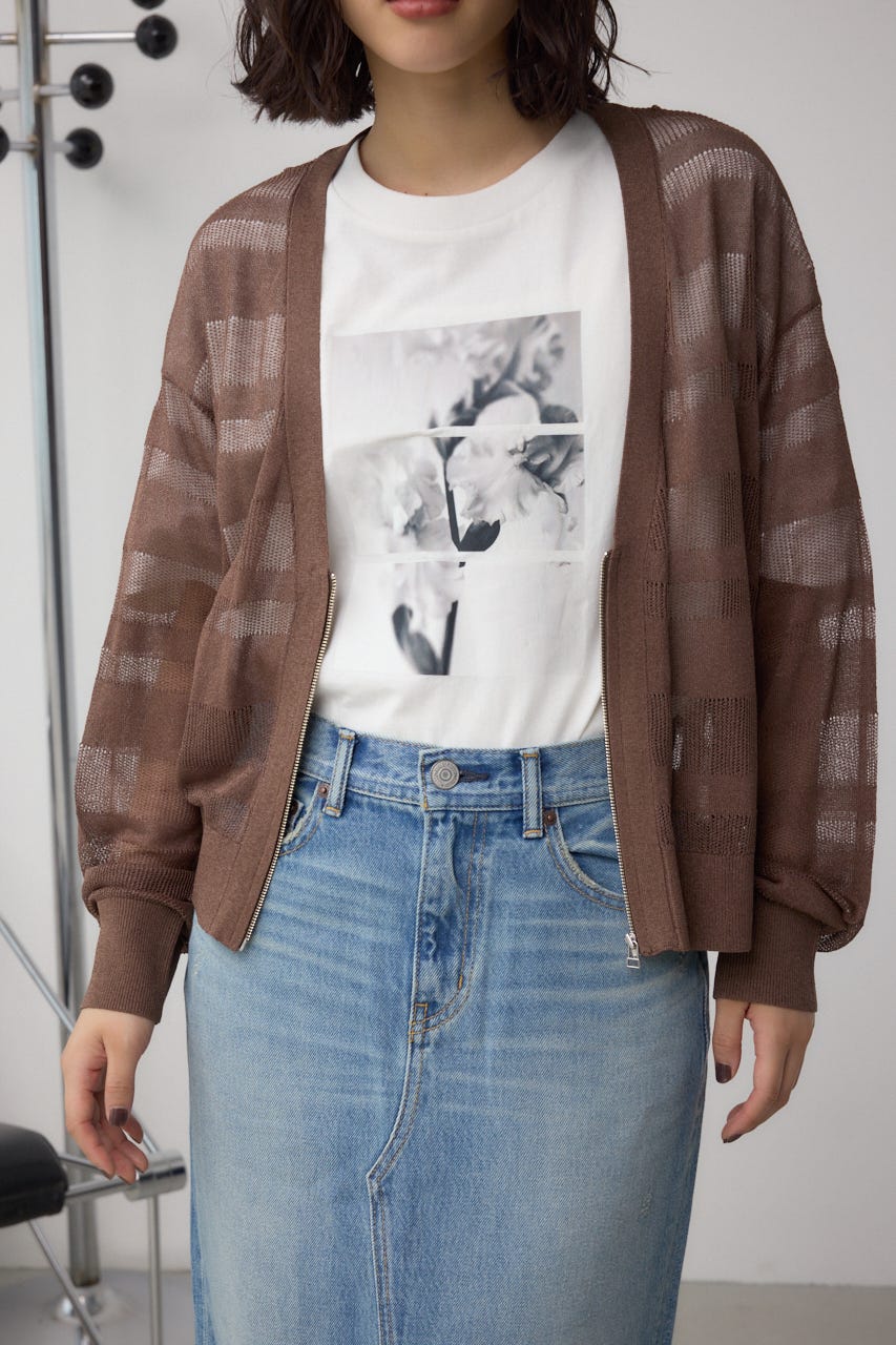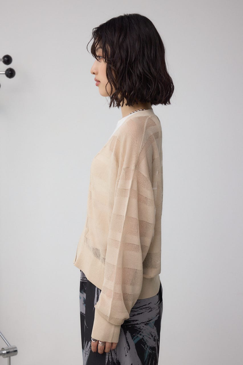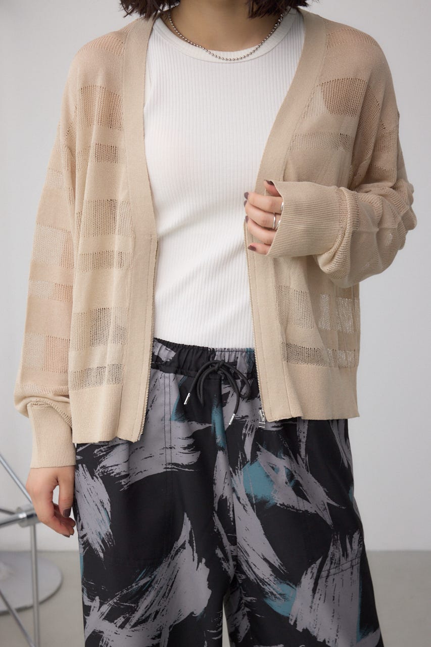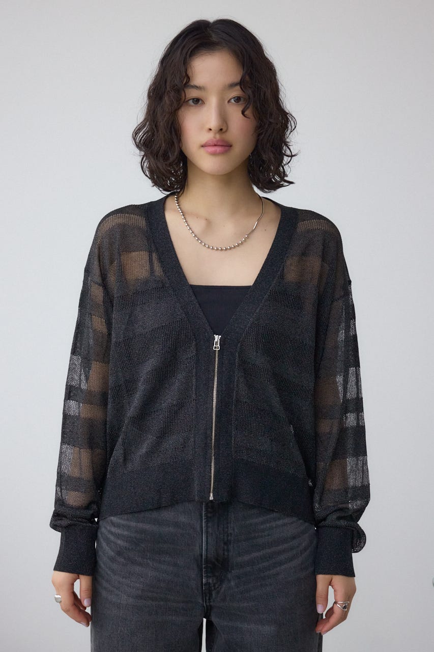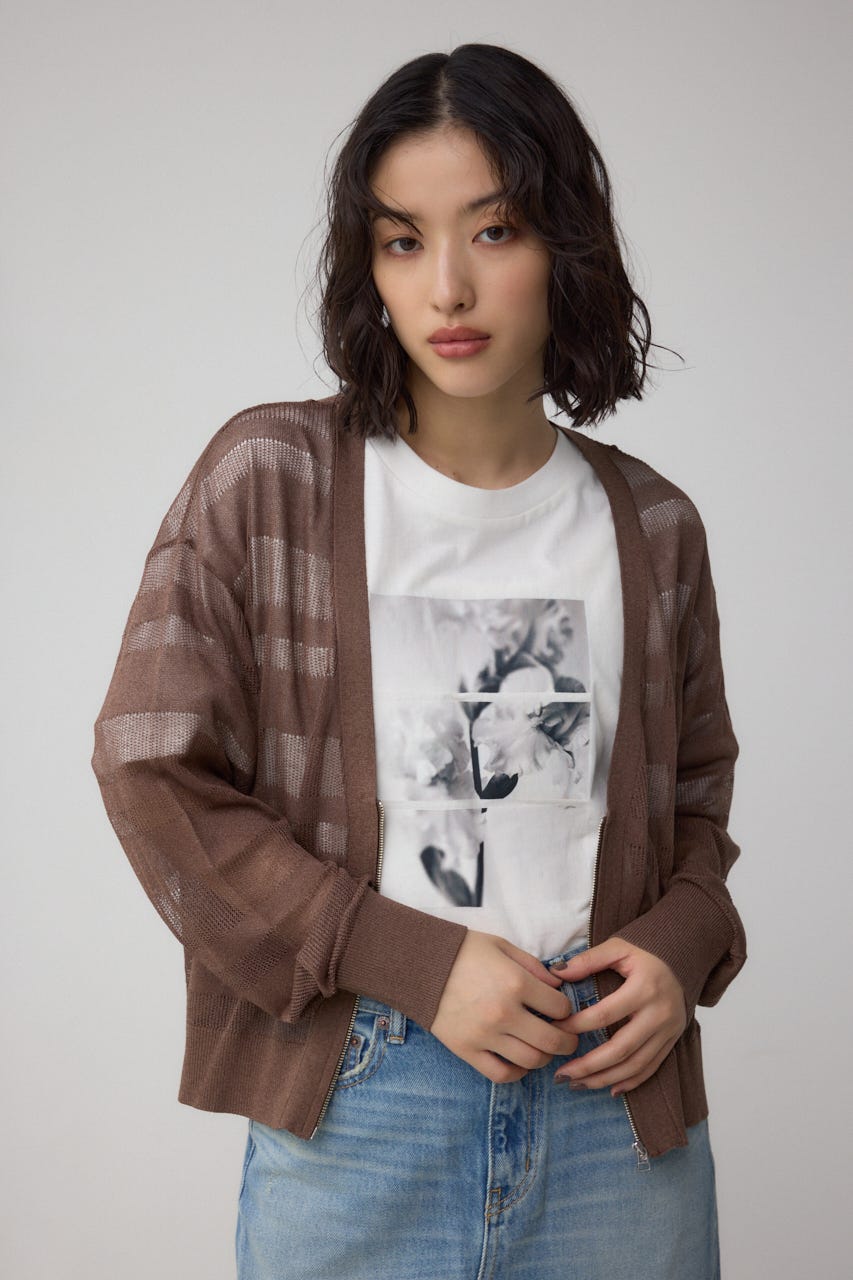 メッシュ編みのシアーボーダー柄のジップカーディガン。