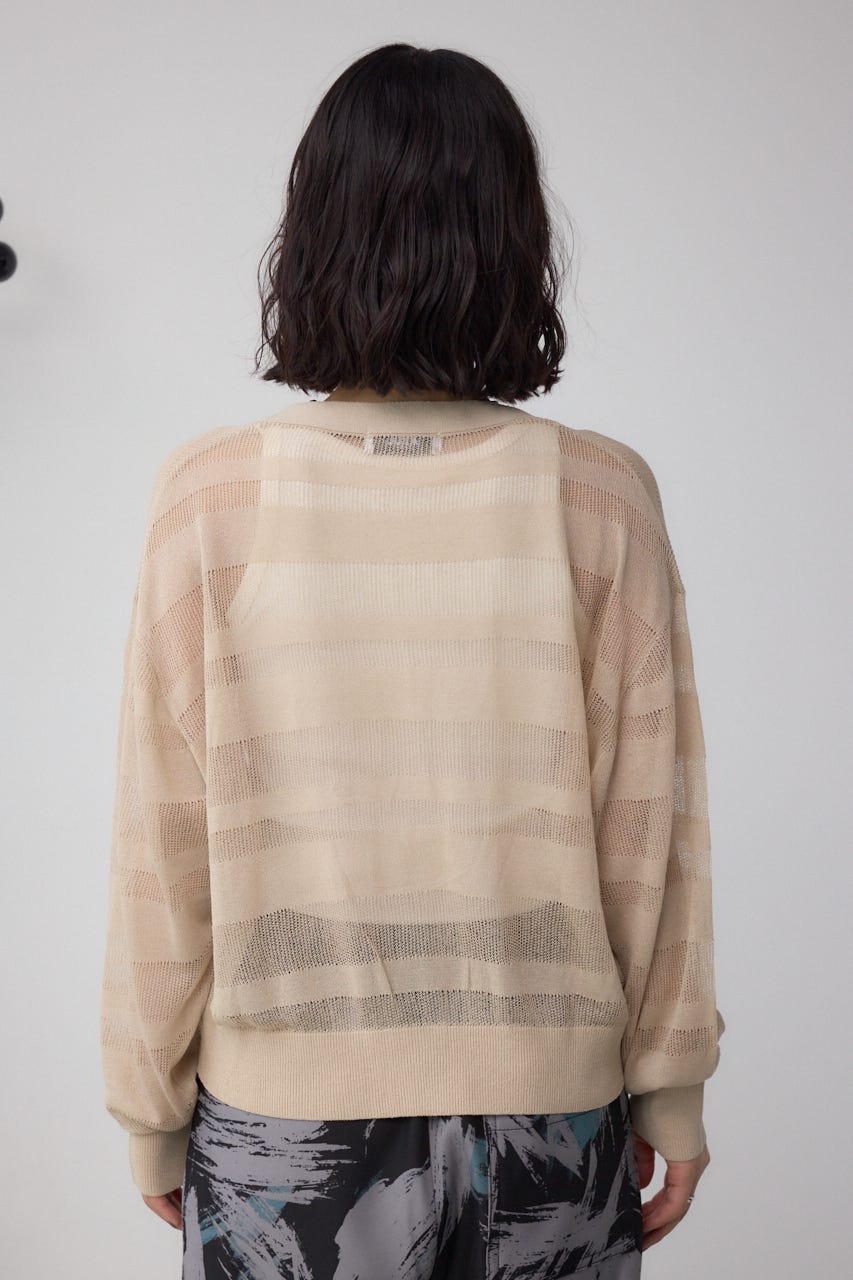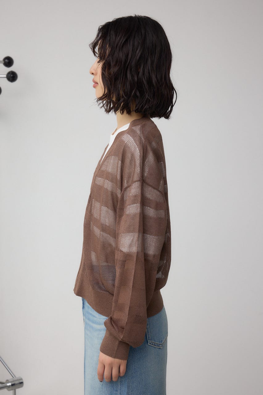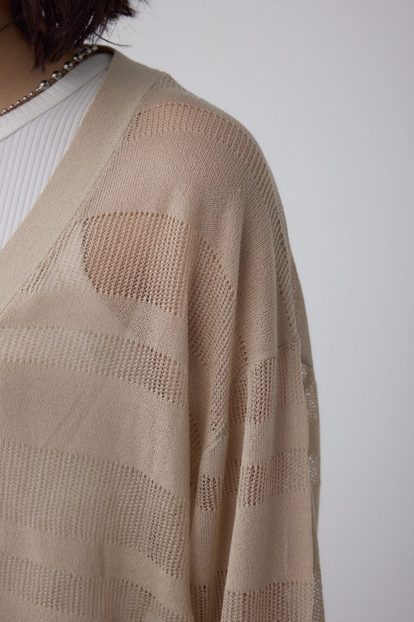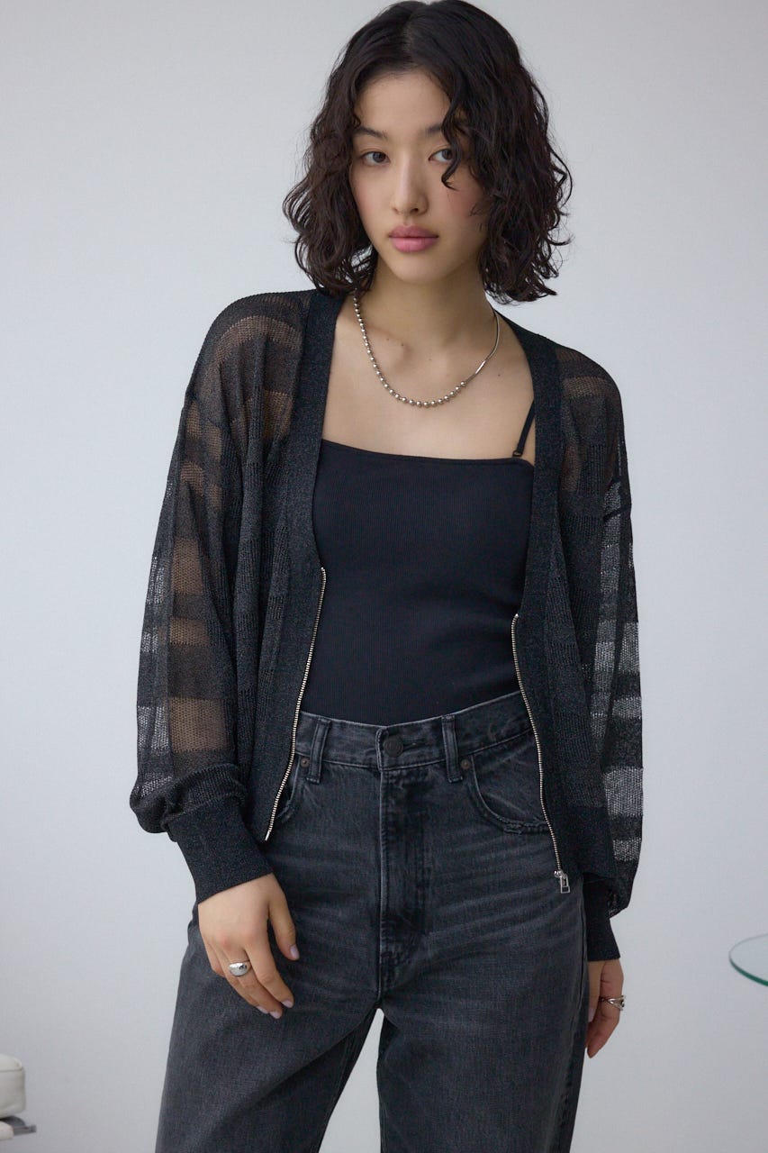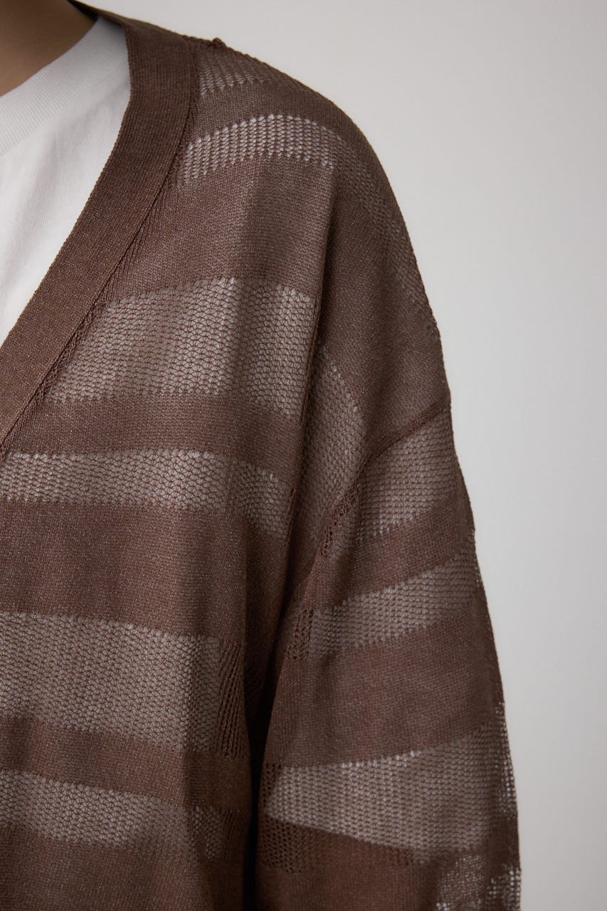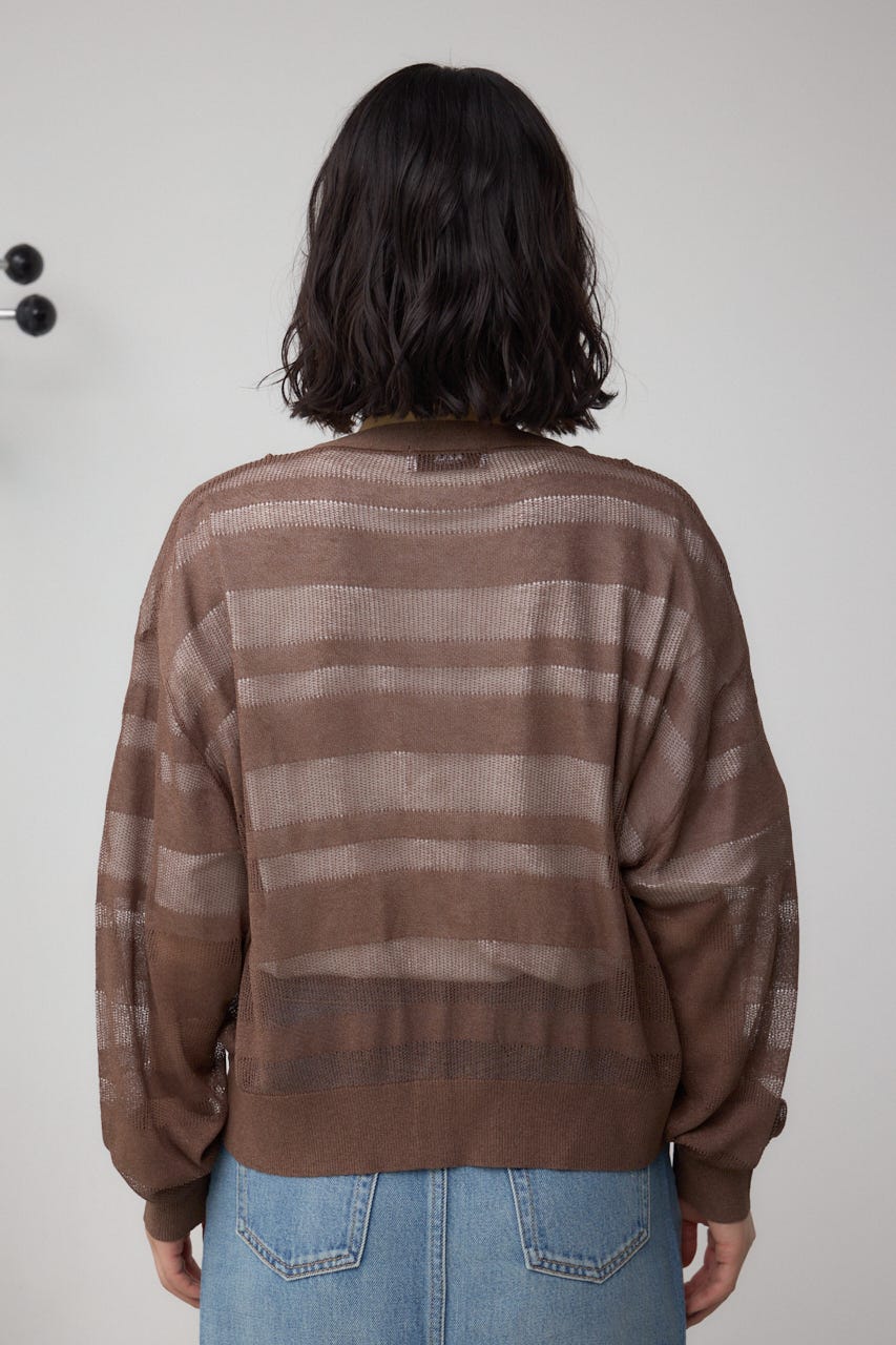 メッシュ編みのシアーボーダー柄のジップカーディガン。