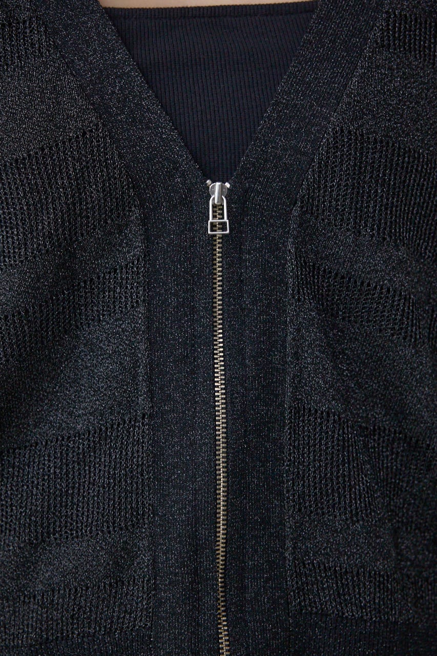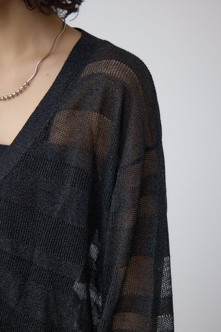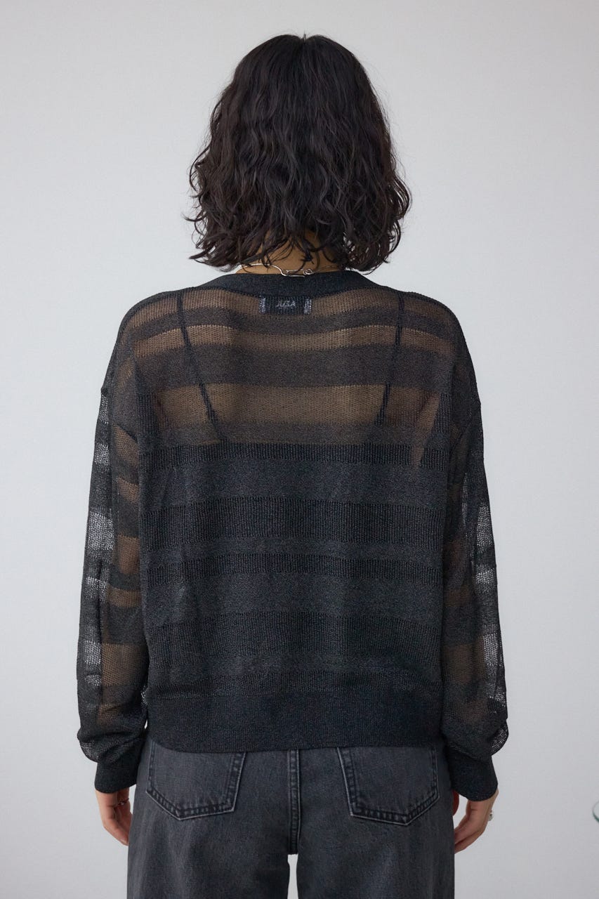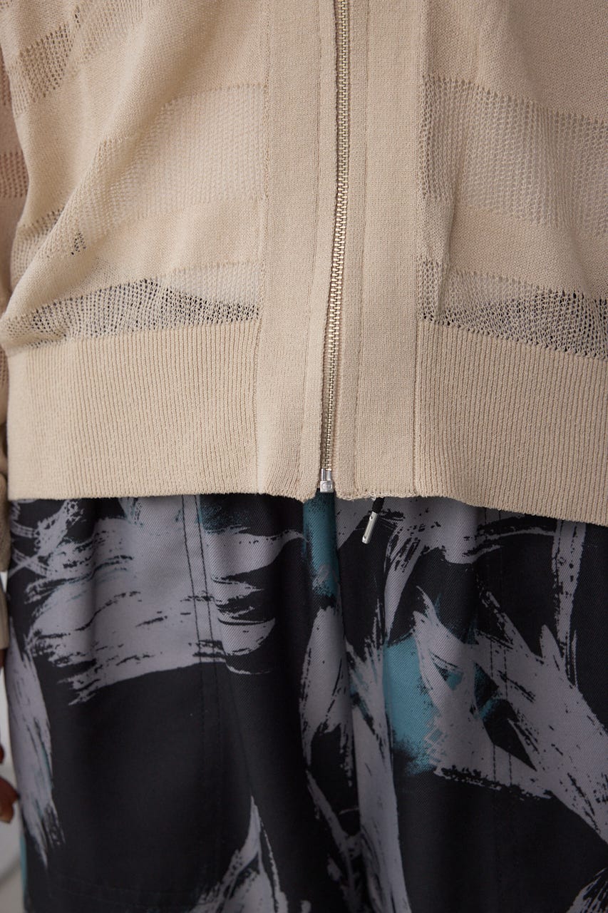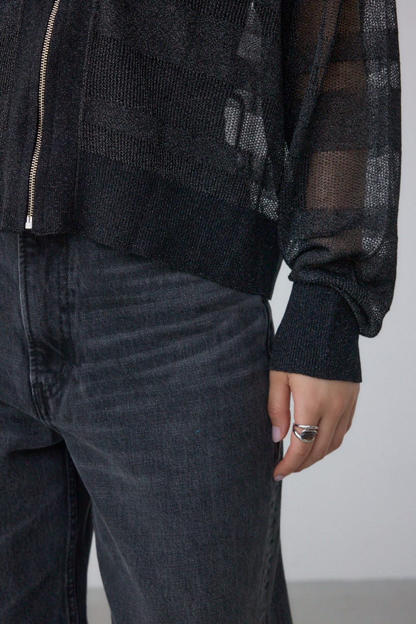メッシュ編みのシアーボーダー柄のジップカーディガン。