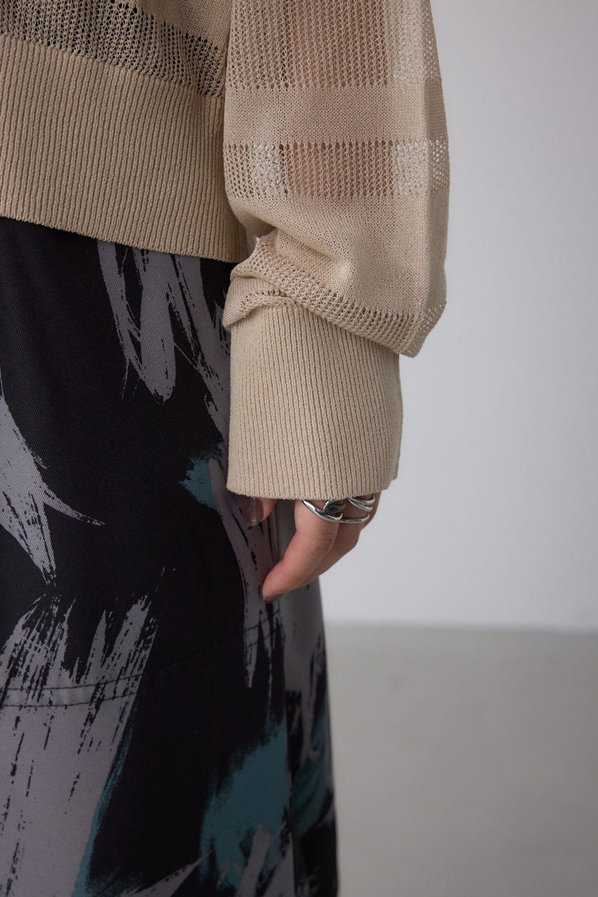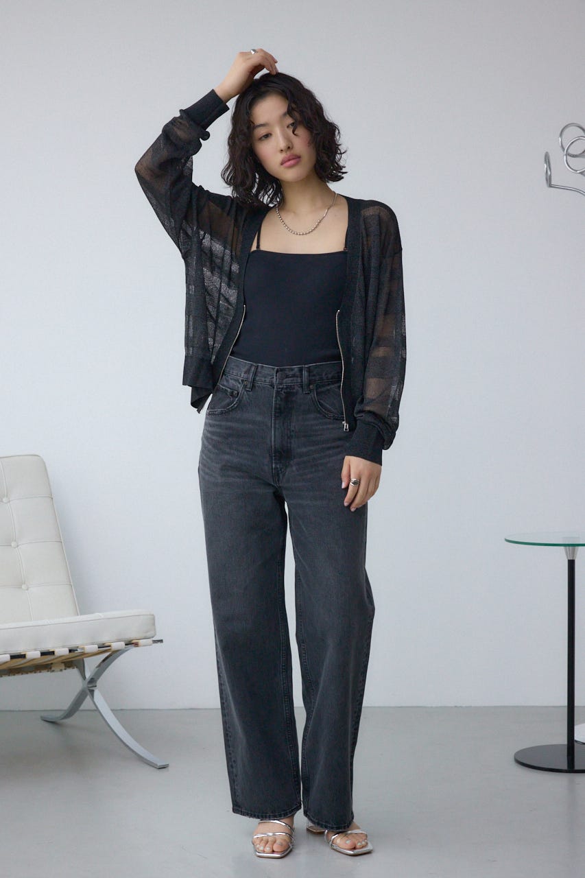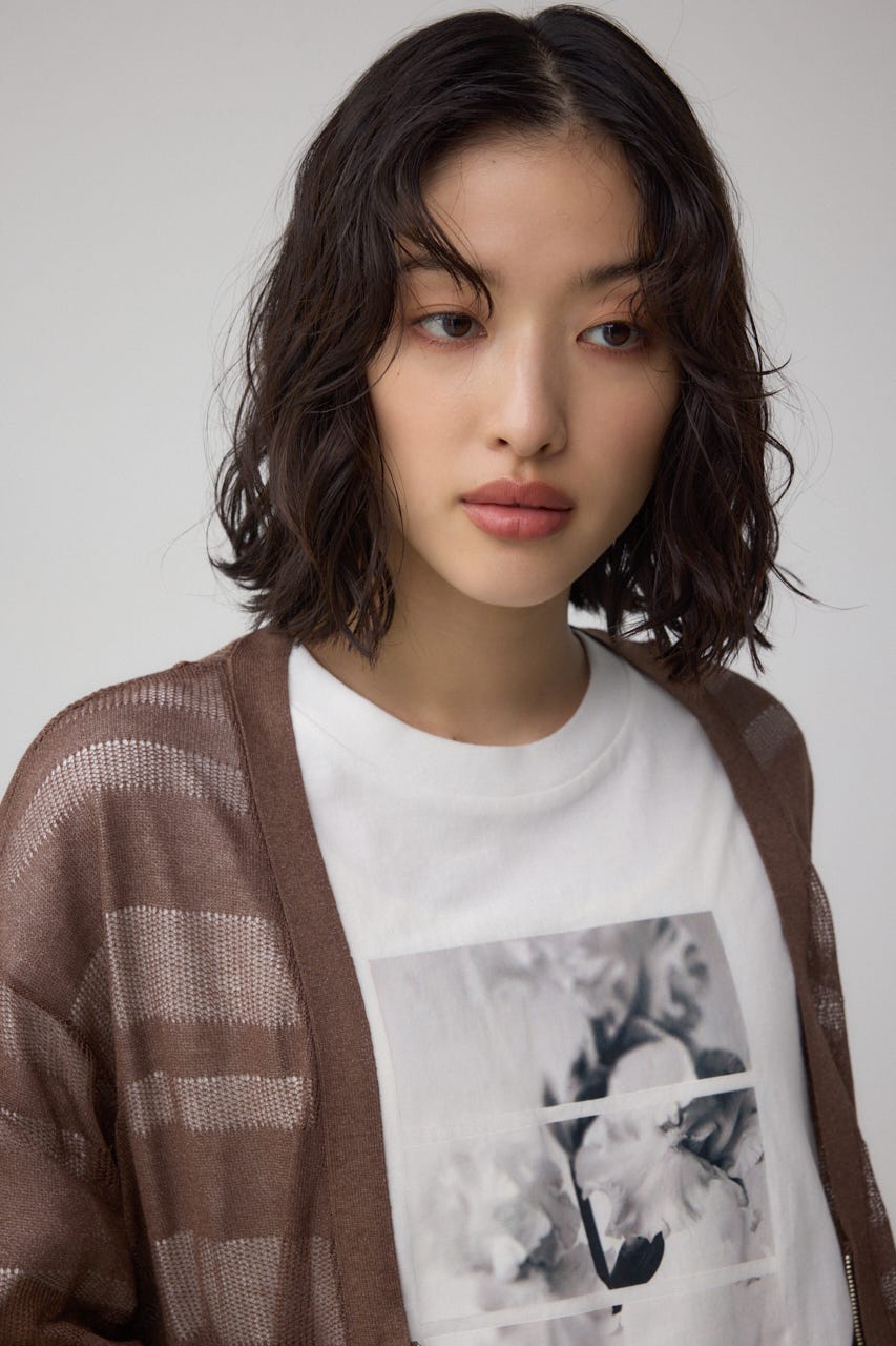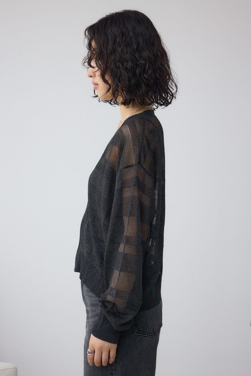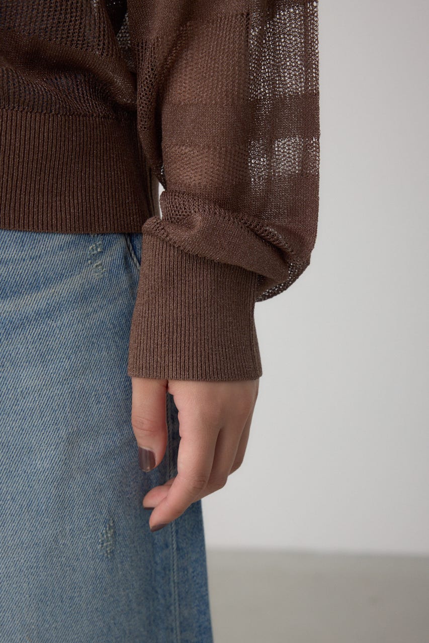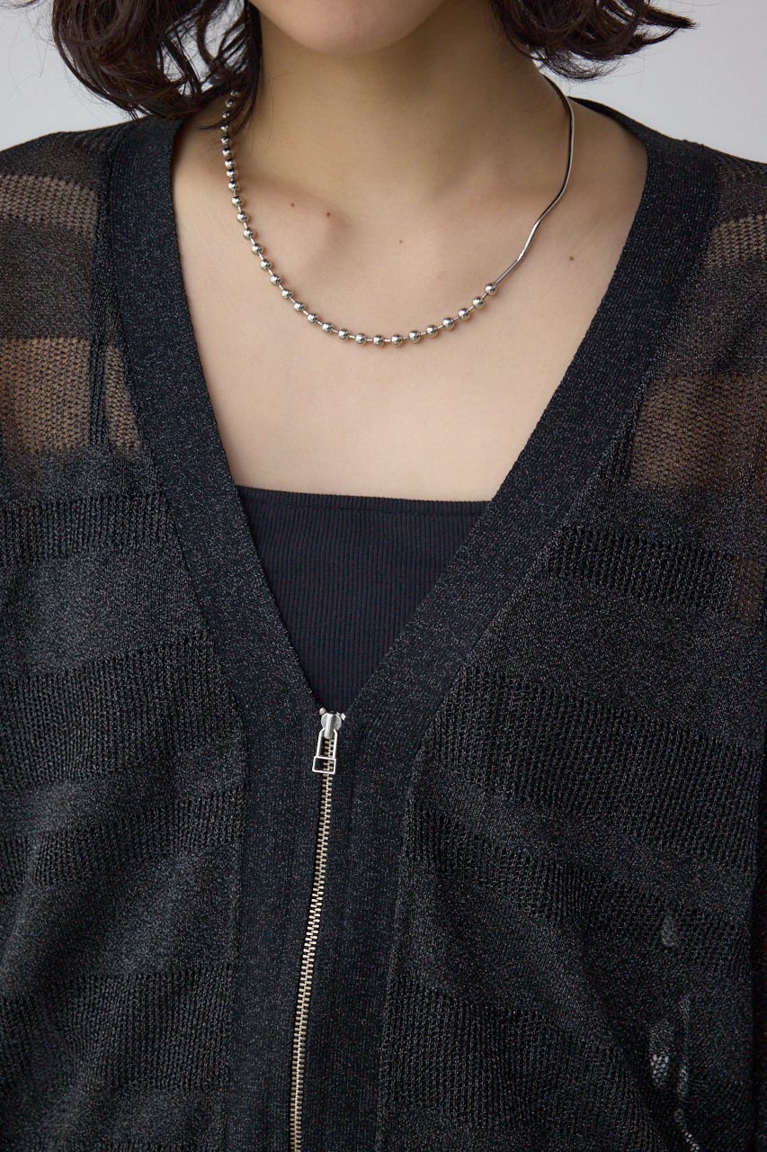 メッシュ編みのシアーボーダー柄のジップカーディガン。