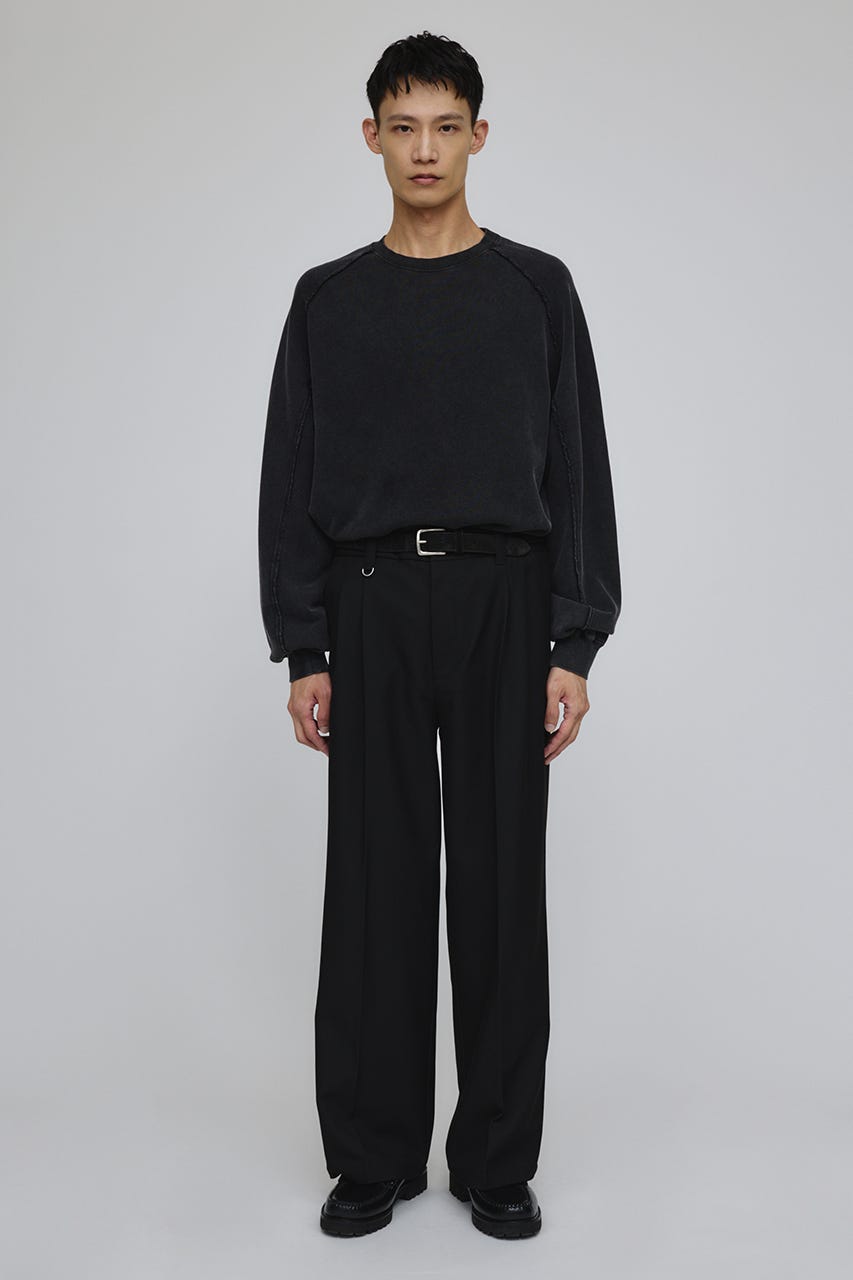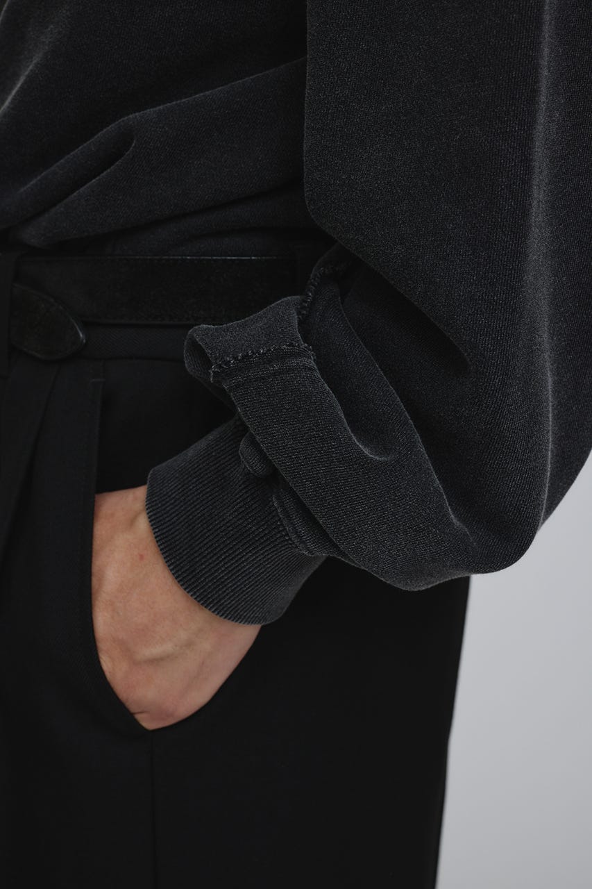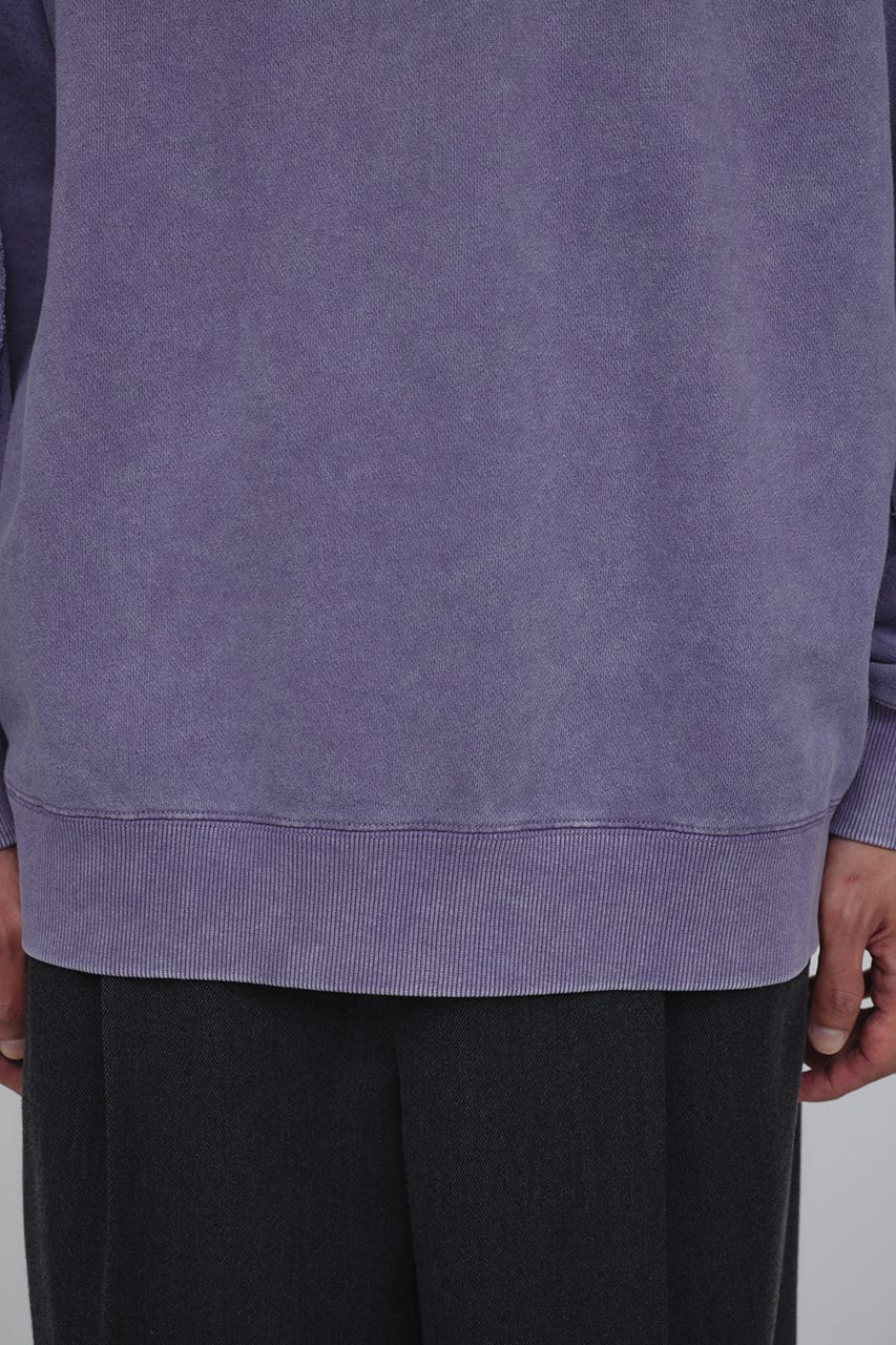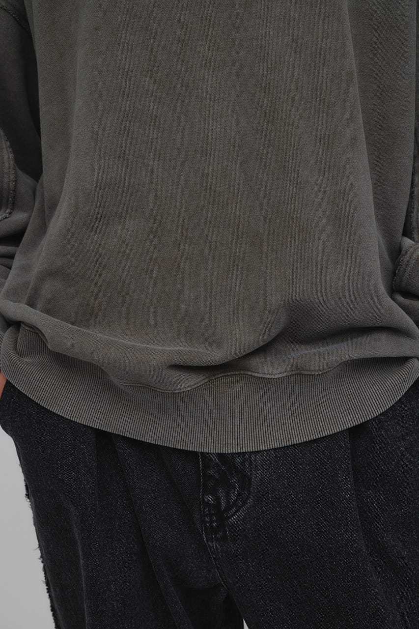 しっかりと厚みのある裏毛のスウェットを硫化染めした後、パウダーブリーチを施したフェード感のあるクルーネックスウェット。