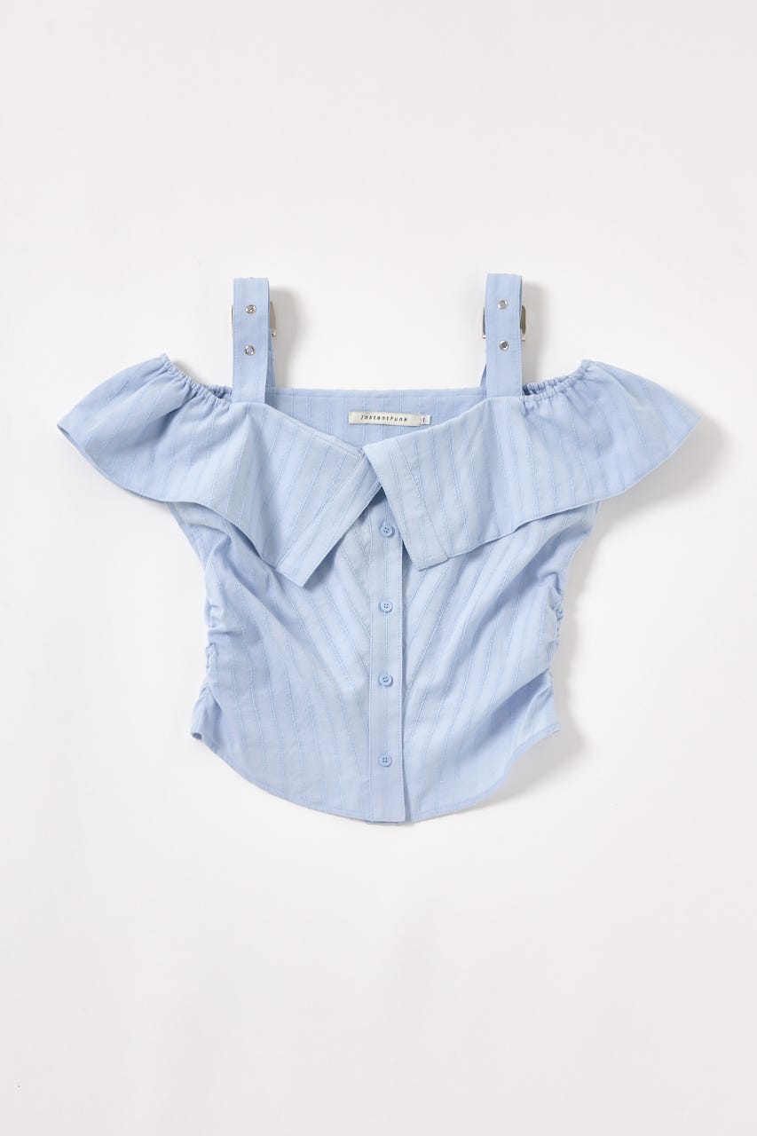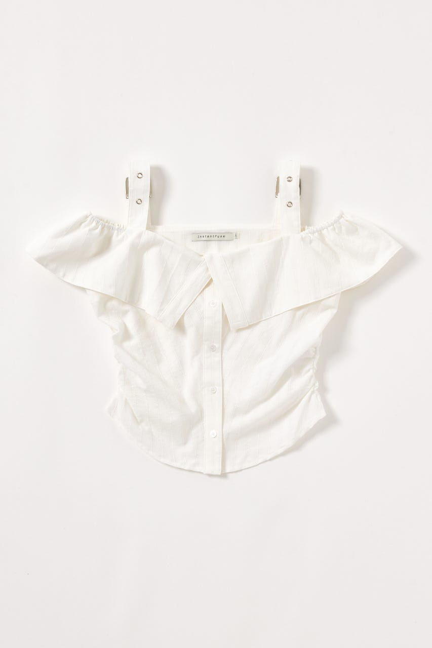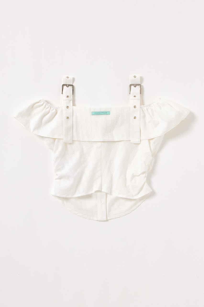 肩紐やバックルがポイントのオフショルダーブラウス。