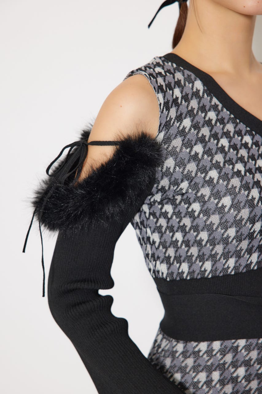 ボリューミーなフェイクファーを肩にあしらい、華やかな千鳥柄を取り入れることで存在感を発揮。