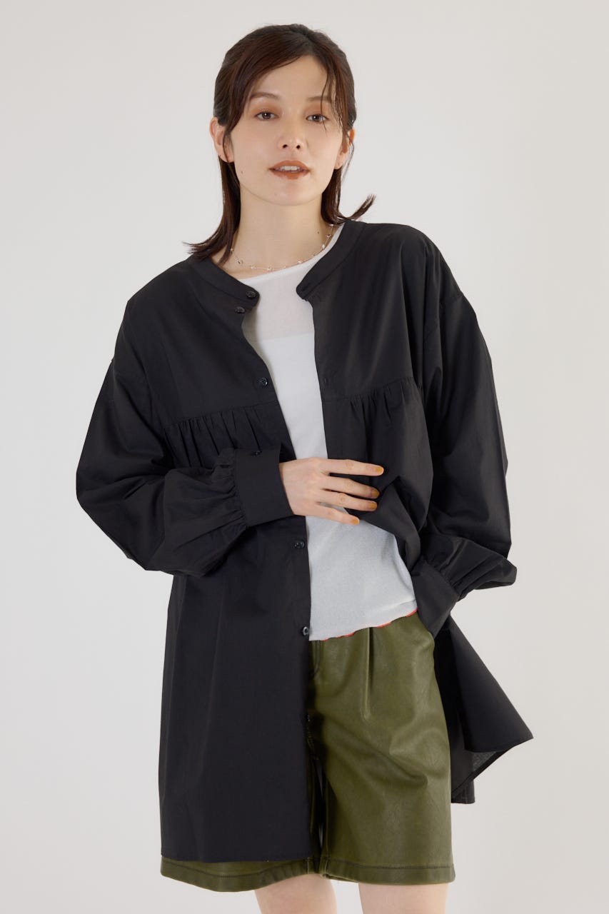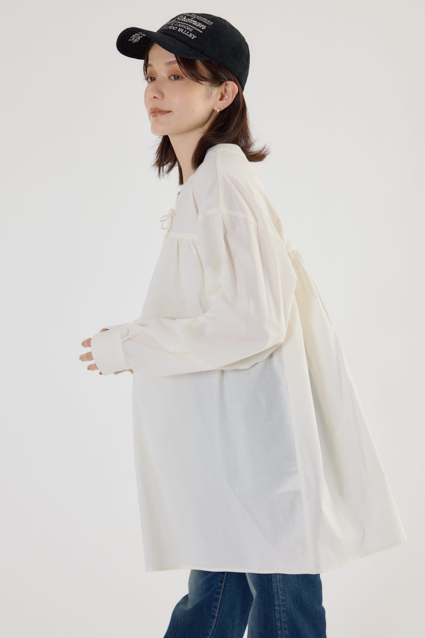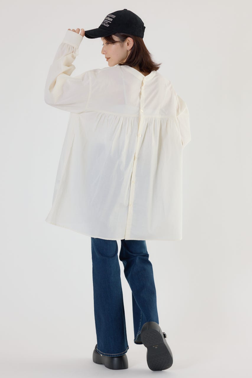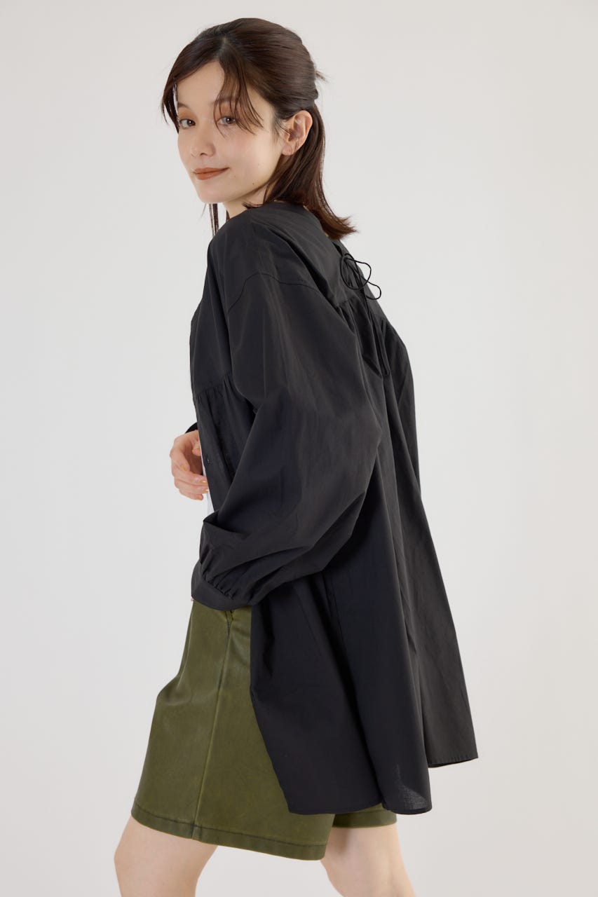 身頃はギャザーでゆったりシルエット、袖口はギャザーを入れたボリュームスリーブです。