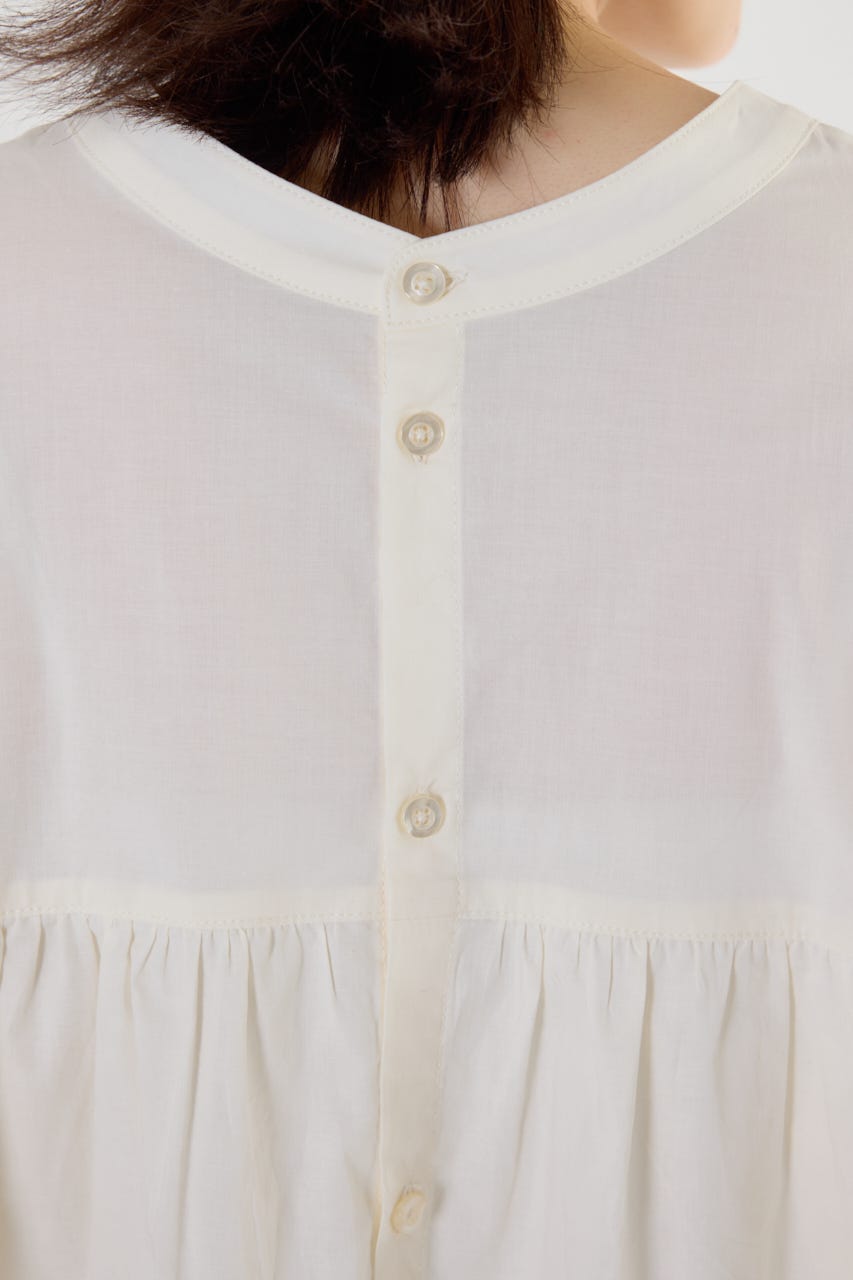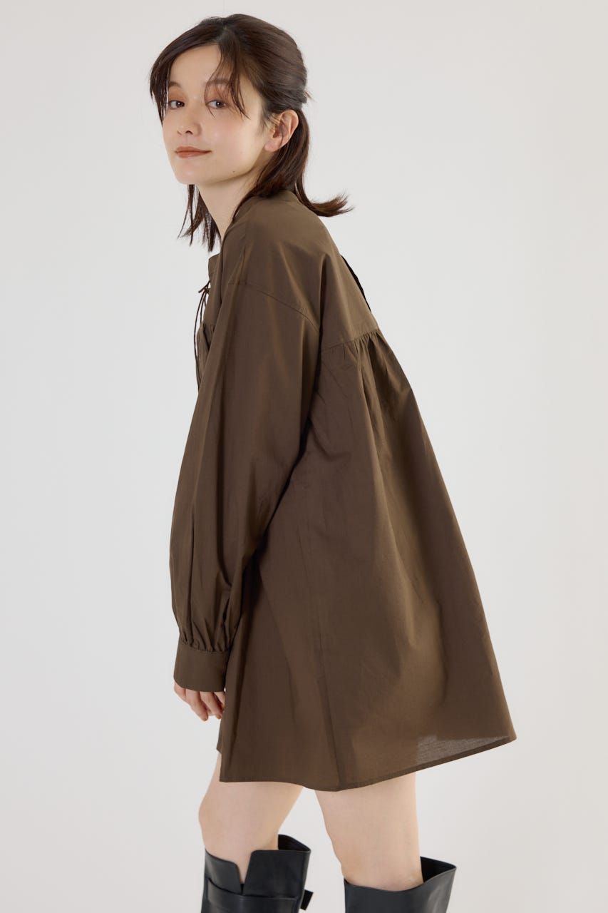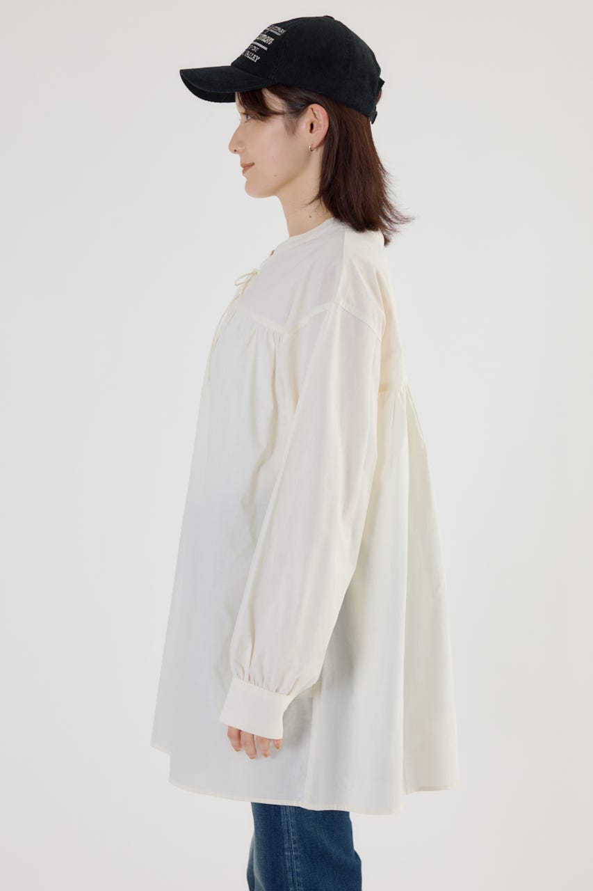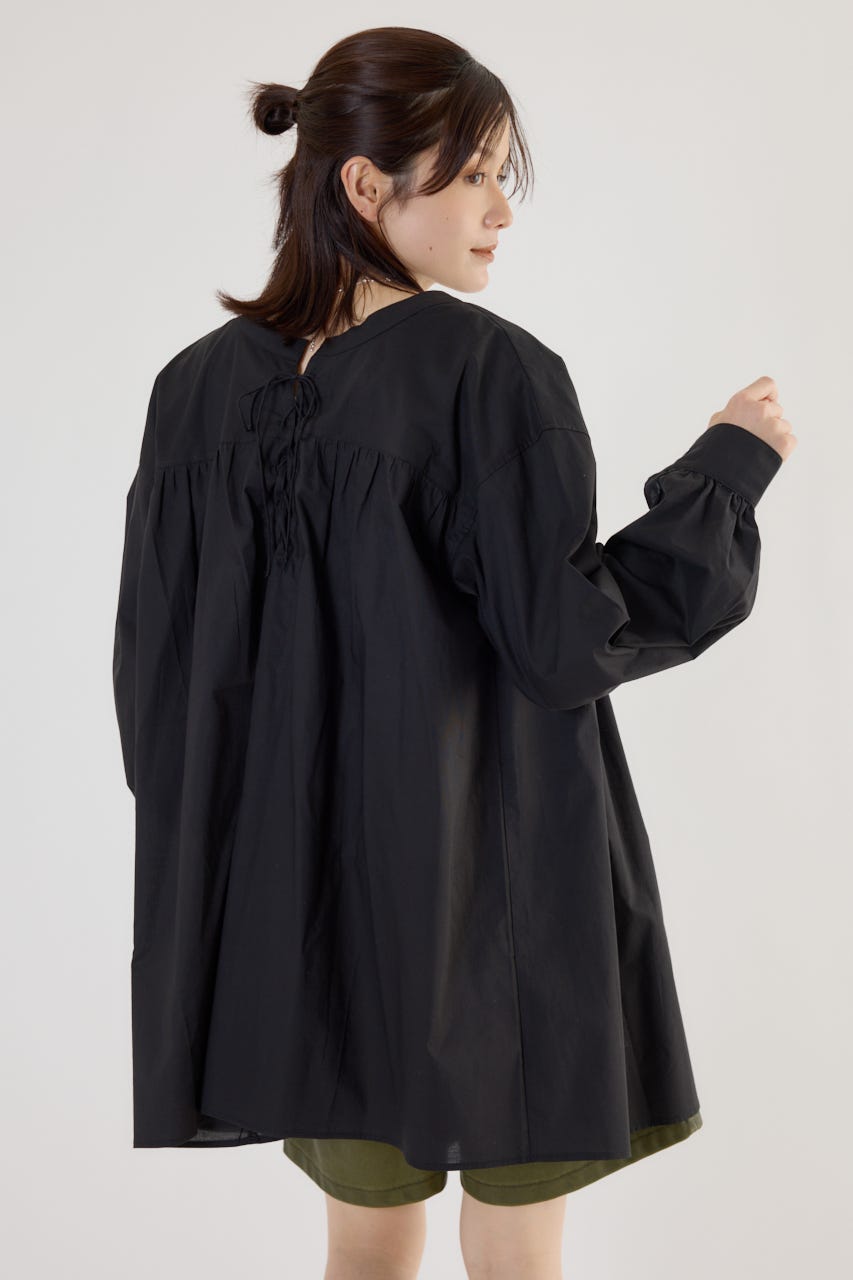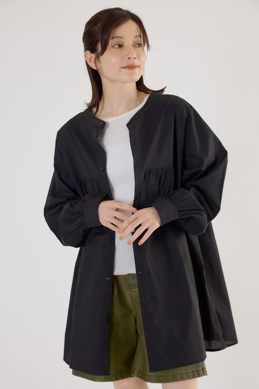 身頃はギャザーでゆったりシルエット、袖口はギャザーを入れたボリュームスリーブです。