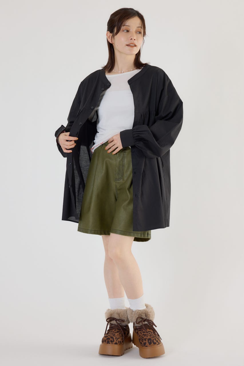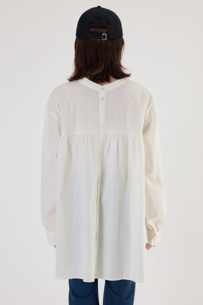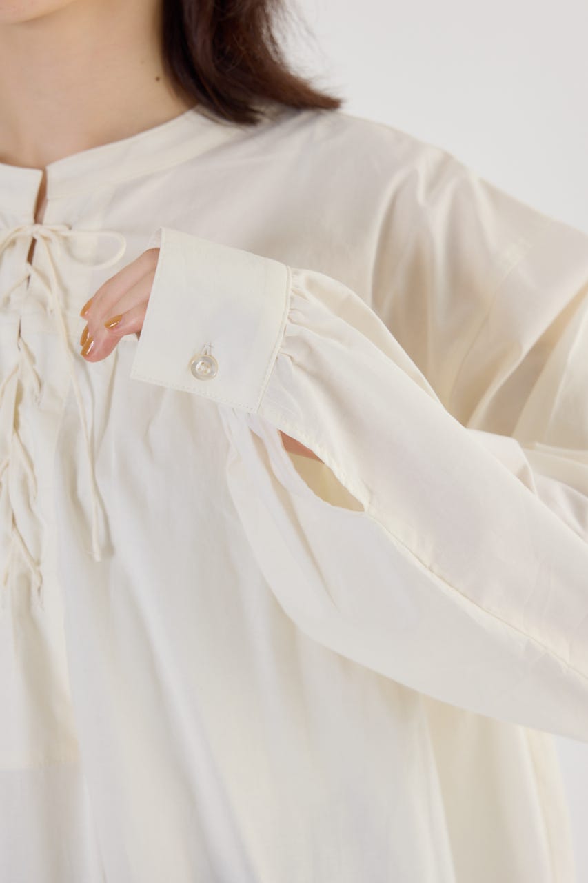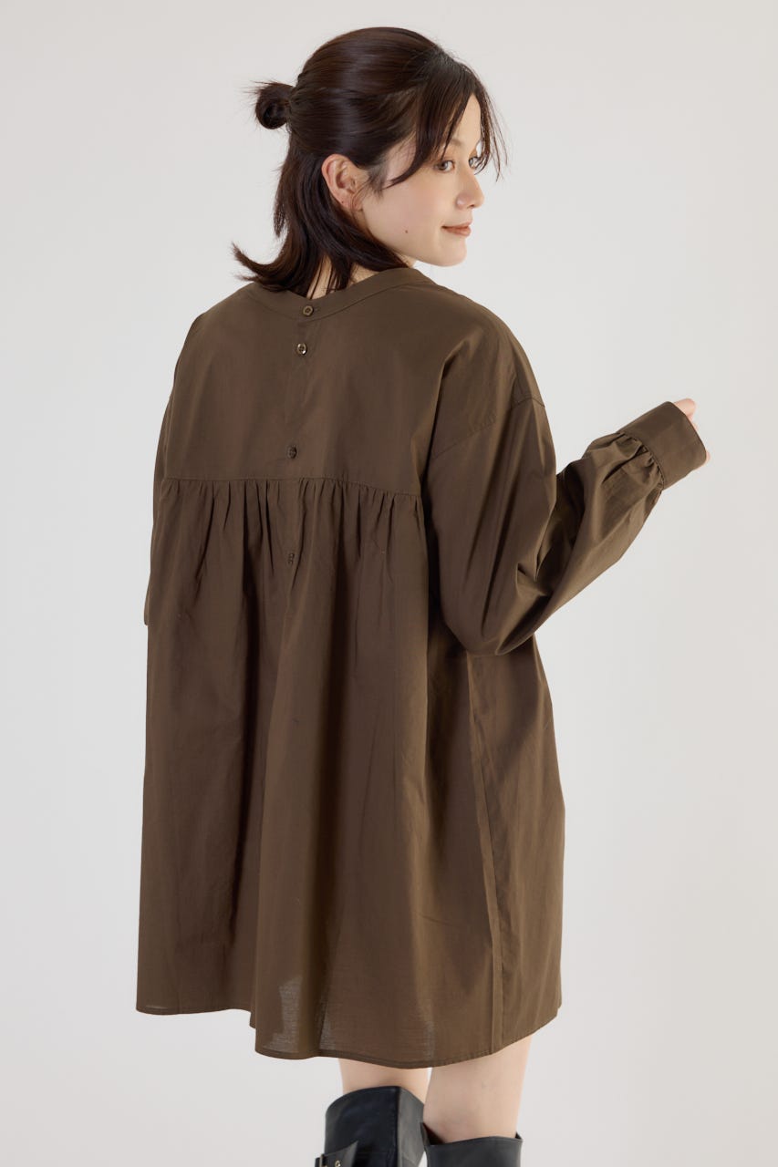 身頃はギャザーでゆったりシルエット、袖口はギャザーを入れたボリュームスリーブです。